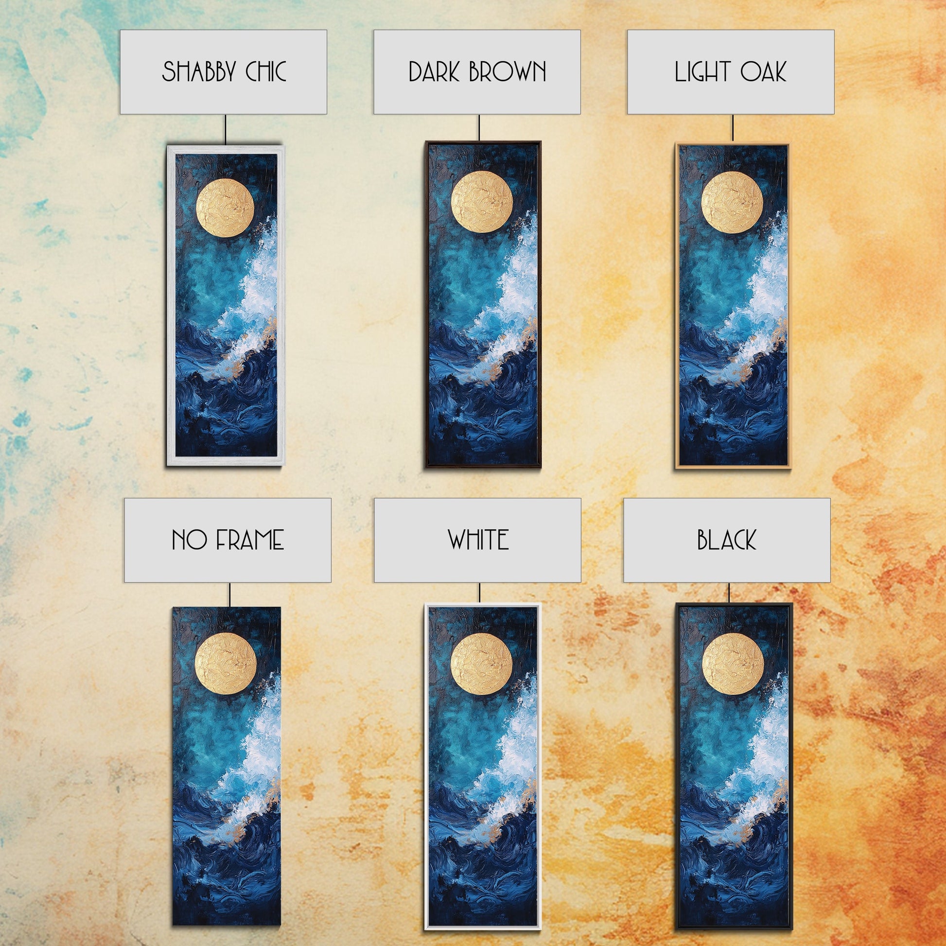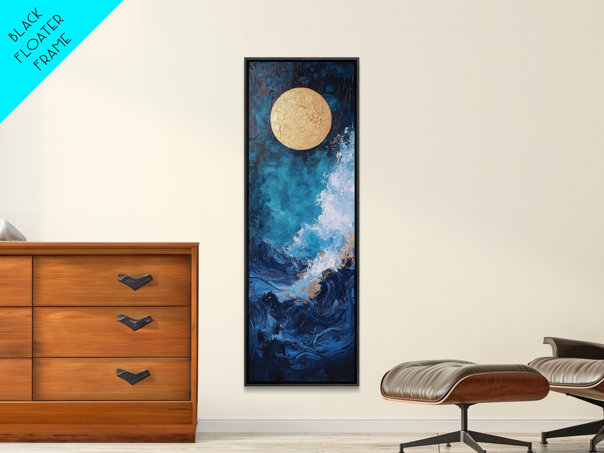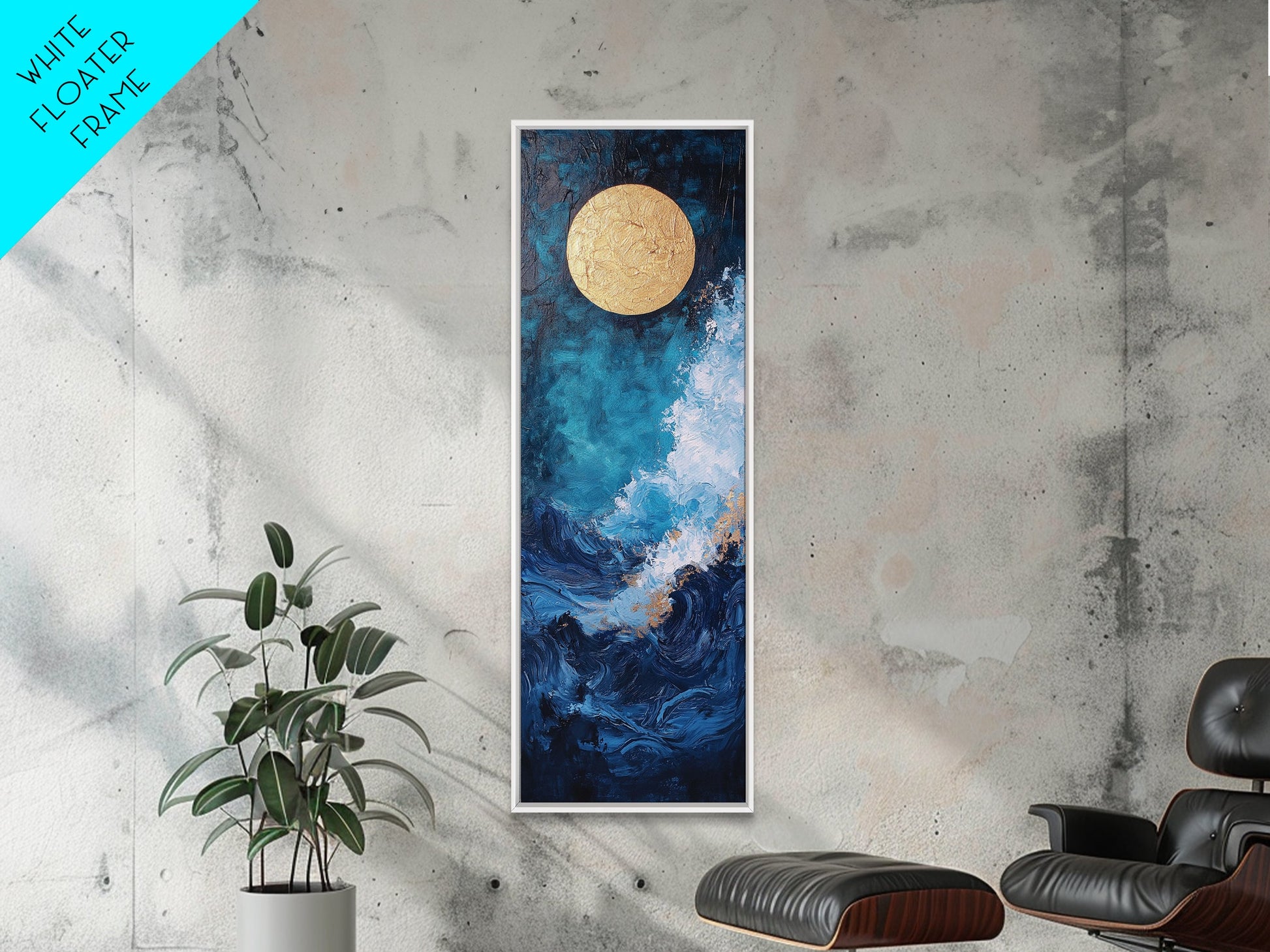 Golden Moon, crashing waves, nautical painting, moody art, coastal wall art, wabi sabi art, framed canvas print, ocean painting