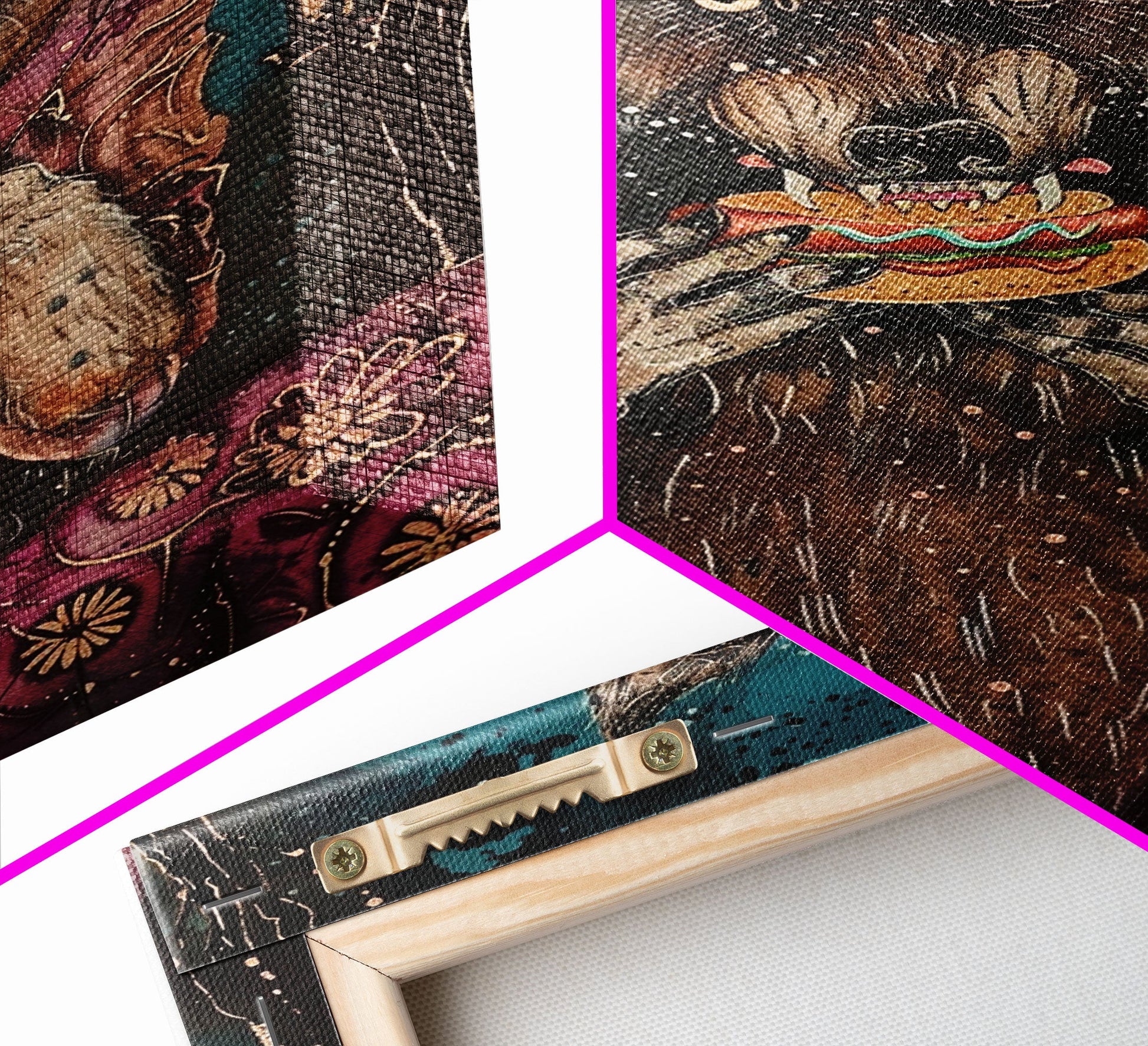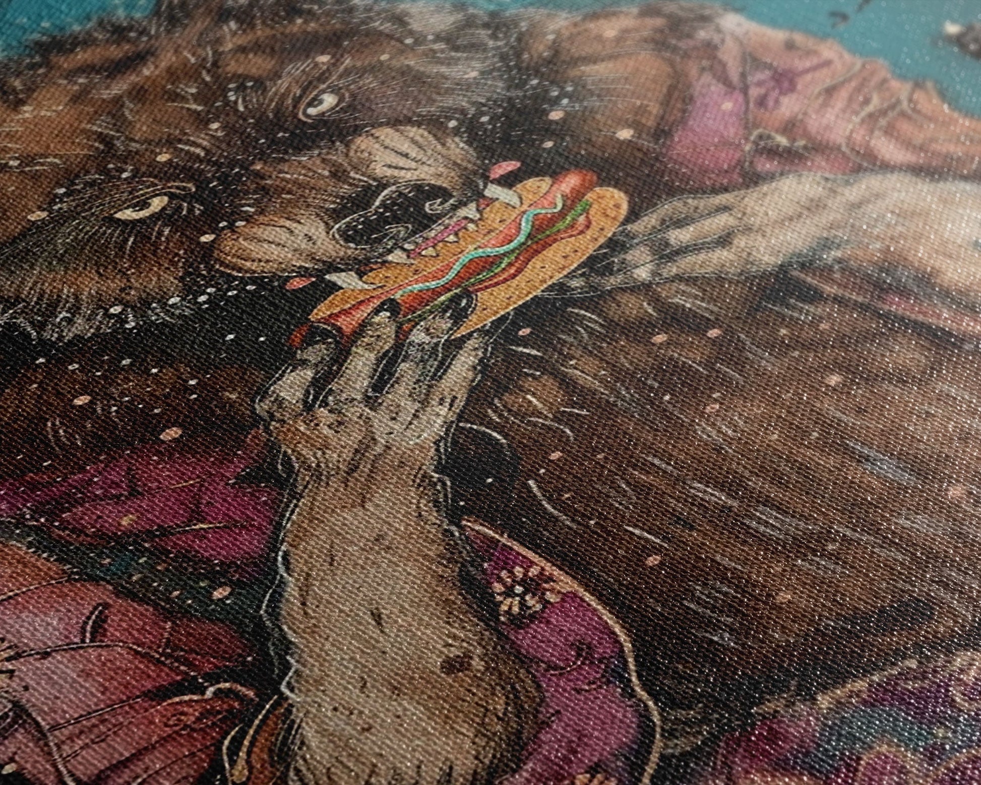 Halloween Werewolf Enjoying Hotdog, Framed Canvas Print, Wall Art, Home Decor, Spooky Artwork, Fantasy Decor, Halloween Decor, Holiday Gift