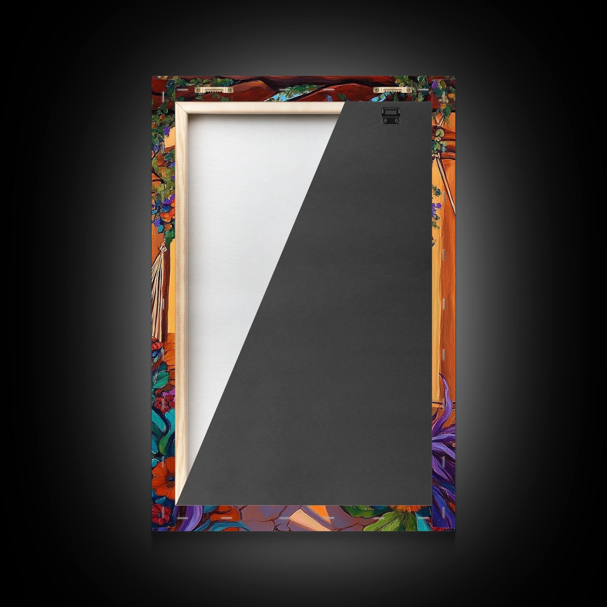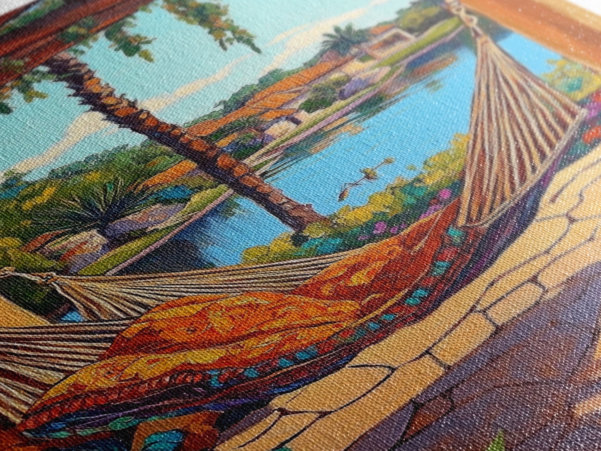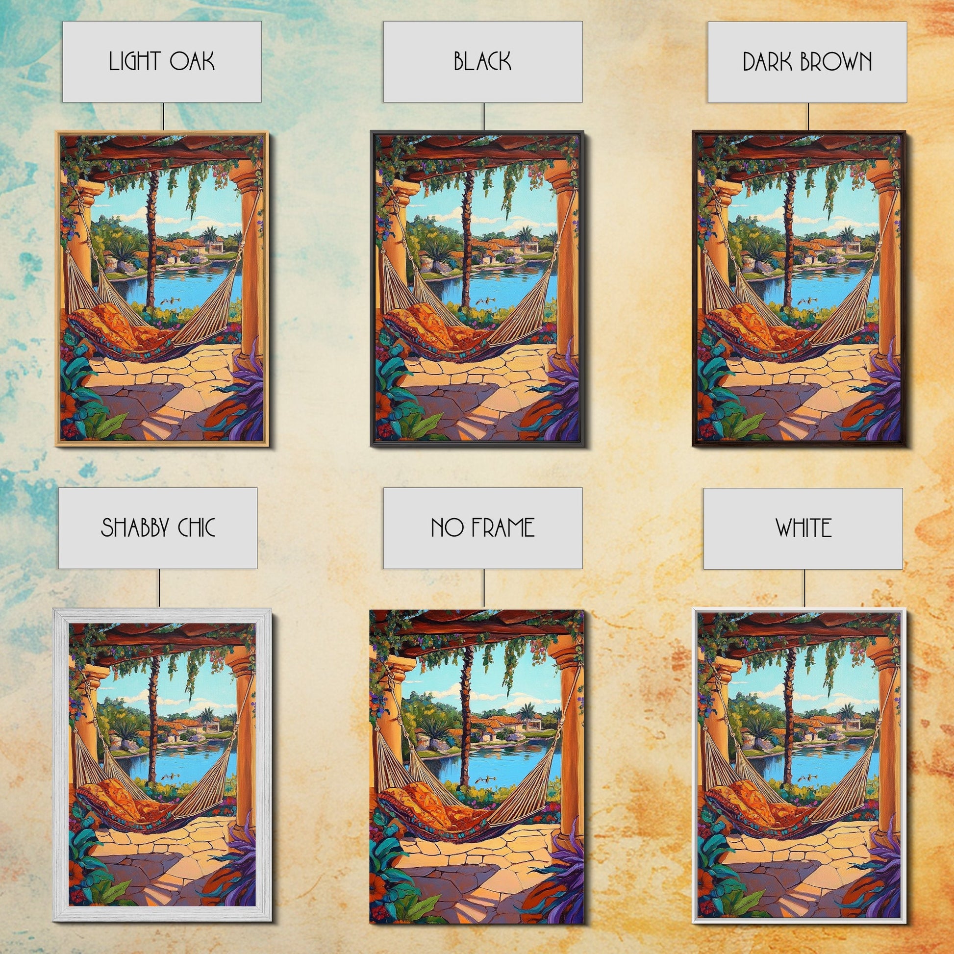 Hammock Patio, Relax, Lake, Framed Canvas Print, bohemian outdoor decor, tropical vacation art, summer patio vibe, living room wall art