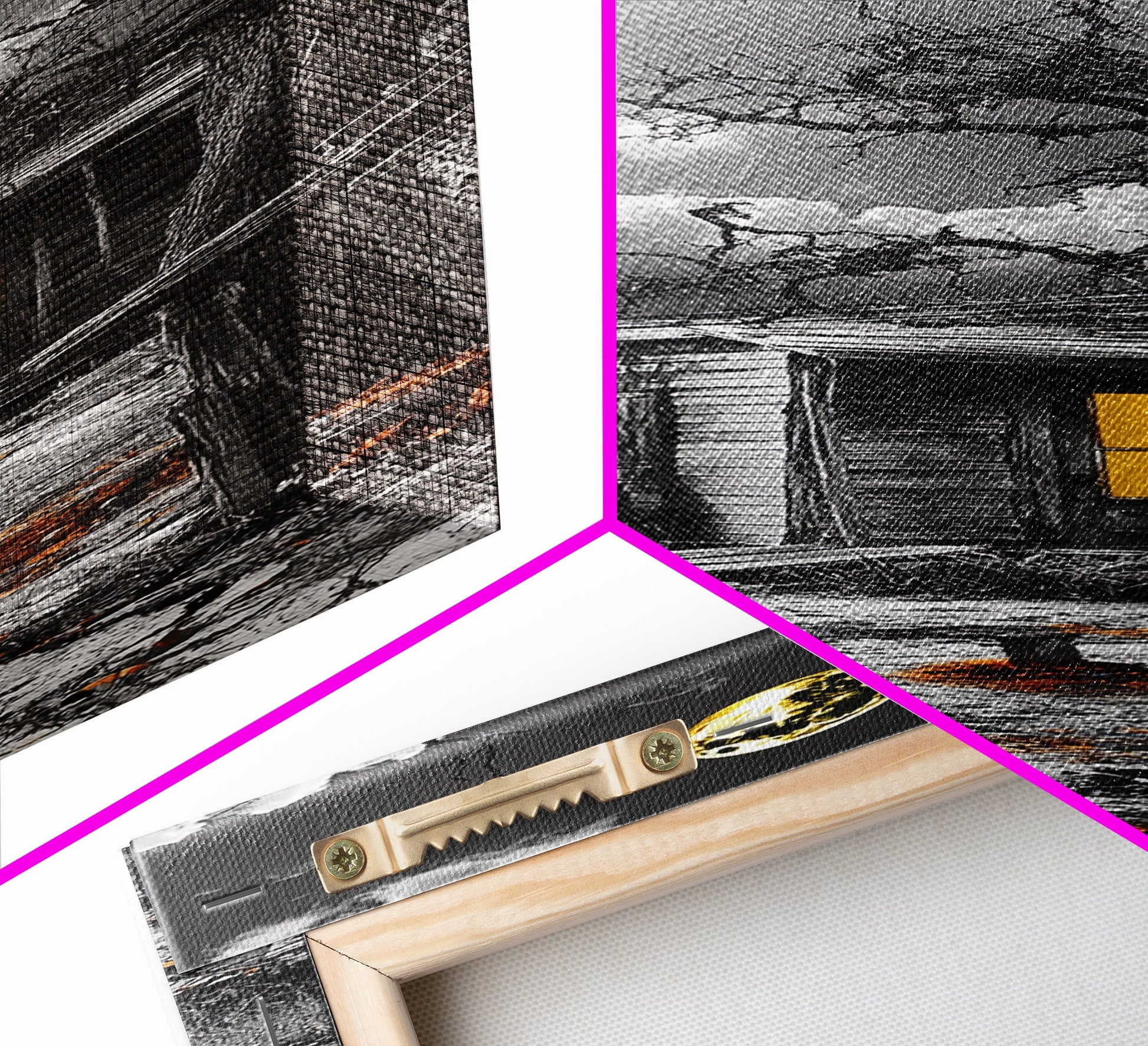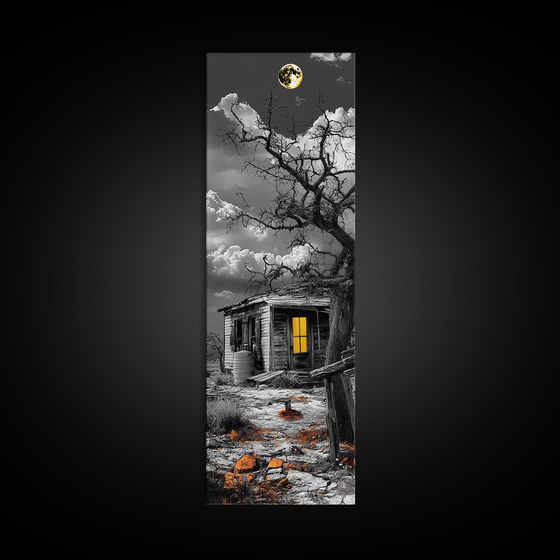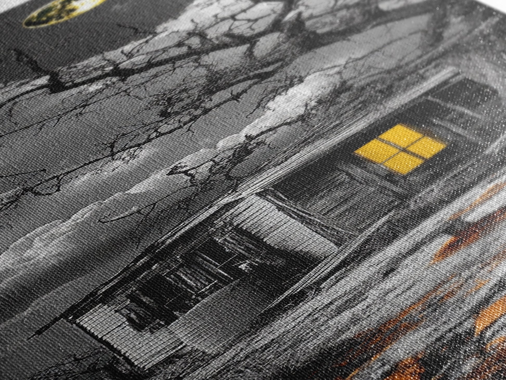 Haunted Cabin, Yellow Light, Full Moon, Framed Canvas Print, Halloween Wall Art, Gothic Decor, Spooky Home Accent, Fall Vibes