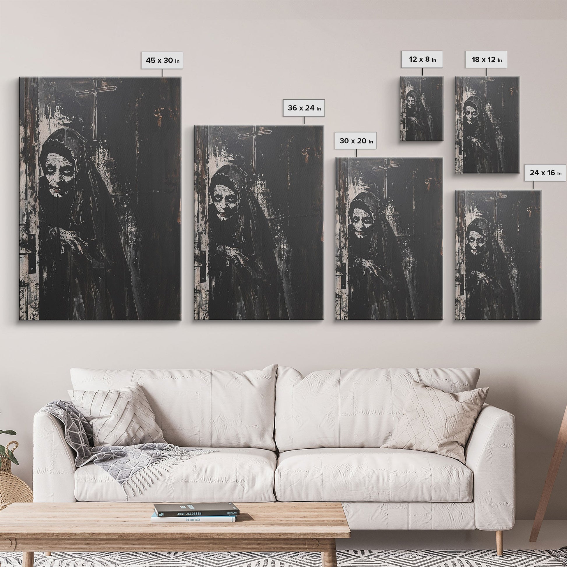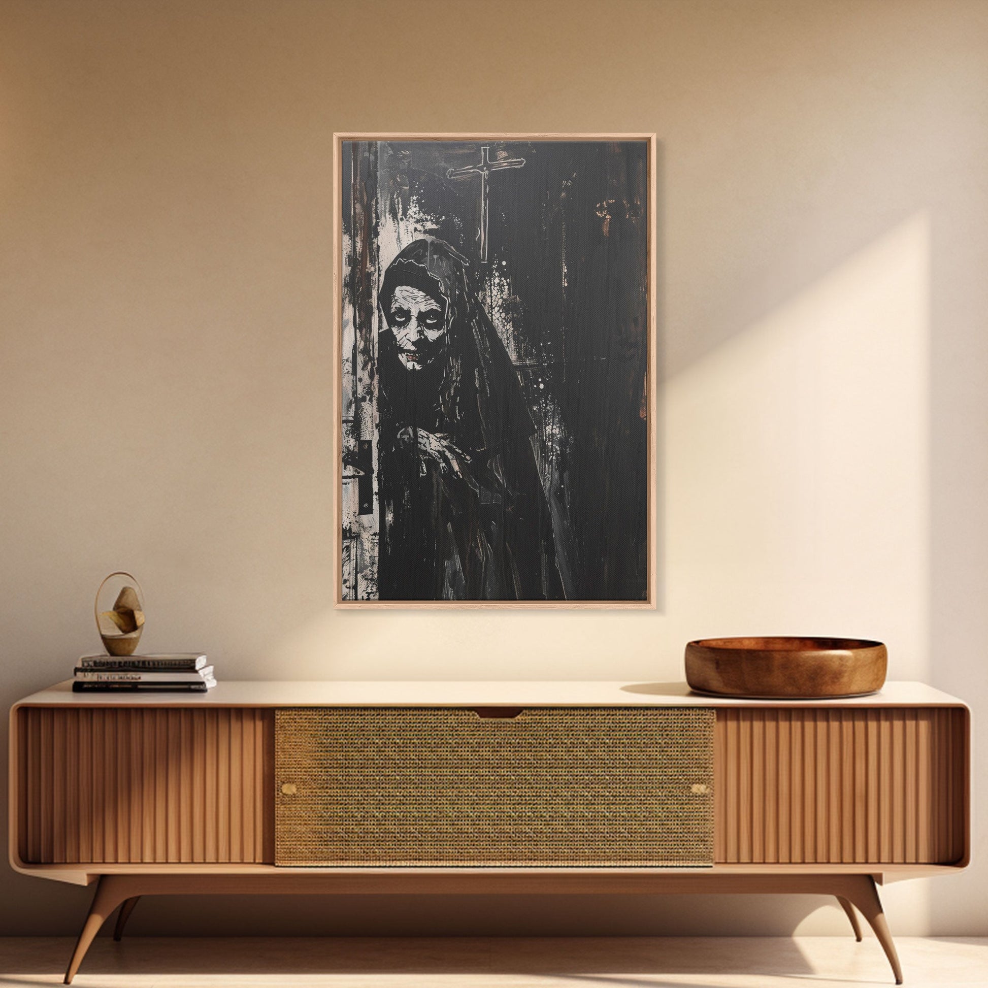 Haunted Nun with Eerie Expression, Framed Canvas Print, Gothic Halloween Art, Spooky Religious Decor, Scary Nun Painting, Gothic Home Art