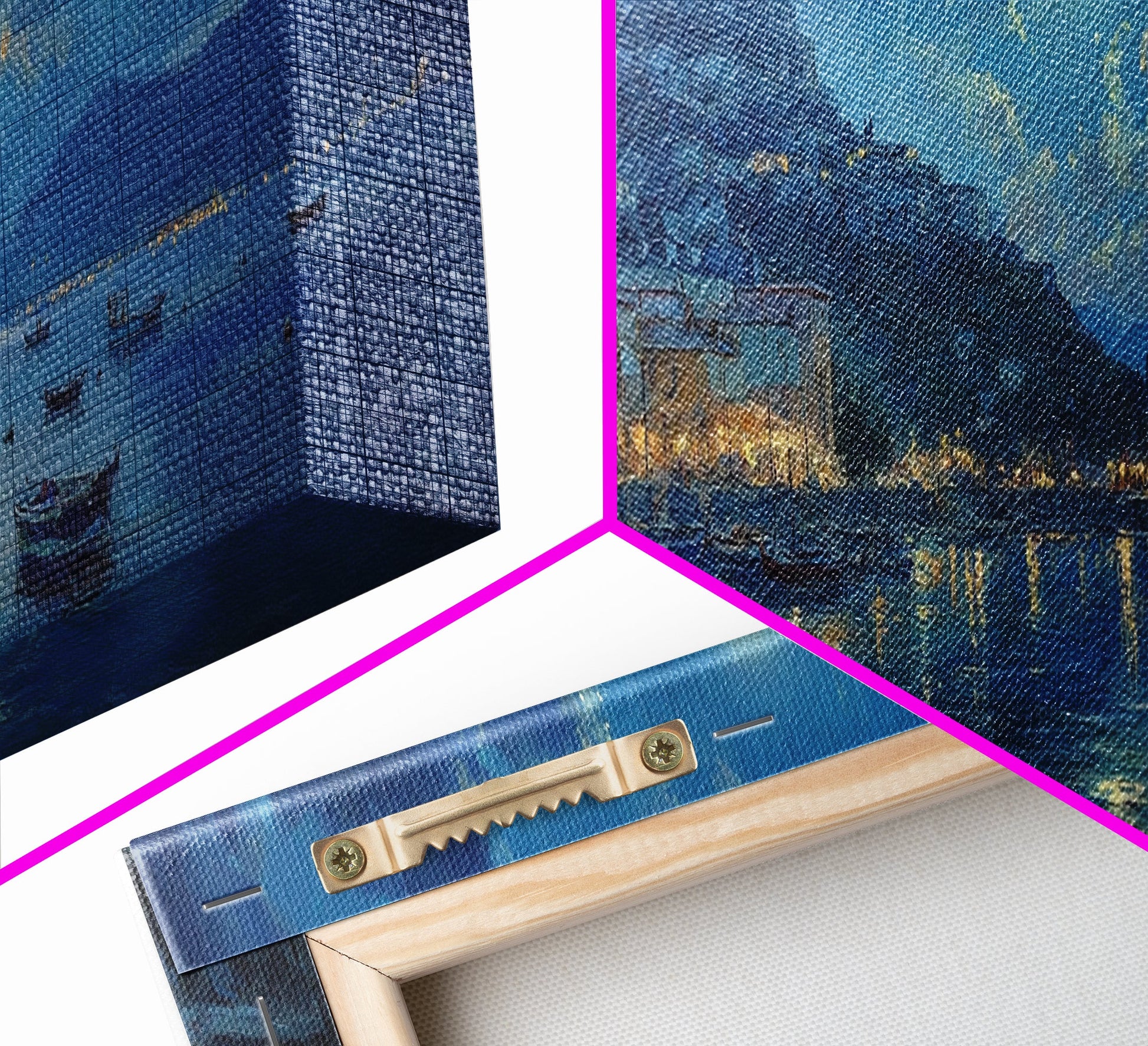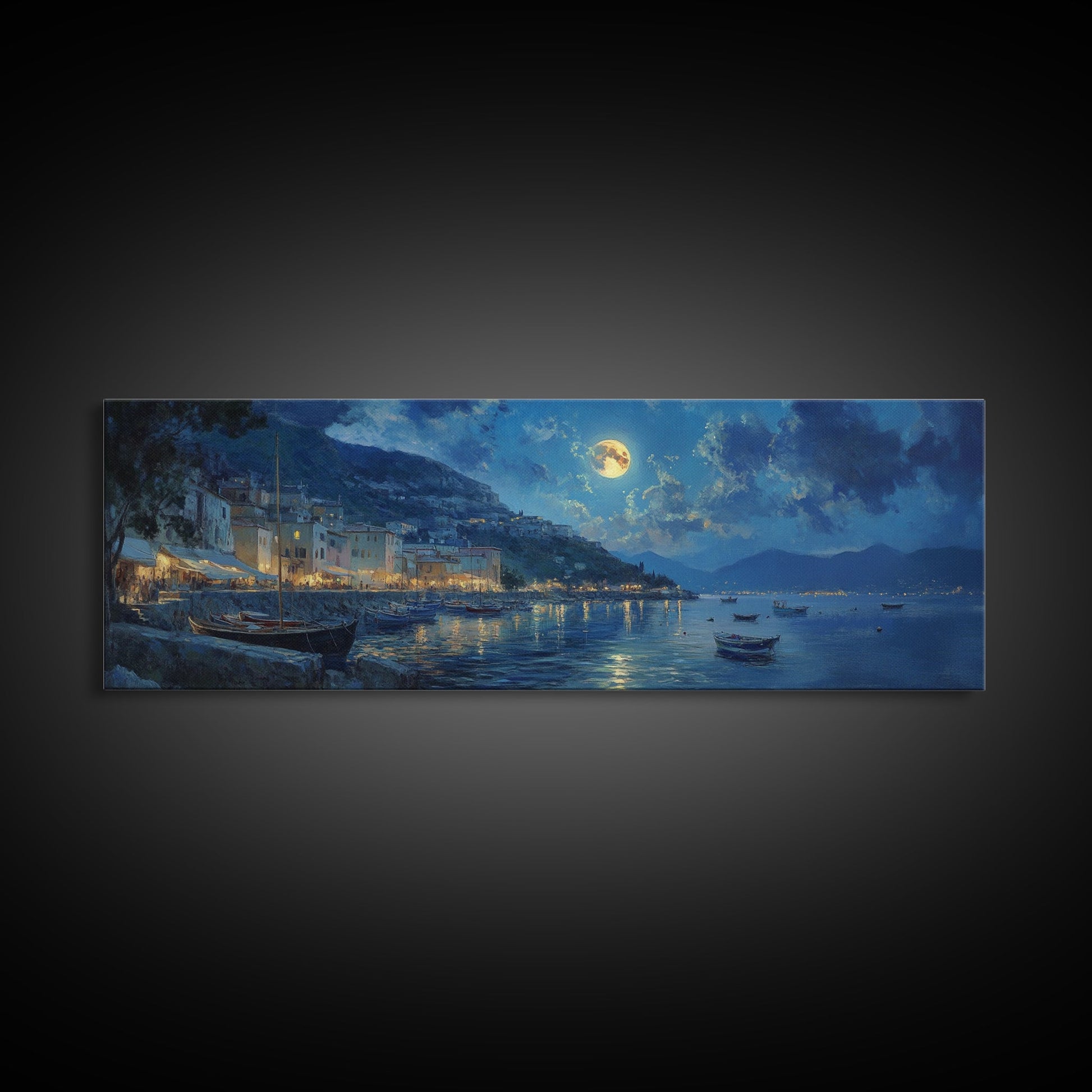 Horizontal Oil Painting Print - Italy At Night - Portofino Wall Art - Horizontal Panoramic Print - Full Moon Painting