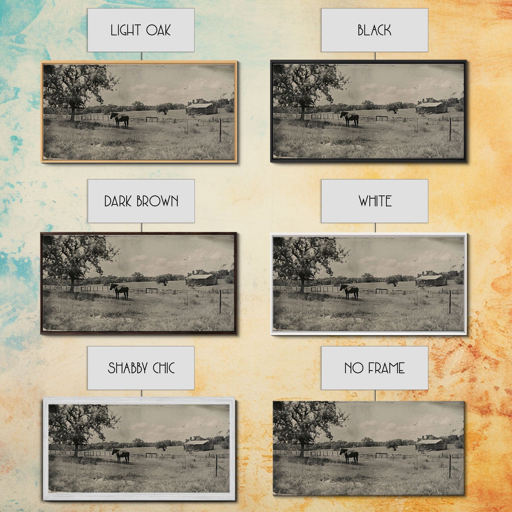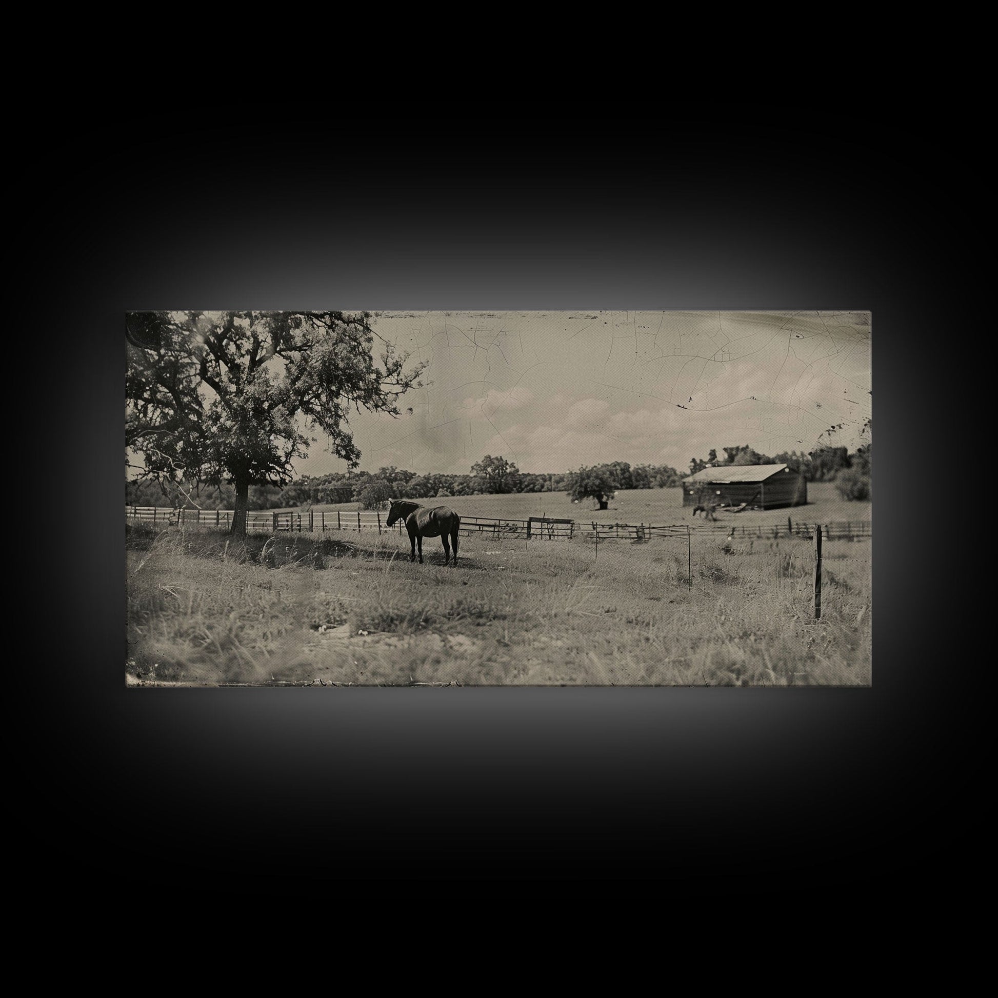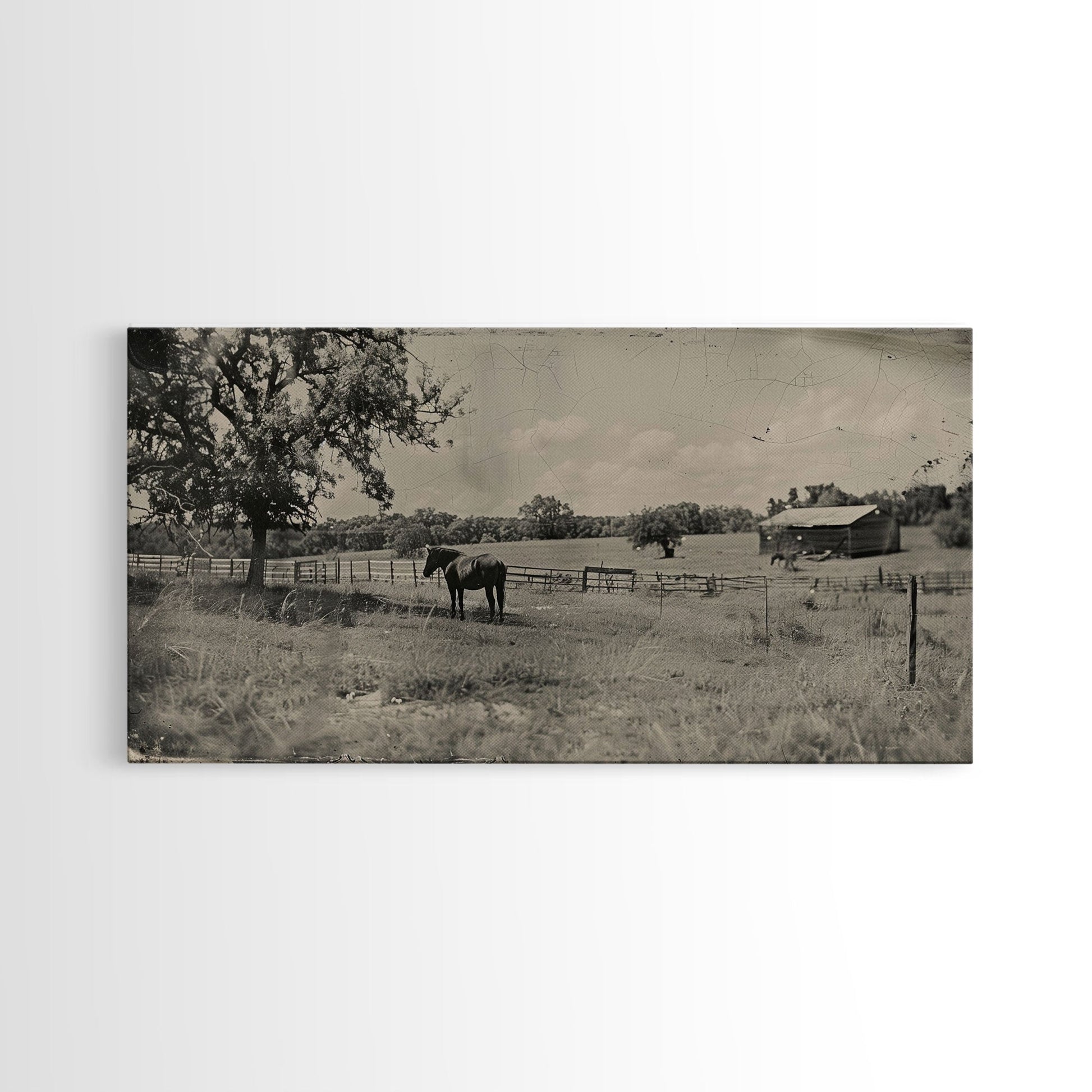 Horse Grazing in Pasture by Farmhouse, Antique Style Framed Canvas Print Country Living Room Decor, Rustic Farmhouse Wall Art, Nature Scene