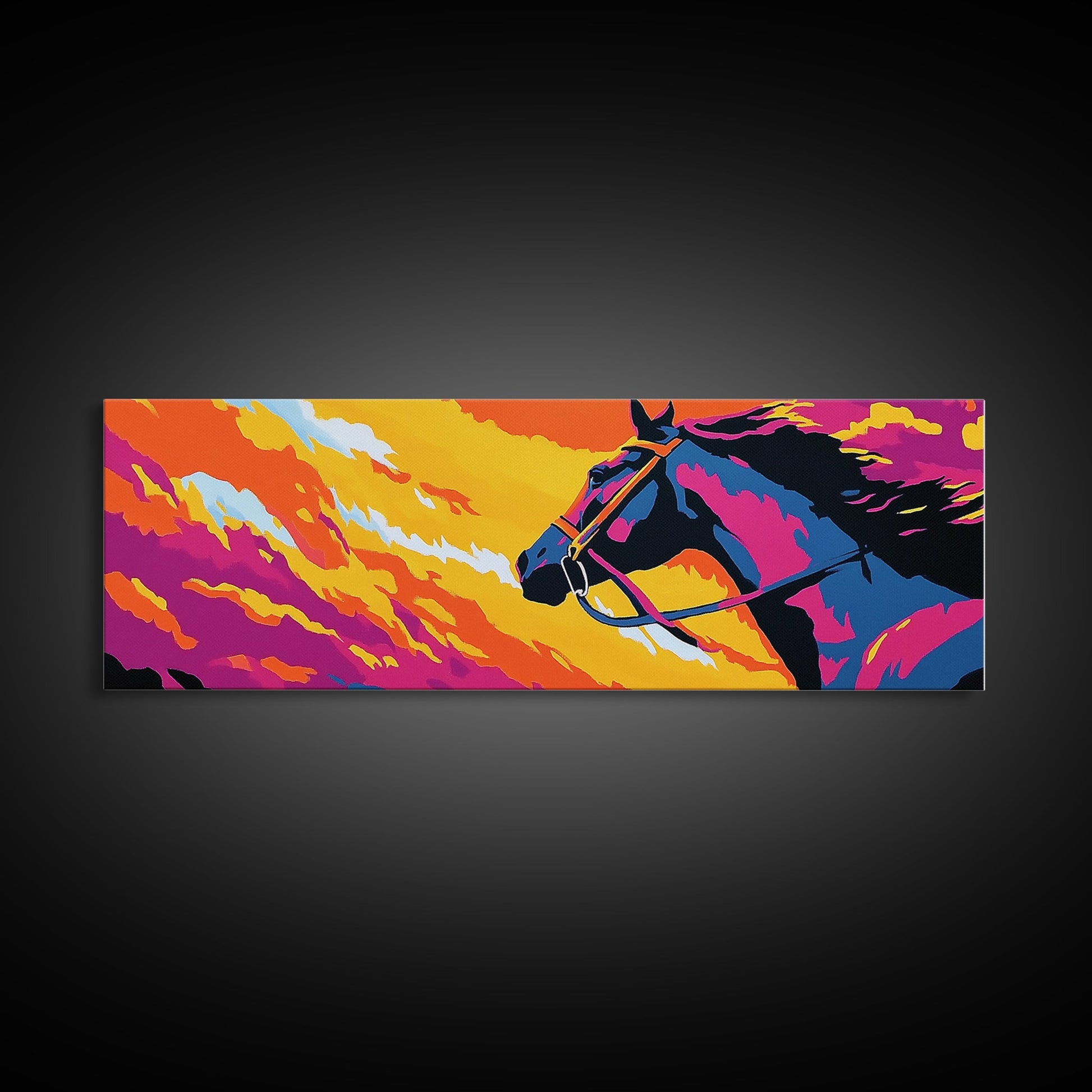 Horse silhouette, sunset, pink orange wall art, colorful equestrian, western art, extra wide art, framed canvas print, panoramic painting