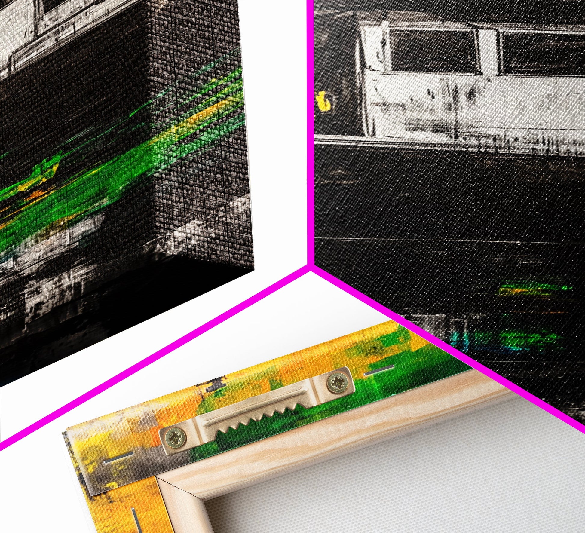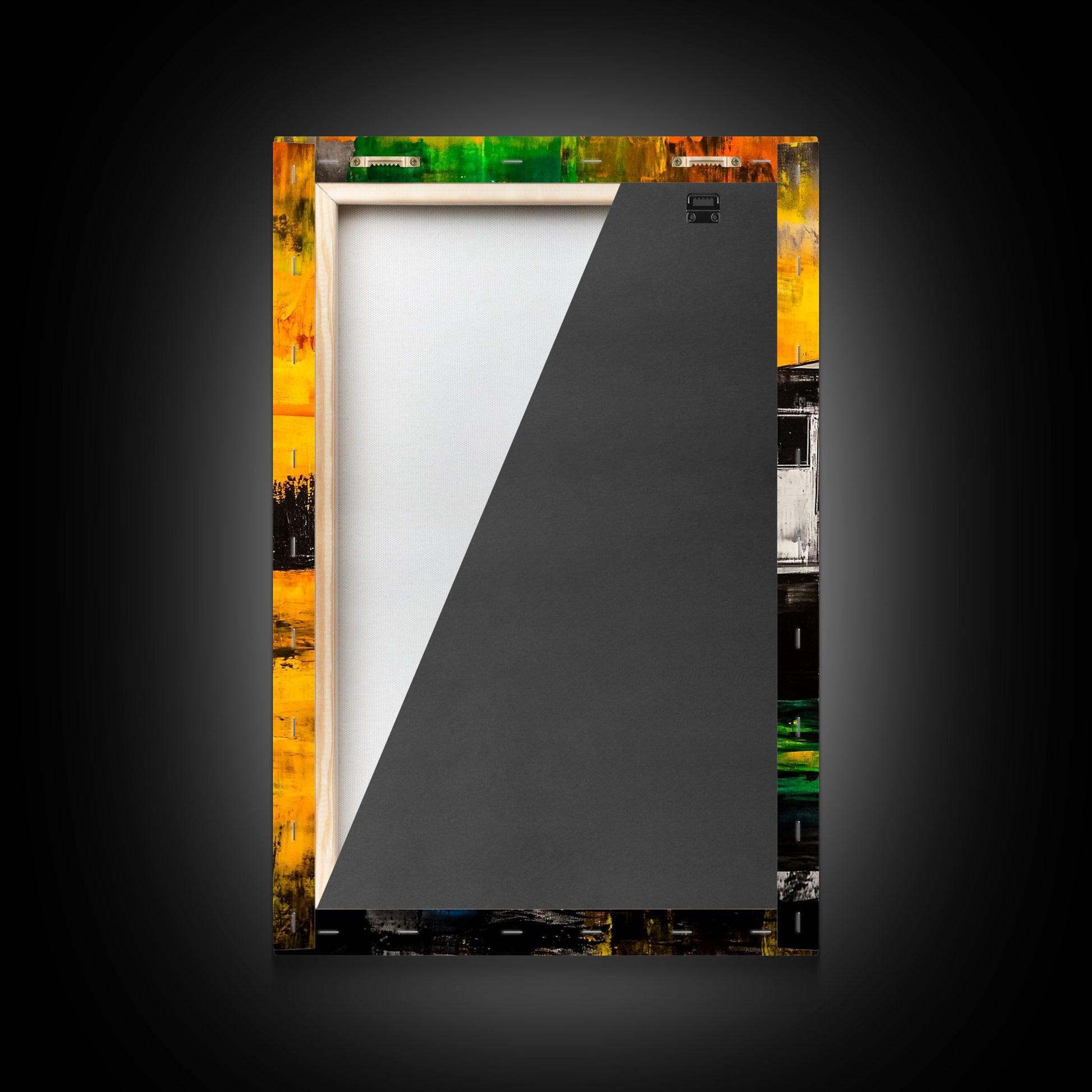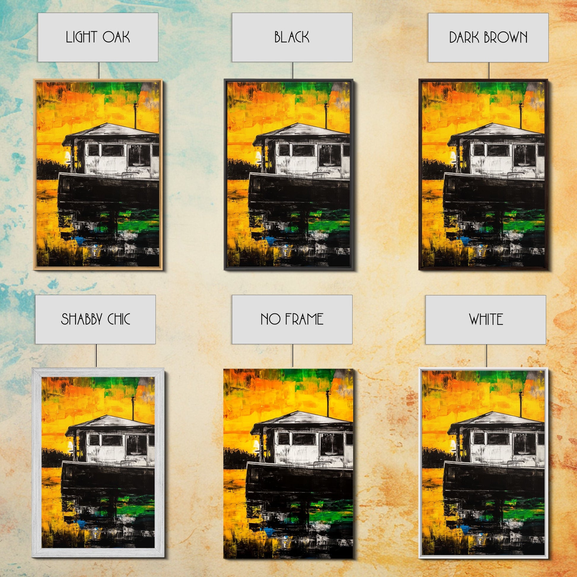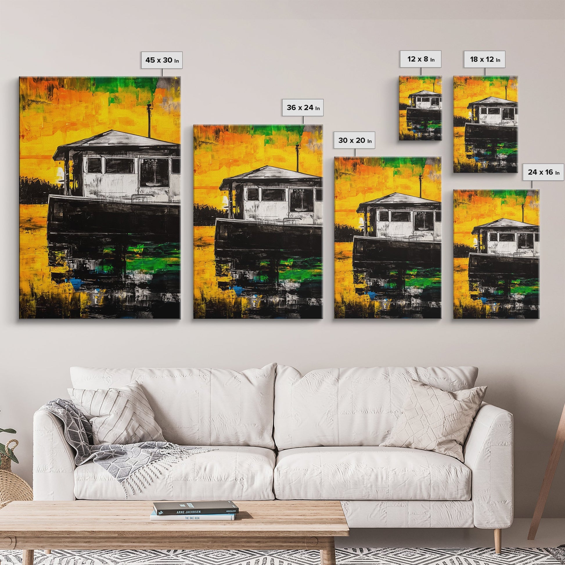 Houseboat Sunset, Coastal Painting, Warm Tones, Abstract Art, Framed Canvas Print, Living Room Wall Art, Waterfront Decor, Ocean Art