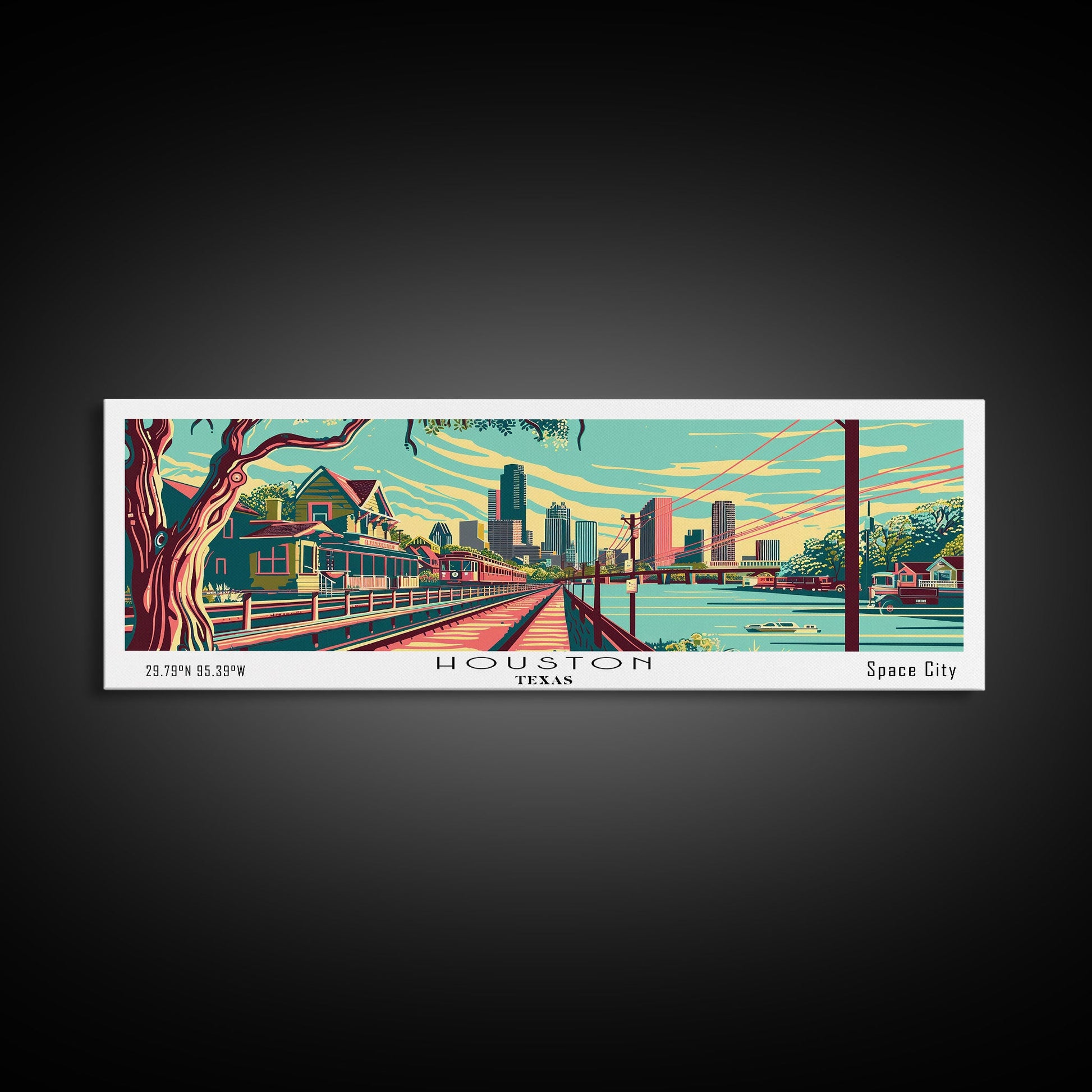 Houston Texas Panoramic Travel Poster Framed Canvas Print, Mid Century Modern Art, Pop Art Style, Wall Art, Living Room Decor, Home Decor, Retro Style Art