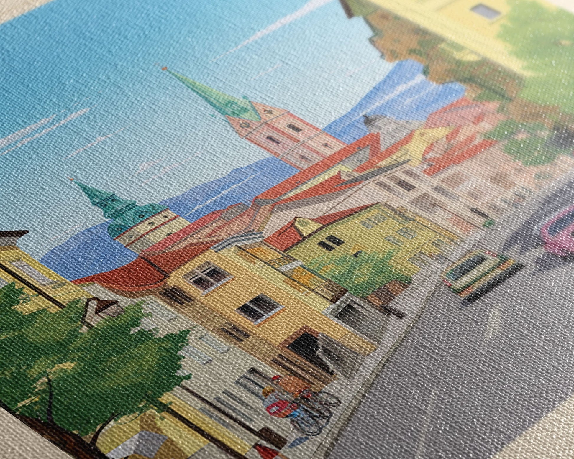 Most of our canvases are made in the USA, with the exception of canvases ordered with the light oak unstained frames, and any large canvases (24x48, 30x60, 16x48 and 20x60) ordered WITH a frame. These are temporarily made in and shipped from Europe, while we try to find a more consistent supplier in the USA.