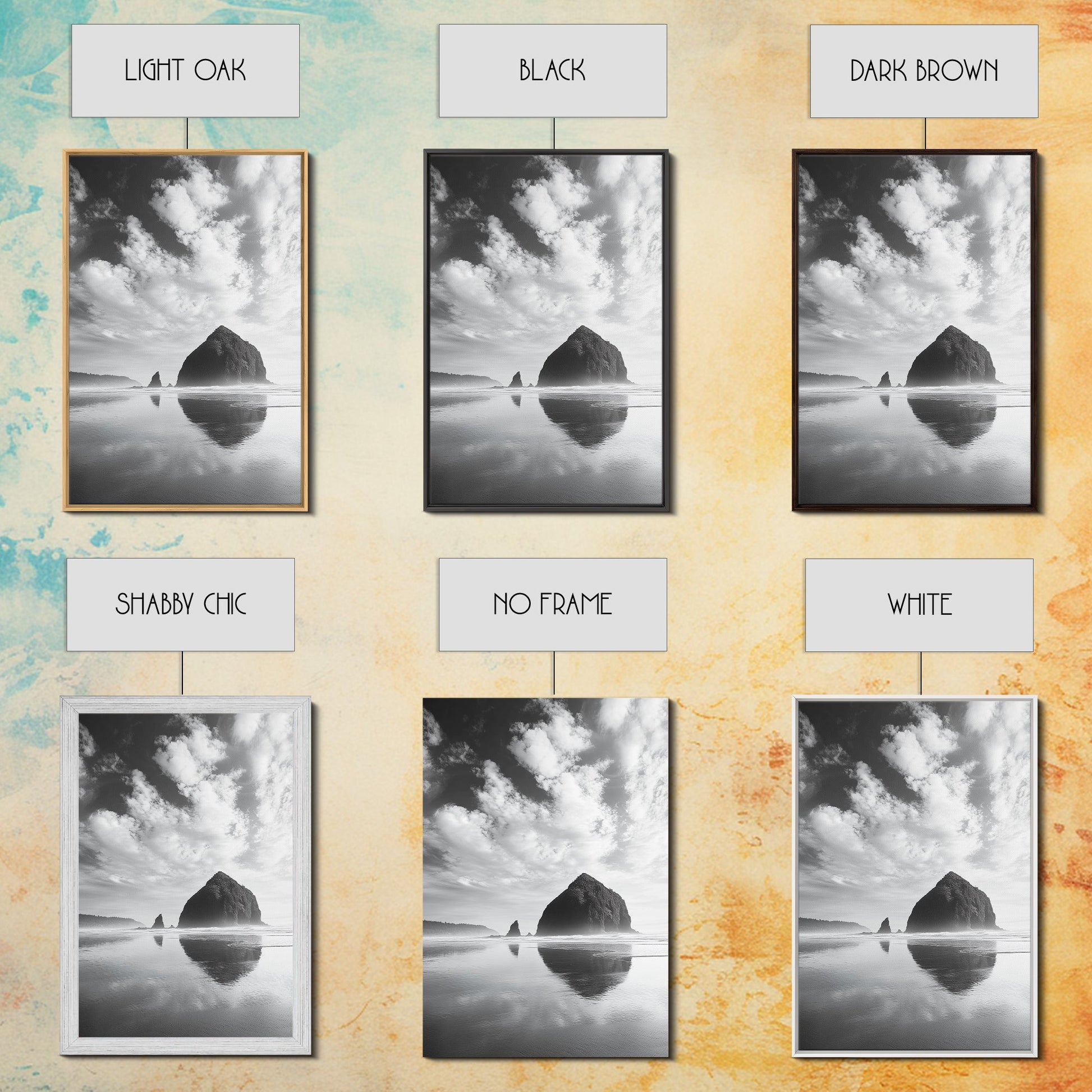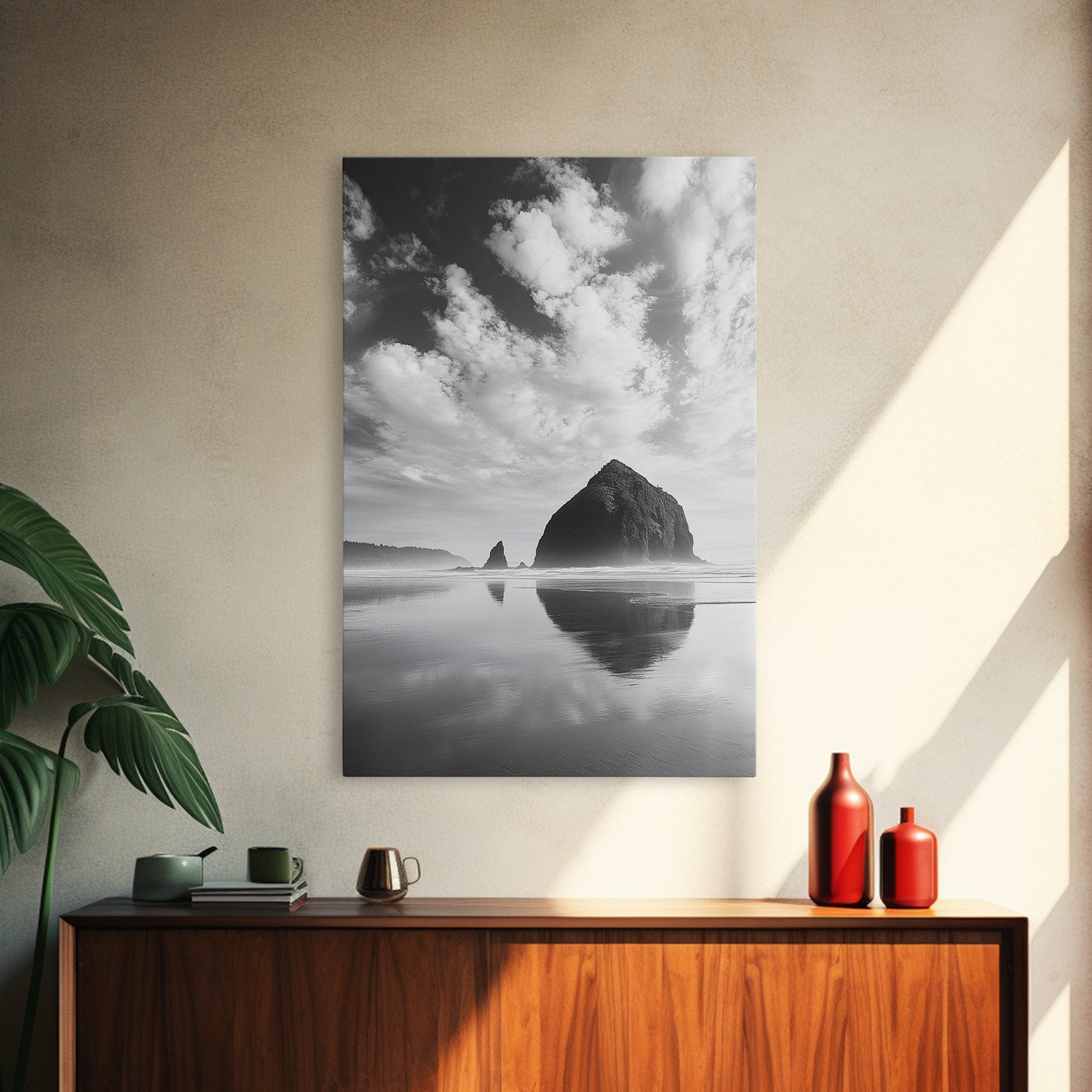 Iconic sea stack, Oregon coast art, tranquil reflections, dramatic clouds, Canvas Print, bedroom wall art, modern coastal minimalist decor
