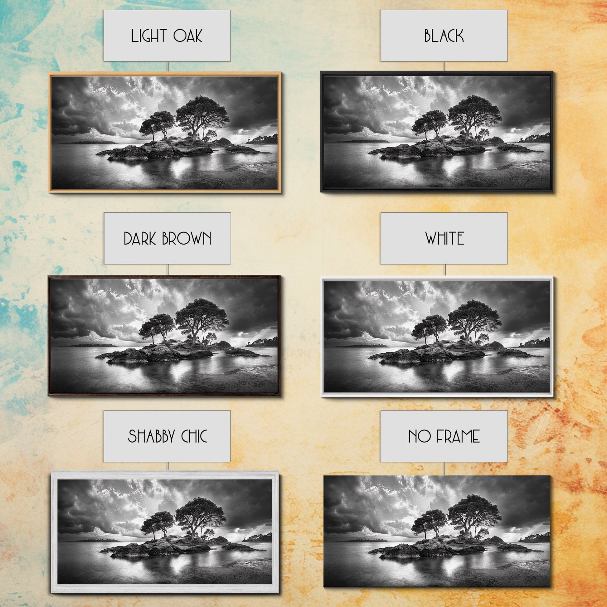 Island Pines, Rocky Shoreline, Peaceful Water, Stormy Sky, Framed Canvas Print, coastal art, rustic nature wall art, neutral living room decor