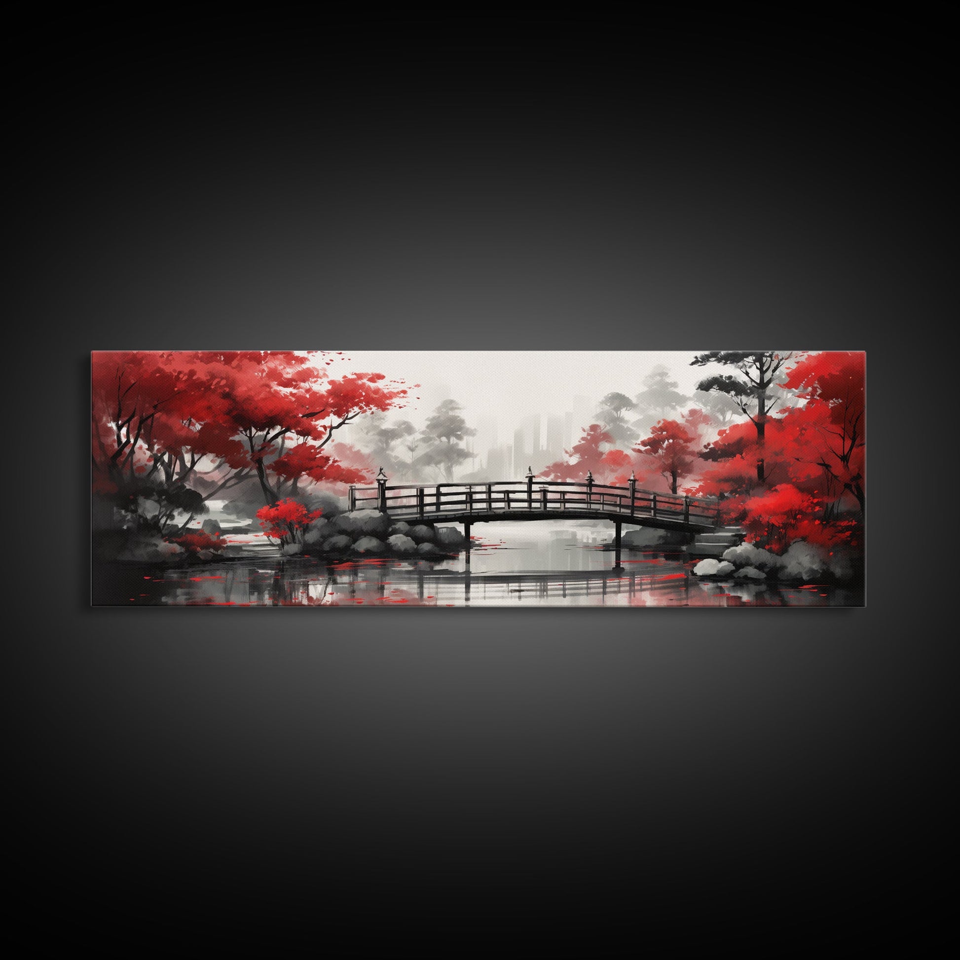 Japanese Hashi Bridge in The Spring, Framed Canvas Print, Japanese Maple Trees Along A Stream, Asian Inspired Art