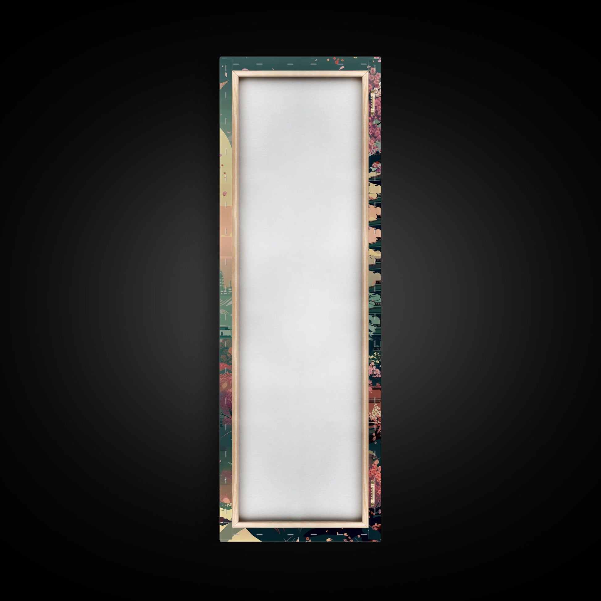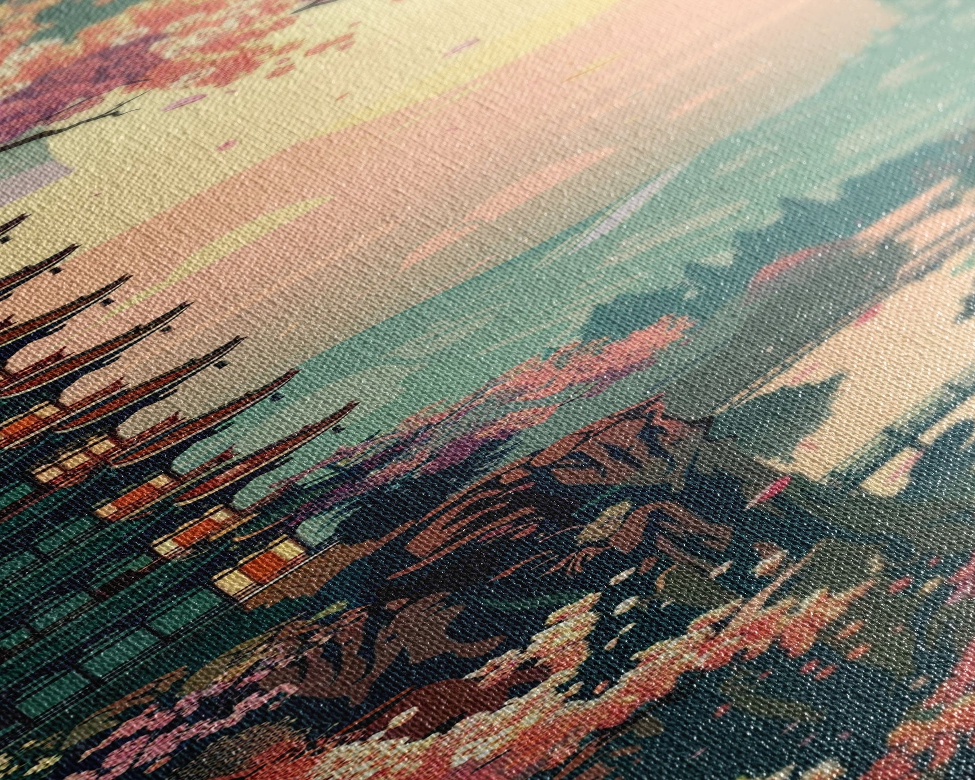 Japanese Pagoda Among Sakura Trees Under Yellow Moon Tall Art Skinny Art Framed Canvas Print Japanese Style Art Ukiyo-e Wood Block Print