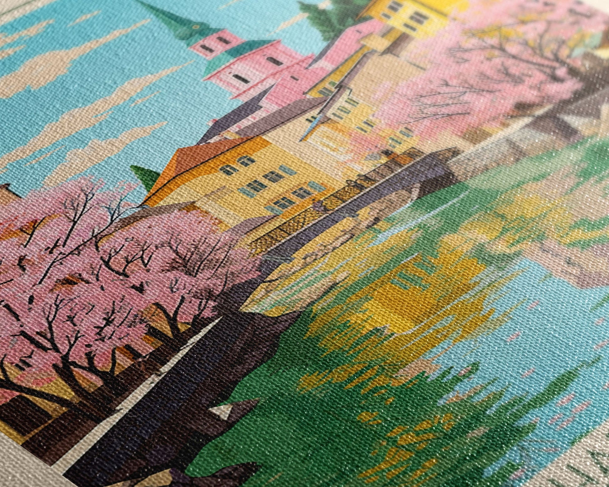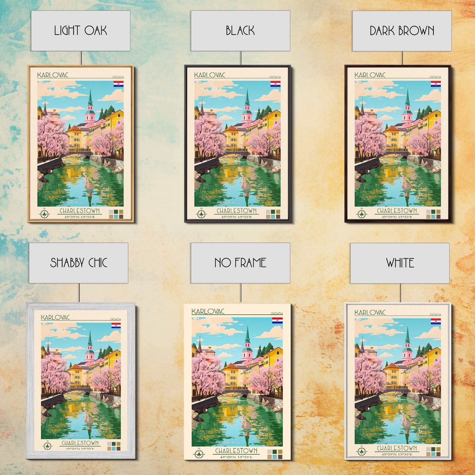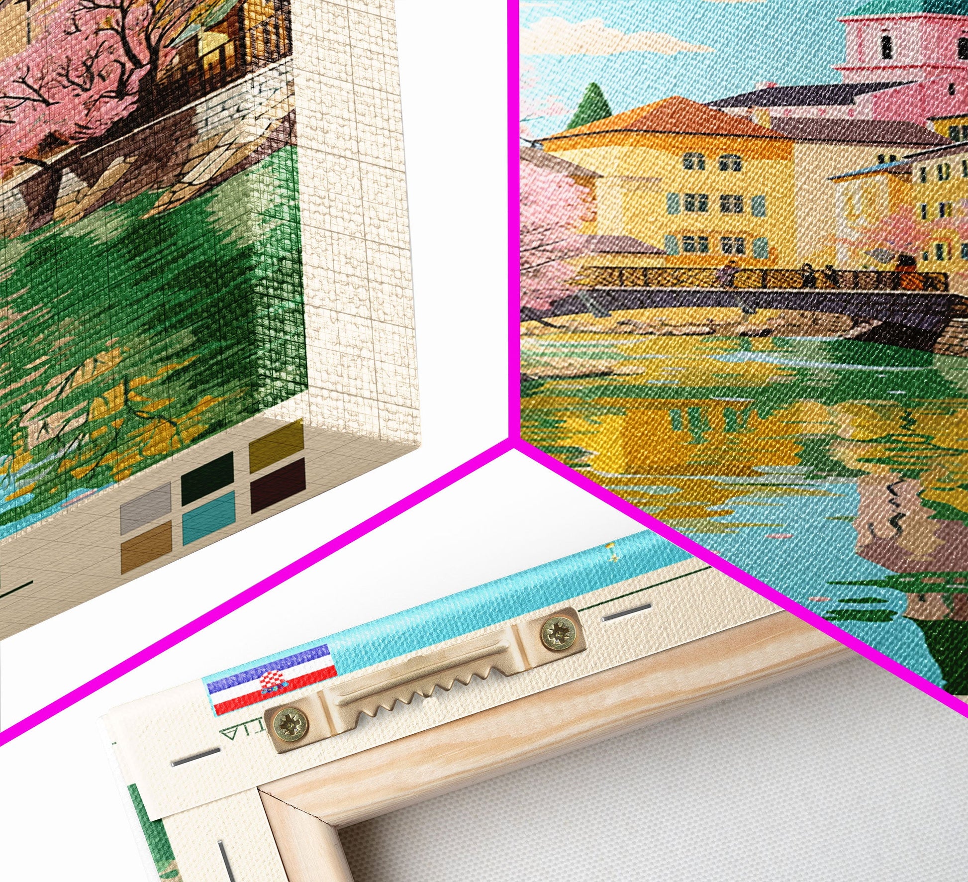 Karlovac Croatia Travel Poster Framed Canvas Print, Midcentury Modern Art, Pop Art Wall Decor, Scenic Living Room Art, Bedroom Decor
