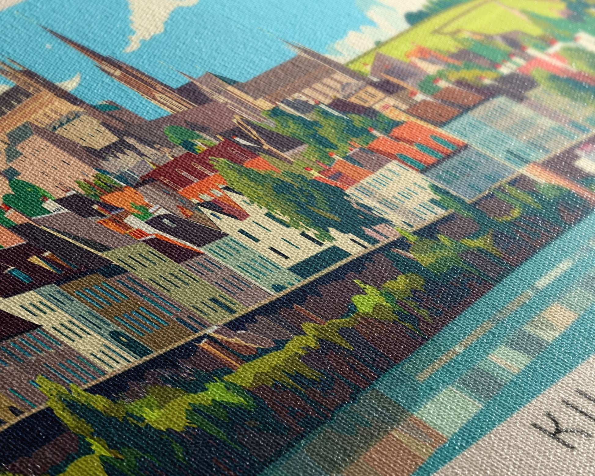 Most of our canvases are made in the USA, with the exception of canvases ordered with the light oak unstained frames, and any large canvases (24x48, 30x60, 16x48 and 20x60) ordered WITH a frame. These are temporarily made in and shipped from Europe, while we try to find a more consistent supplier in the USA.