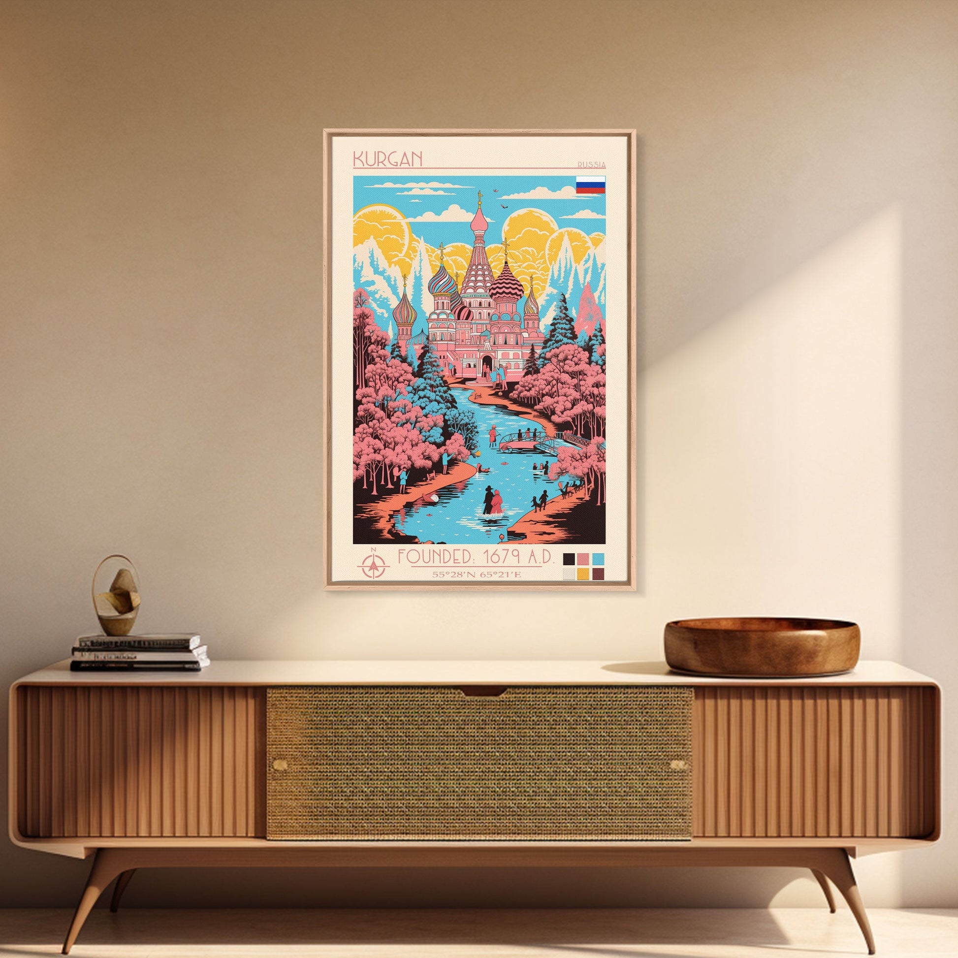 Kurgan Russia Travel Poster Framed Canvas Print, Midcentury Modern Art, Pop Art Wall Decor, Scenic Wall Art, Living Room Decoration, Office Gift