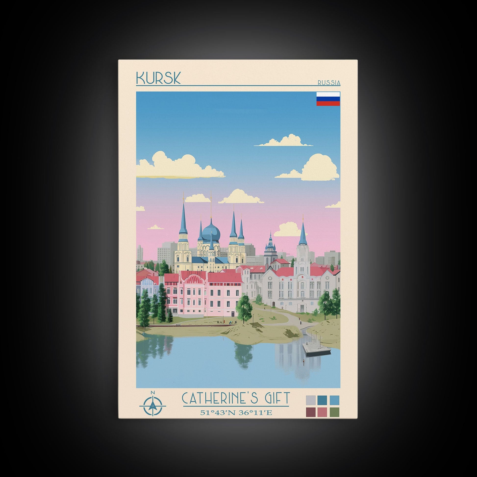 Kursk Russia Travel Poster Framed Canvas Print, Midcentury Modern Art, Pop Art Wall Decor, Scenic Bedroom Art, Office Decoration