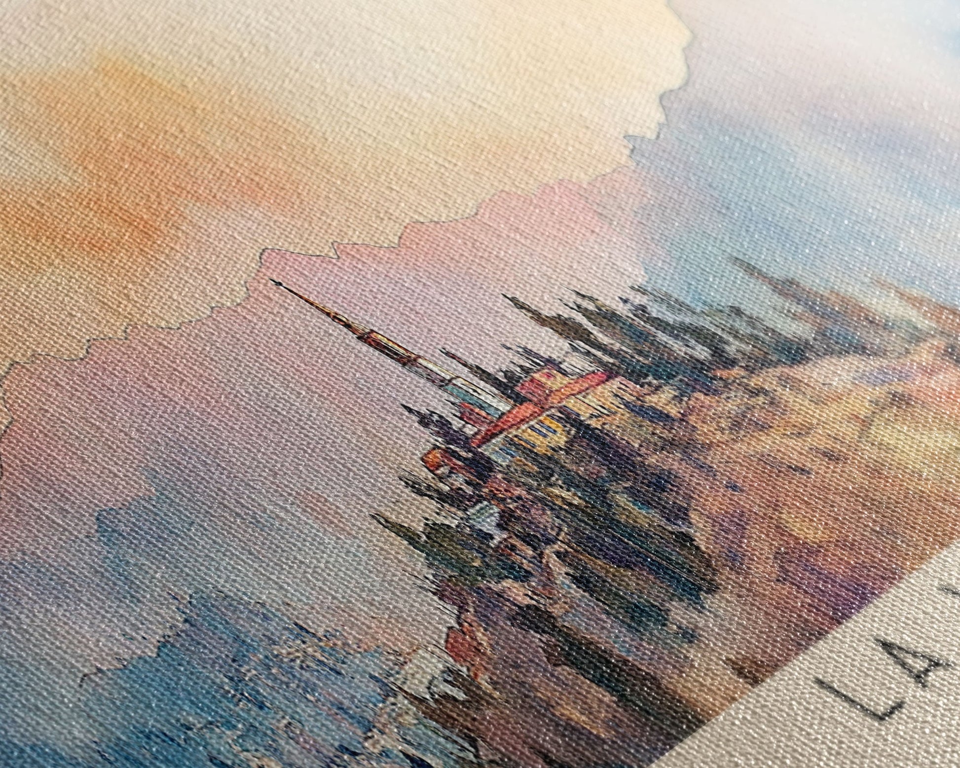 Most of our canvases are made in the USA, with the exception of canvases ordered with the light oak unstained frames, and any large canvases (24x48, 30x60, 16x48 and 20x60) ordered WITH a frame. These are temporarily made in and shipped from Europe, while we try to find a more consistent supplier in the USA.