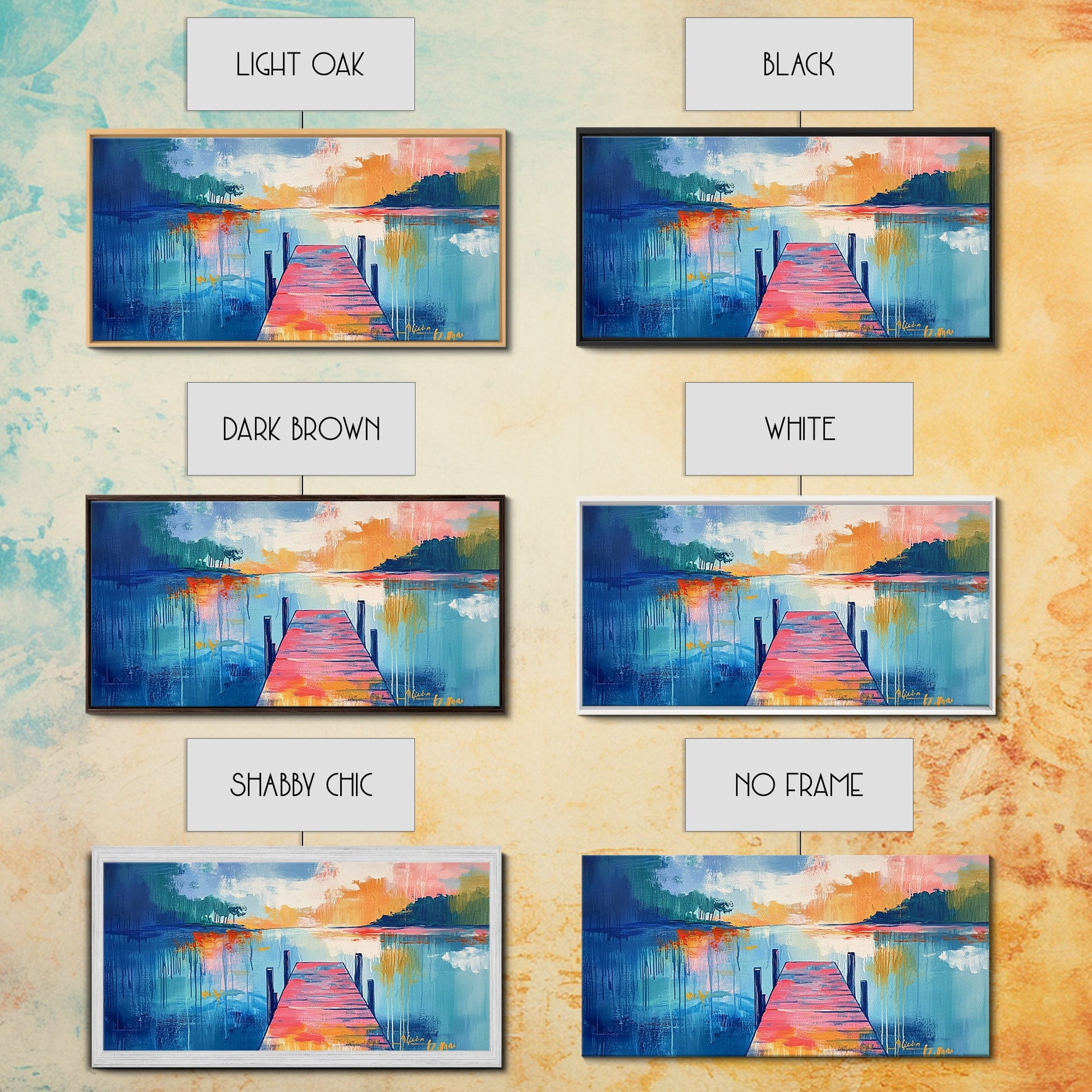 Lake Dock, sunset painting, nautical decor, coastal landscape art, wabi sabi art, extra wide art, rustic decor, Framed Canvas Print