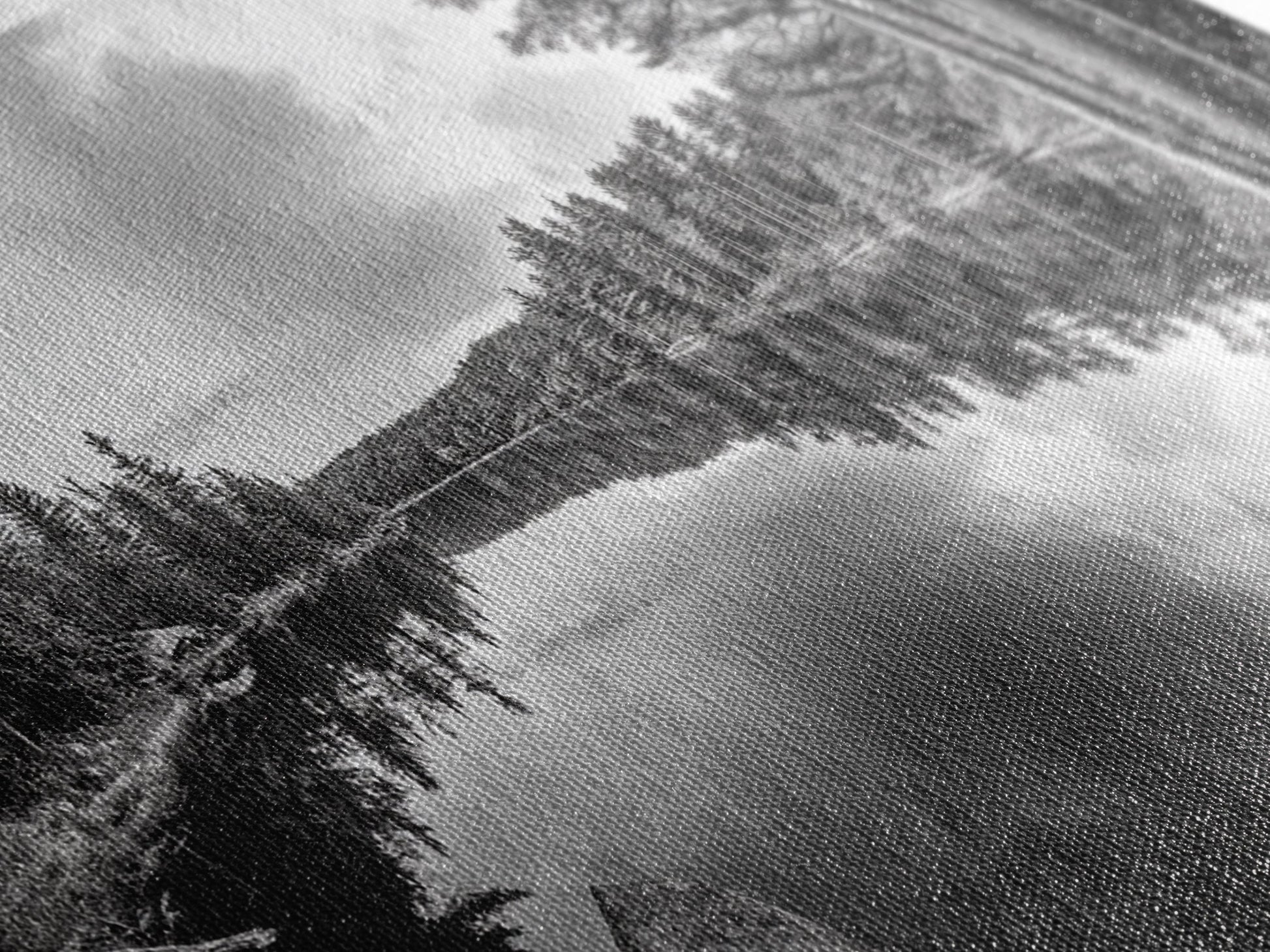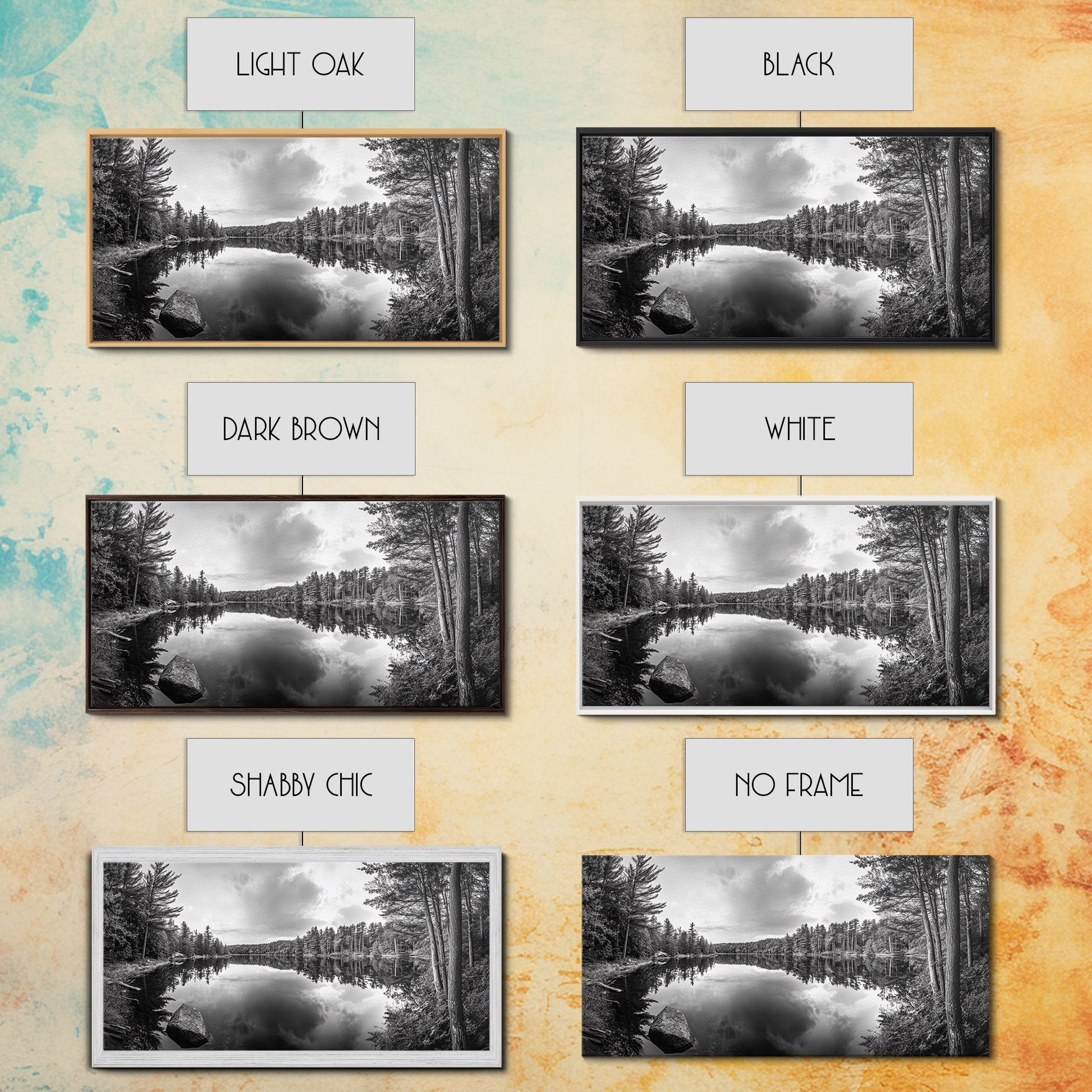 Lake reflection, pine tree art, landscape painting, wabi sabi art, rustic decor, panoramic painting, extra wide art, framed canvas print