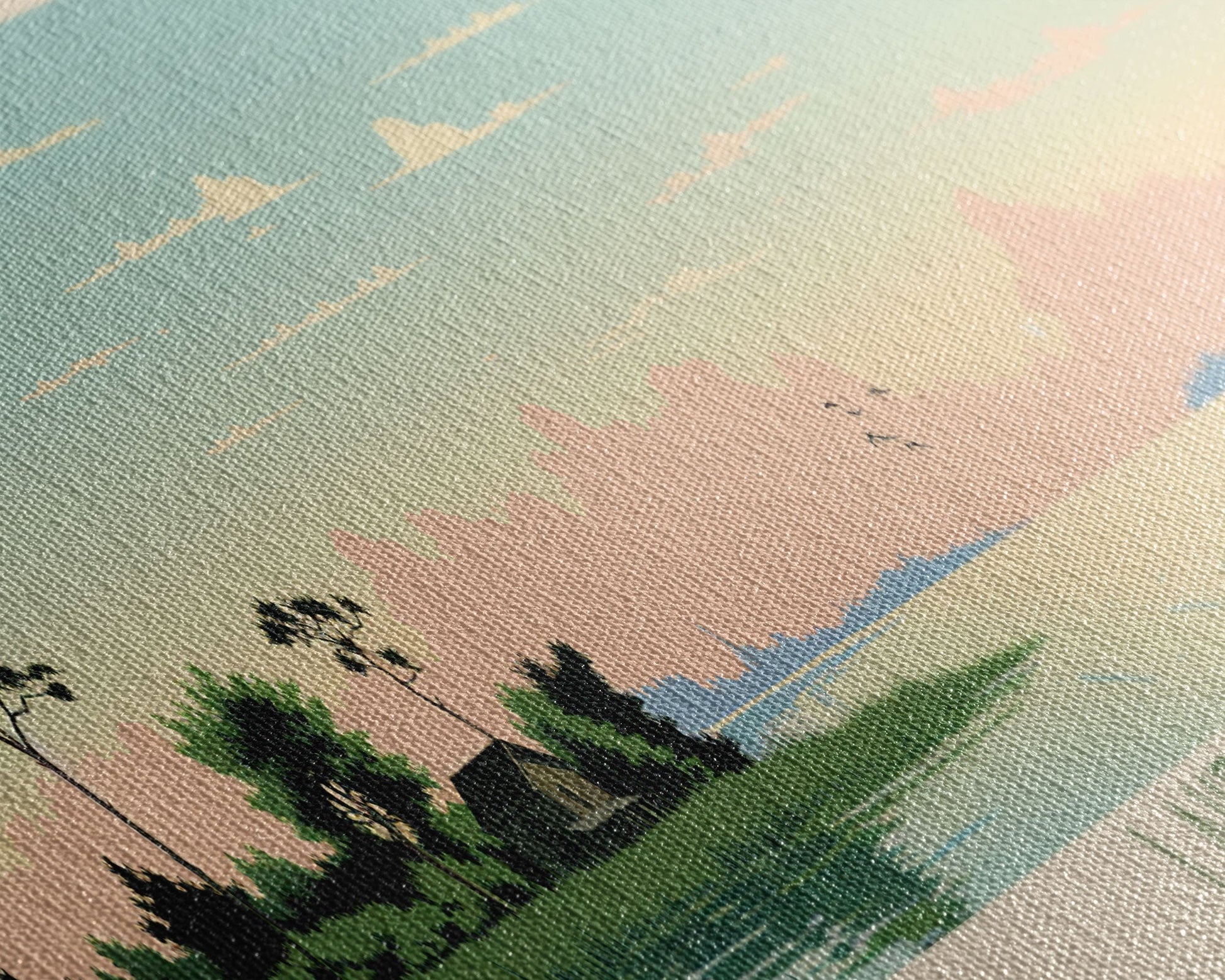 Most of our canvases are made in the USA, with the exception of canvases ordered with the light oak unstained frames, and any large canvases (24x48, 30x60, 16x48 and 20x60) ordered WITH a frame. These are temporarily made in and shipped from Europe, while we try to find a more consistent supplier in the USA.