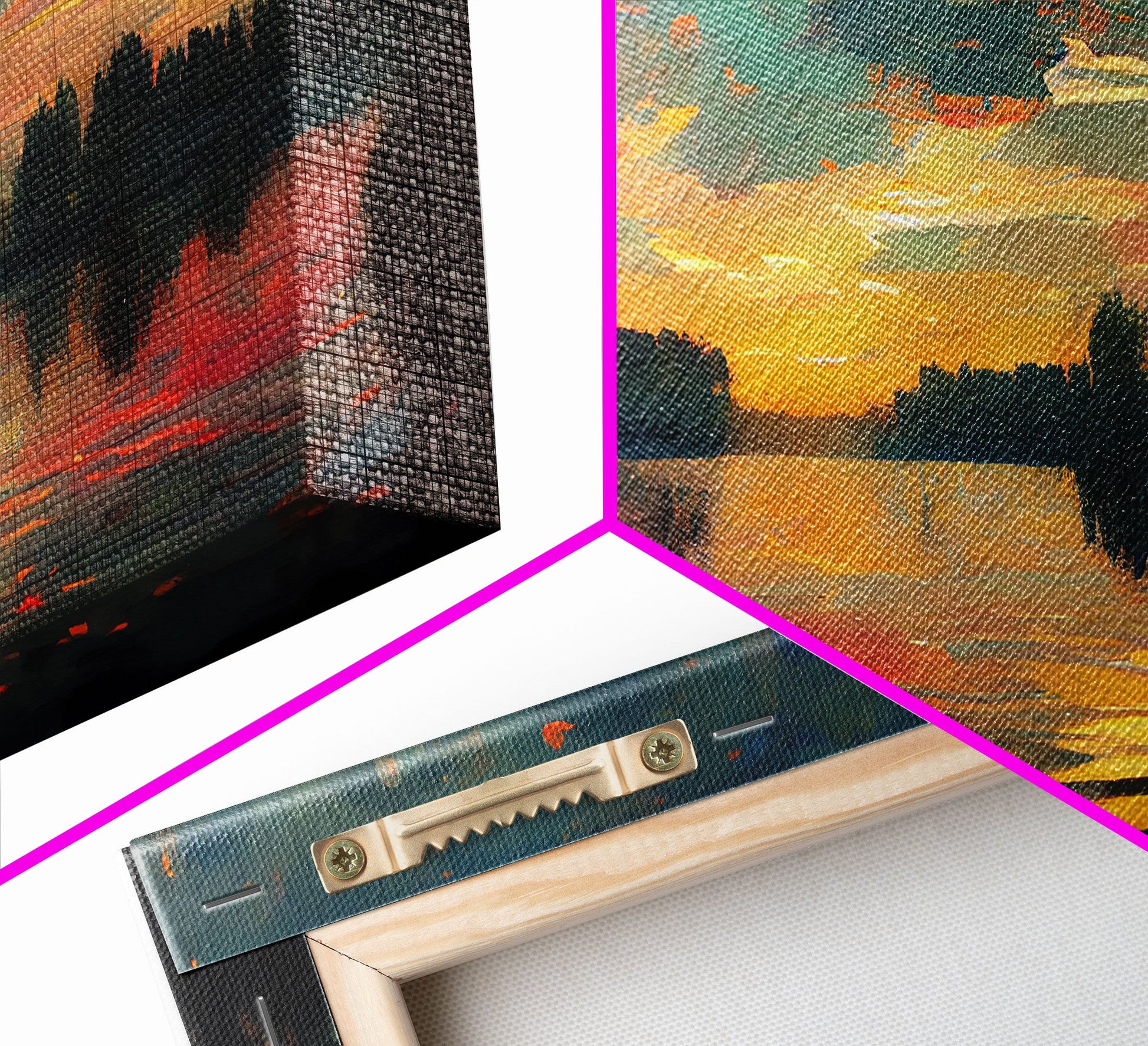 Lakehouse Canvas Print, watercolor painting of a sunset reflected on a lake