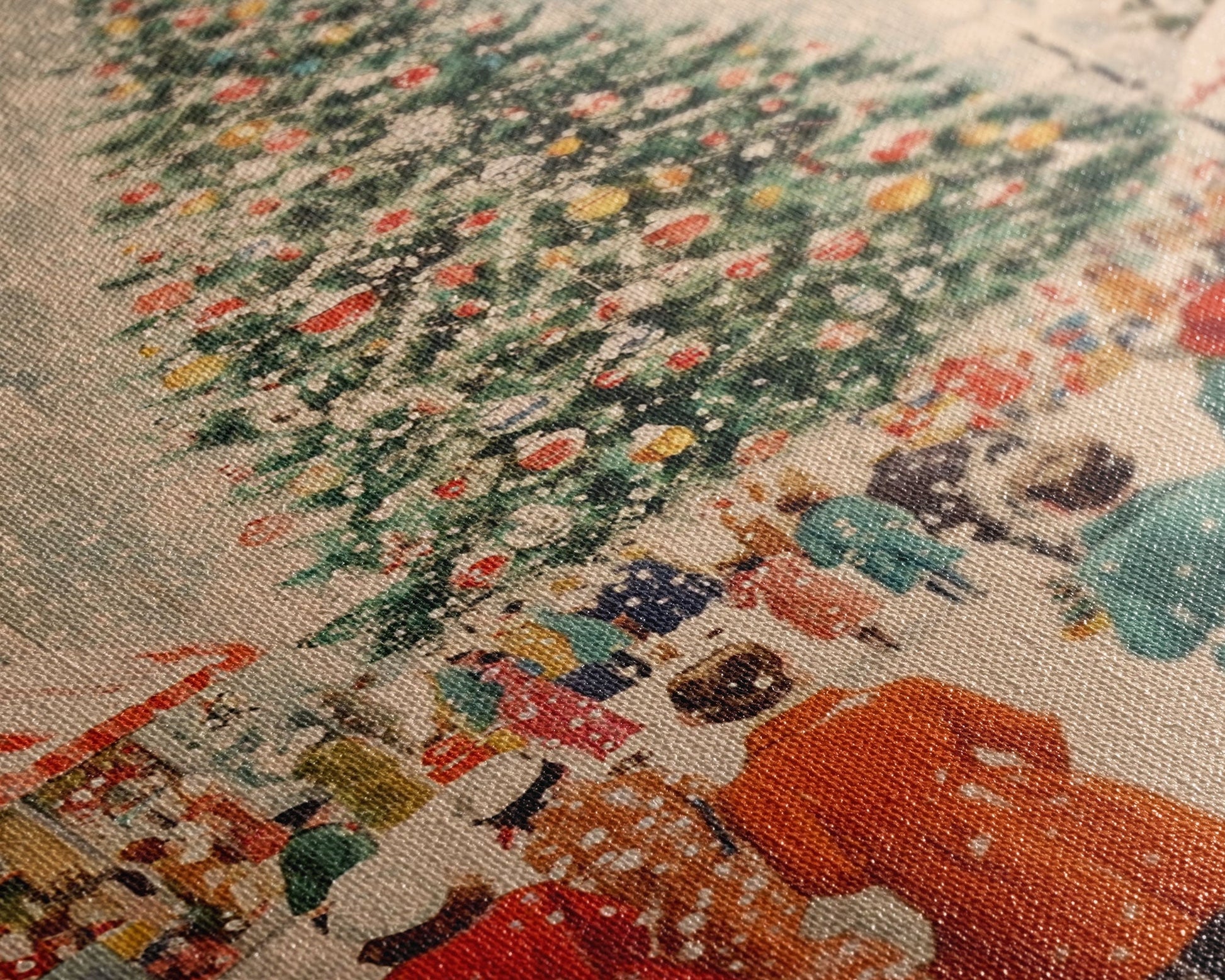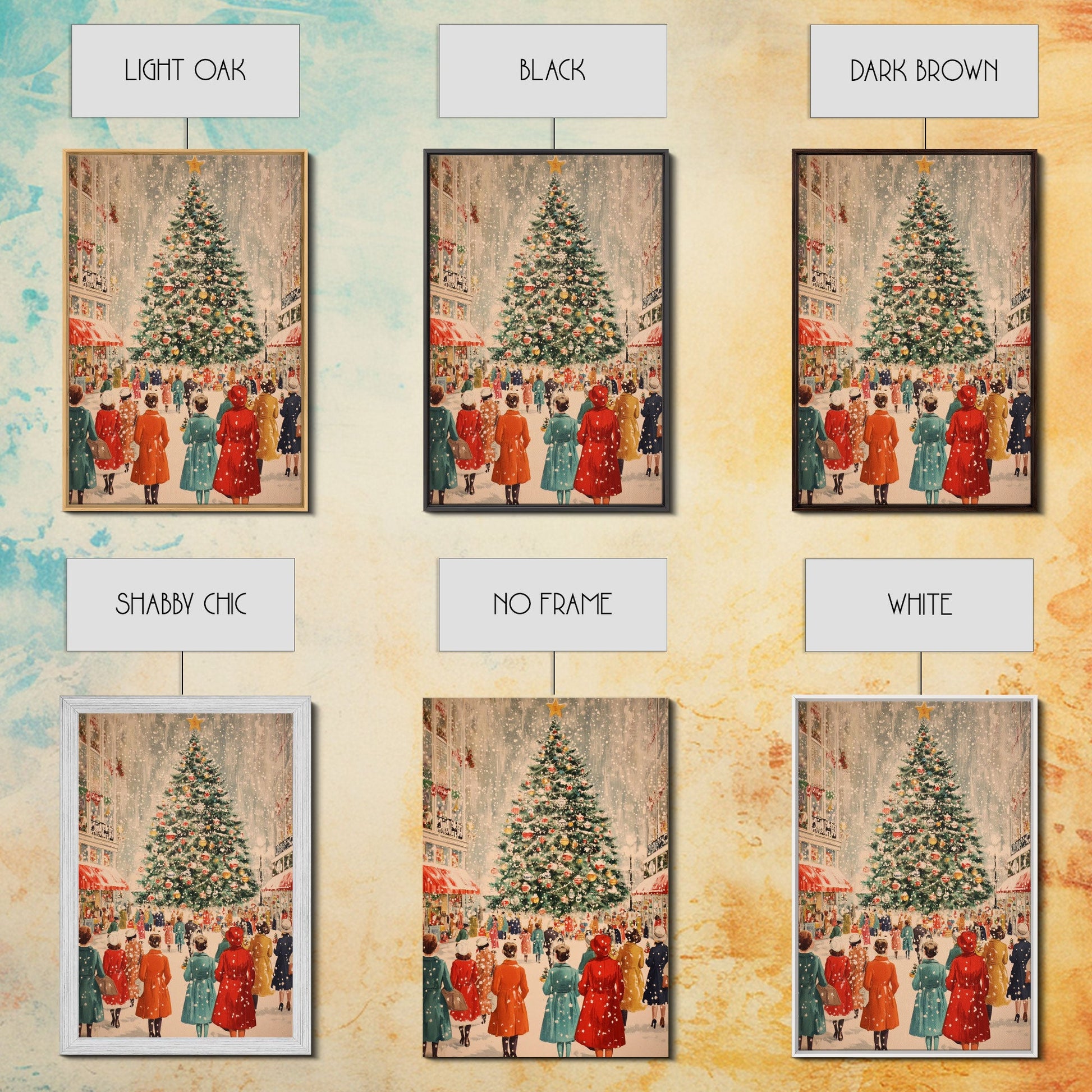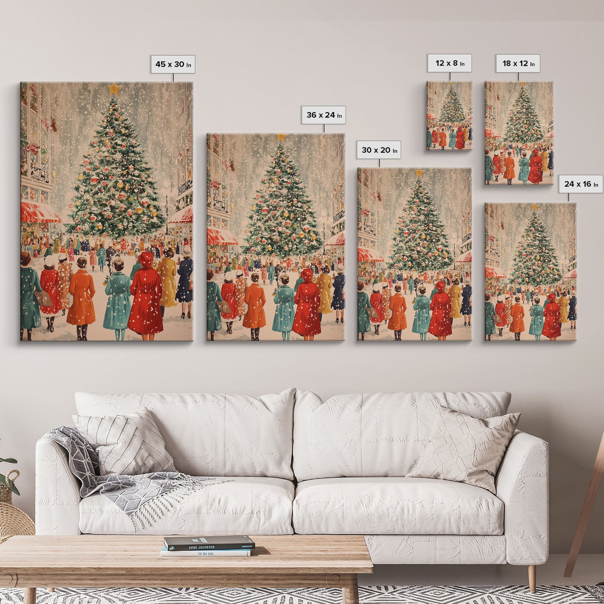 Large Christmas Tree in Snowy Town Square with People Gathering for the Holidays, Framed Canvas Print for Christmas Wall Art