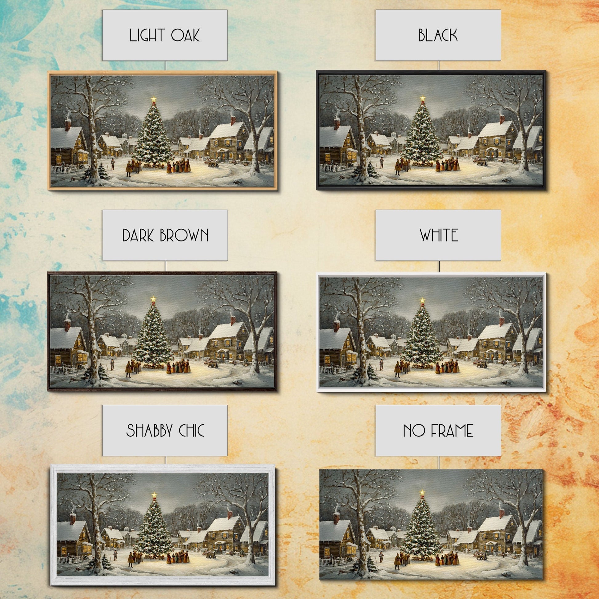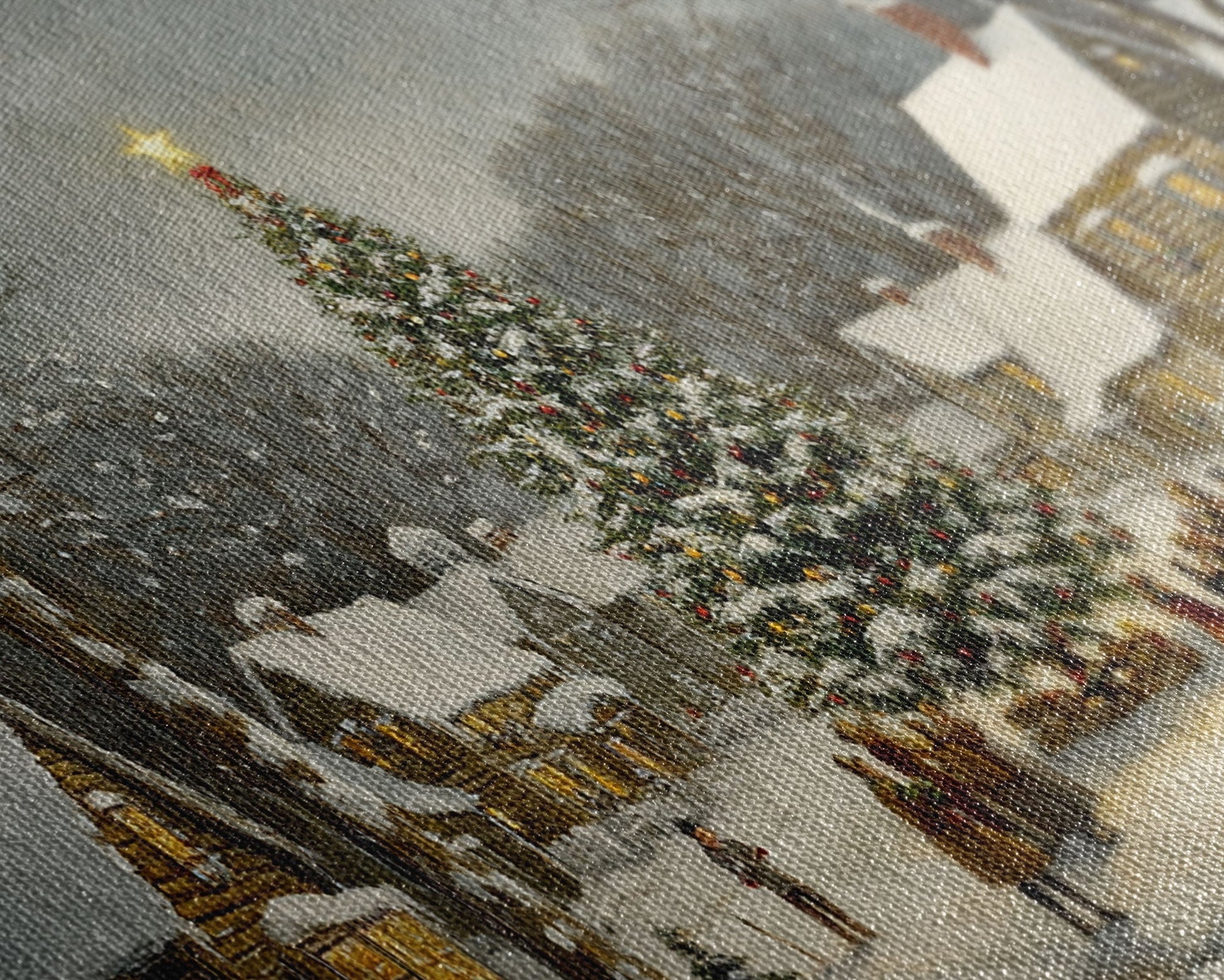 Large Christmas Tree In Snowy Village With Families, Winter Wonderland Holiday Wall Art, Framed Canvas Print, Rustic Christmas Decor