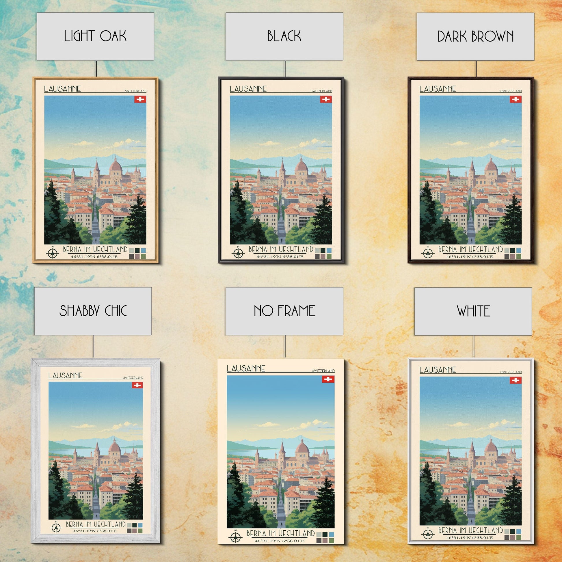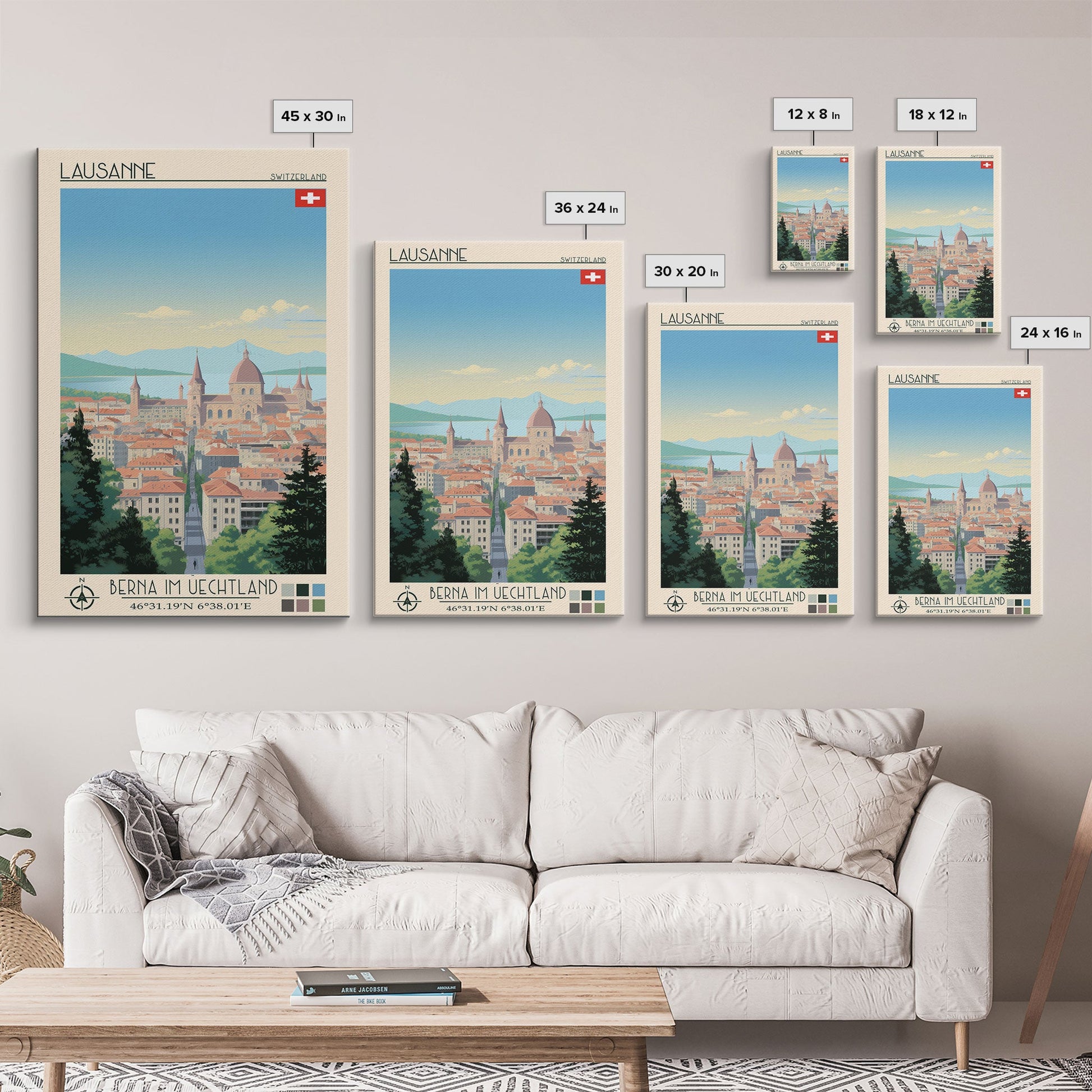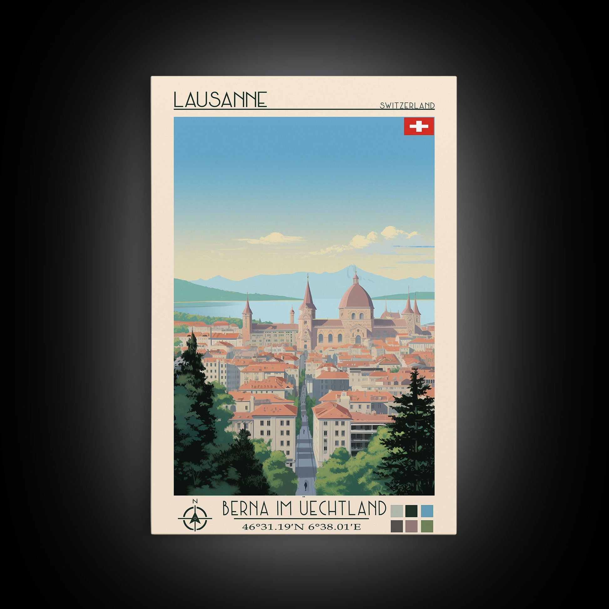Lausanne Switzerland Travel Poster Framed Canvas Print, Midcentury Modern Art, Pop Art Wall Decor, Scenic Wall Art, Living Room Decoration, Office Art