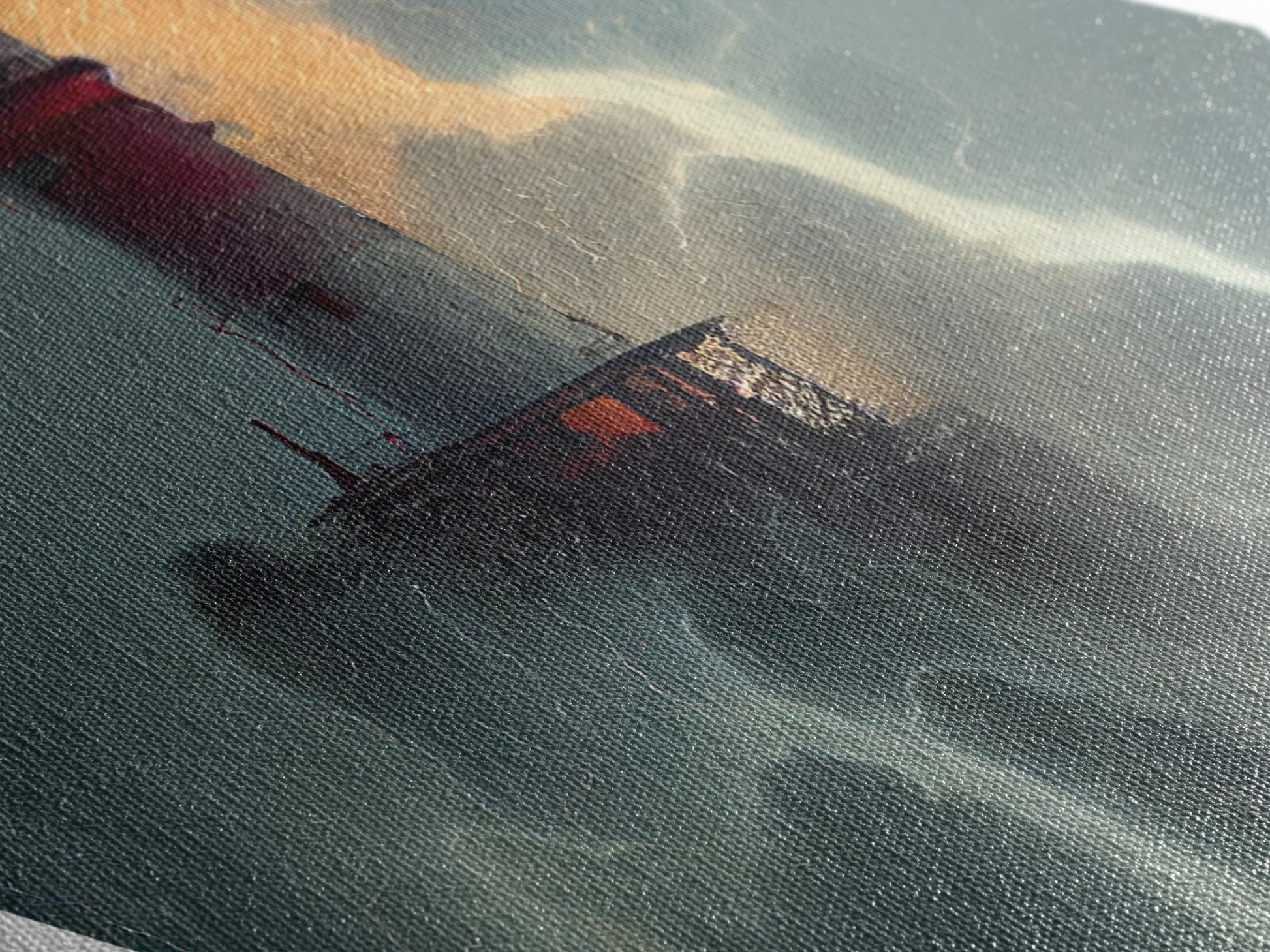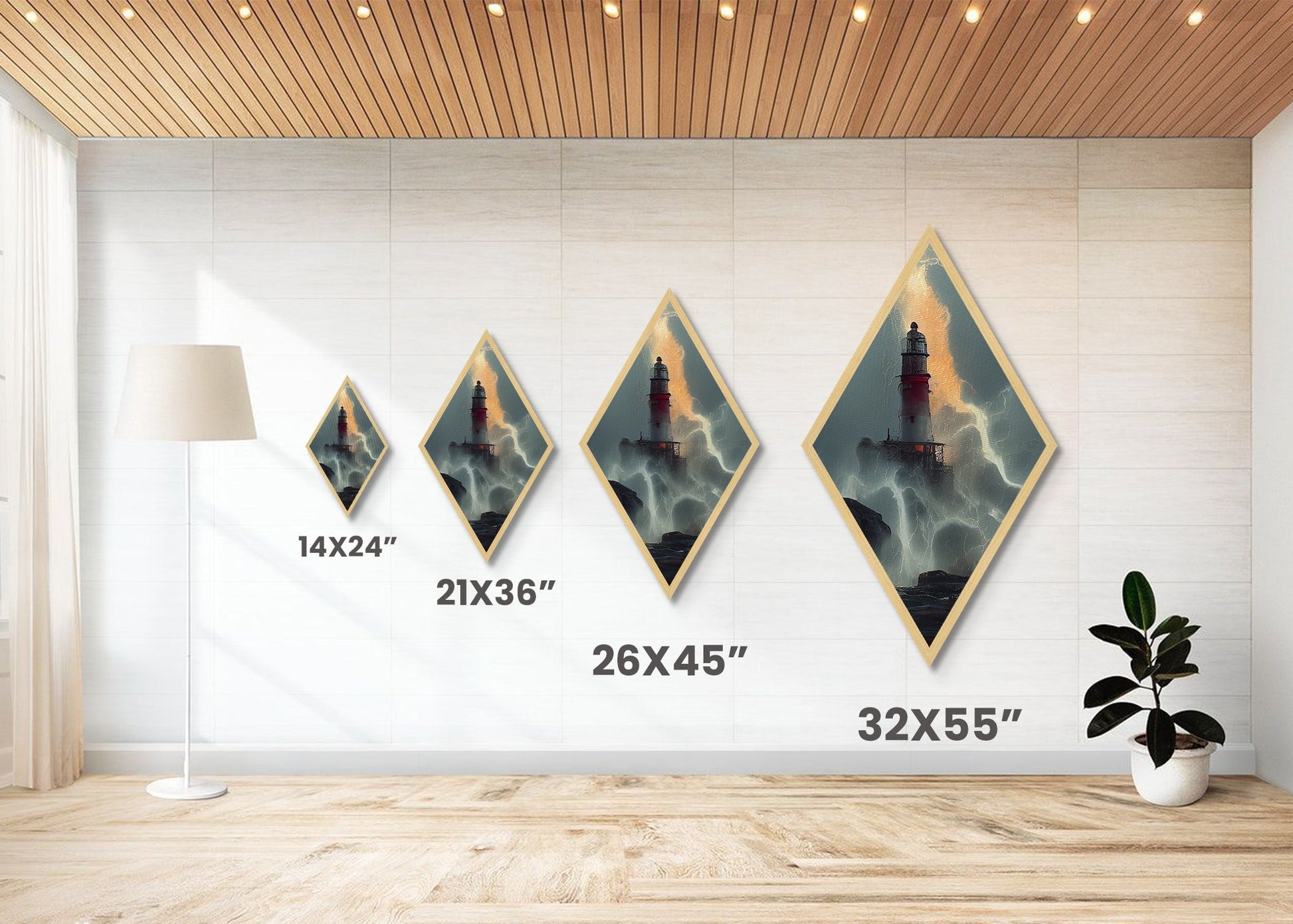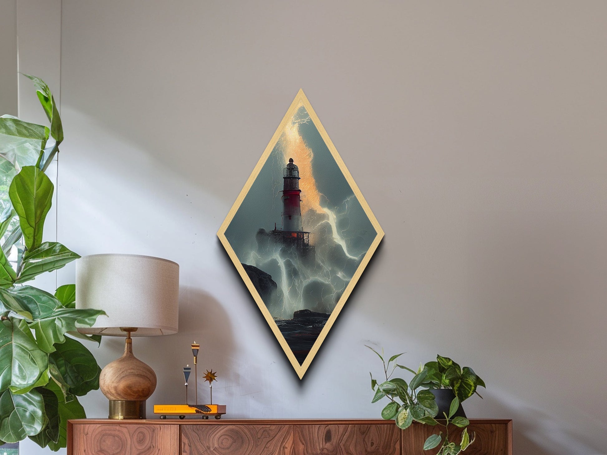 Lighthouse Tempest Fury Diamond Shaped Stormy Sea Wall Art Canvas Embossed Print Dramatic Nautical Lightning Ocean Decor