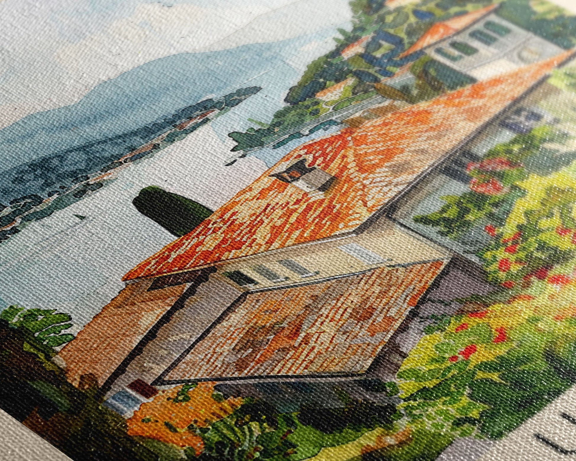 Lugano Switzerland Travel Poster Framed Canvas Print, Lakeside Cityscape, Watercolor Painting, Wall Art, Home Decoration, Travel Print, Artistic Gift