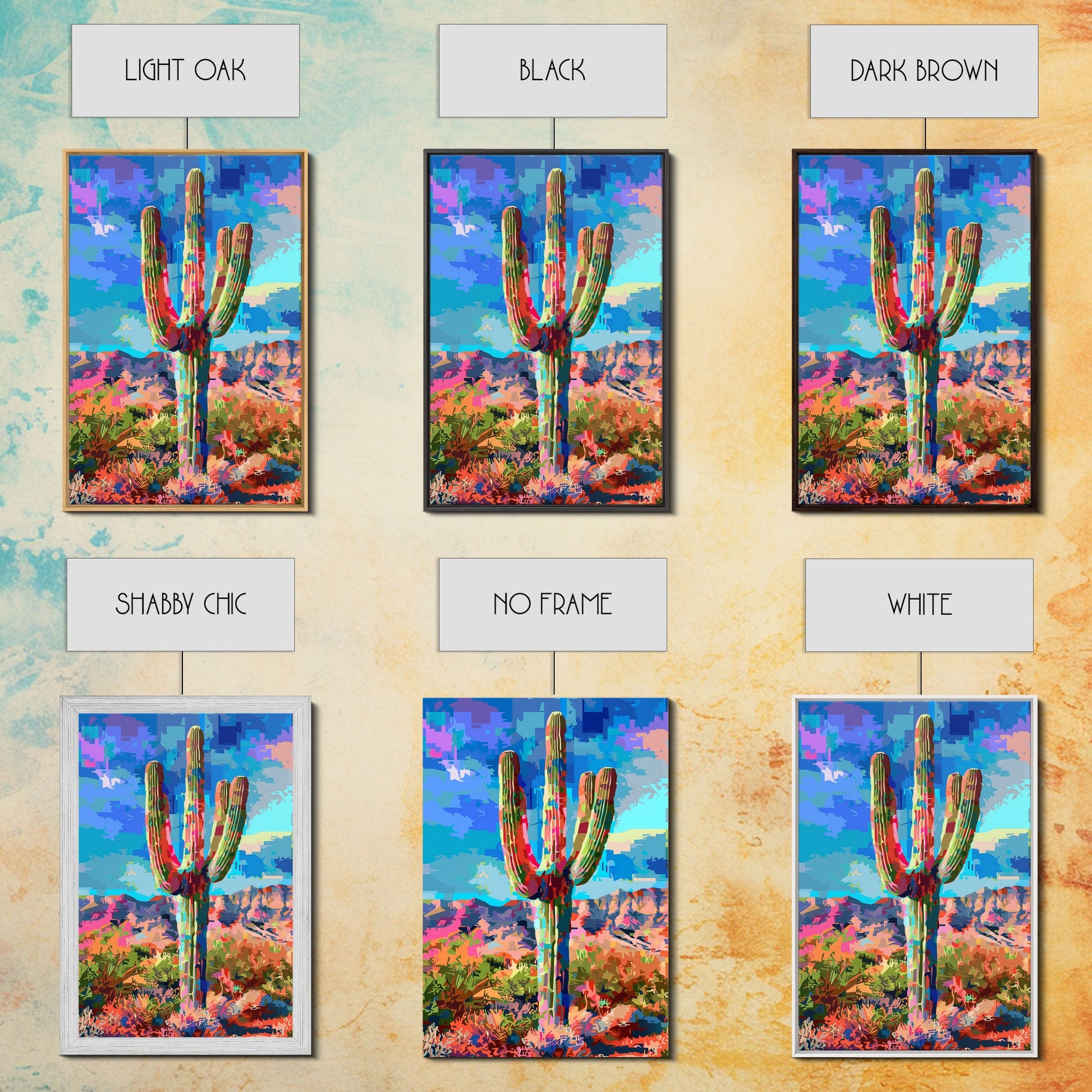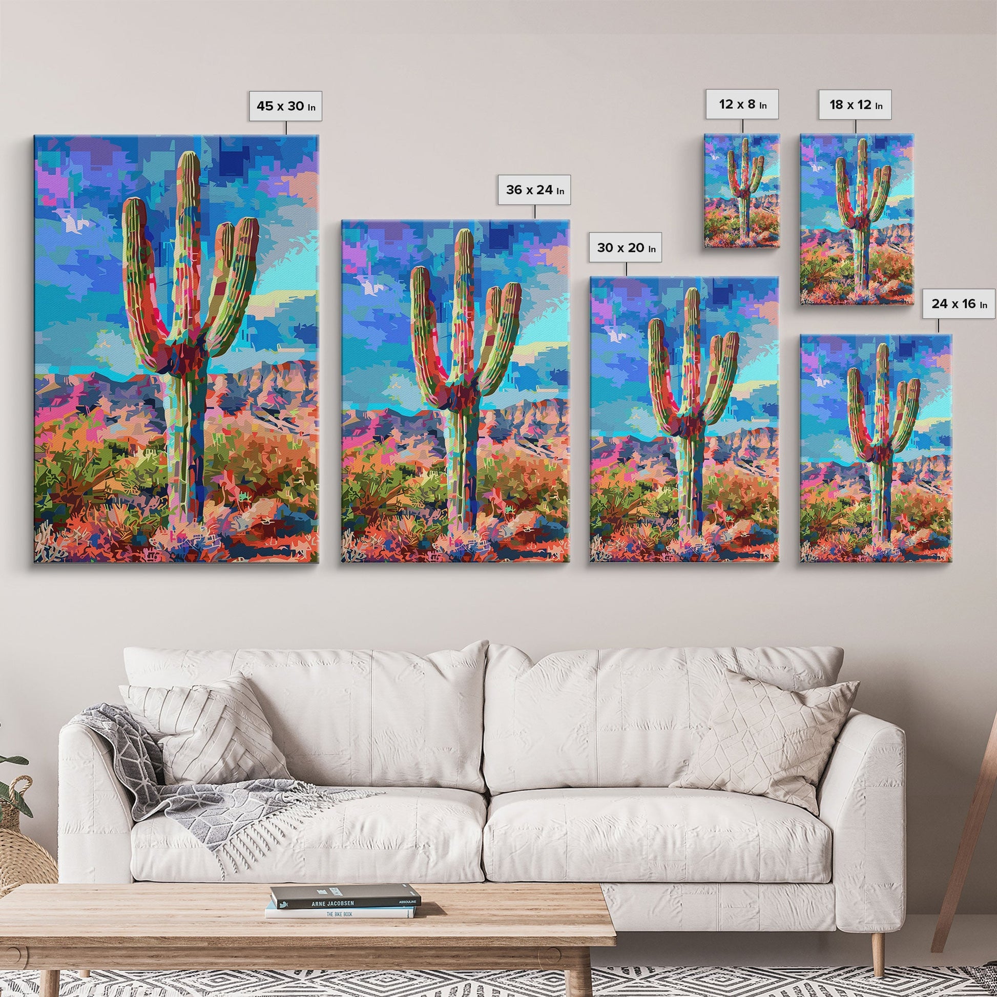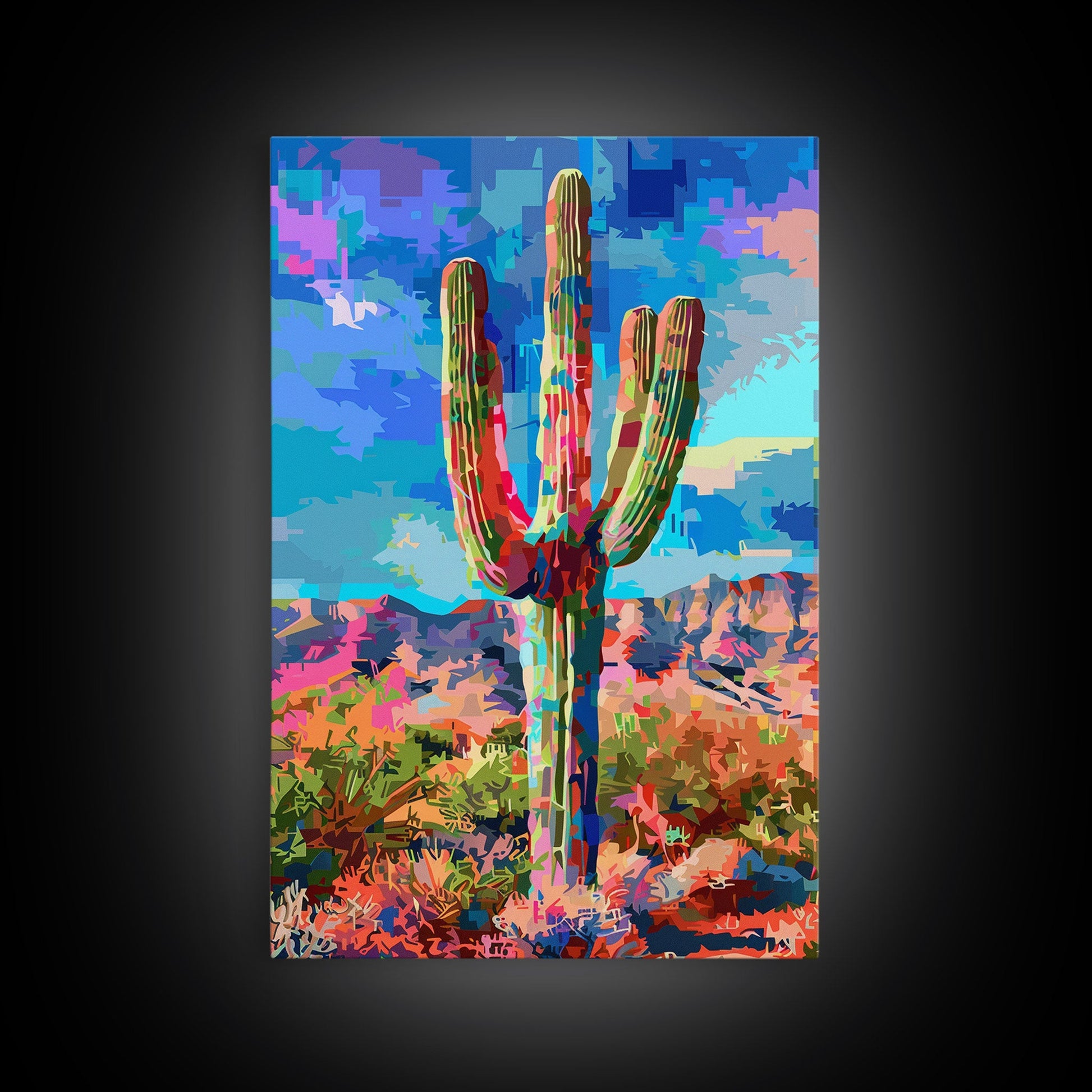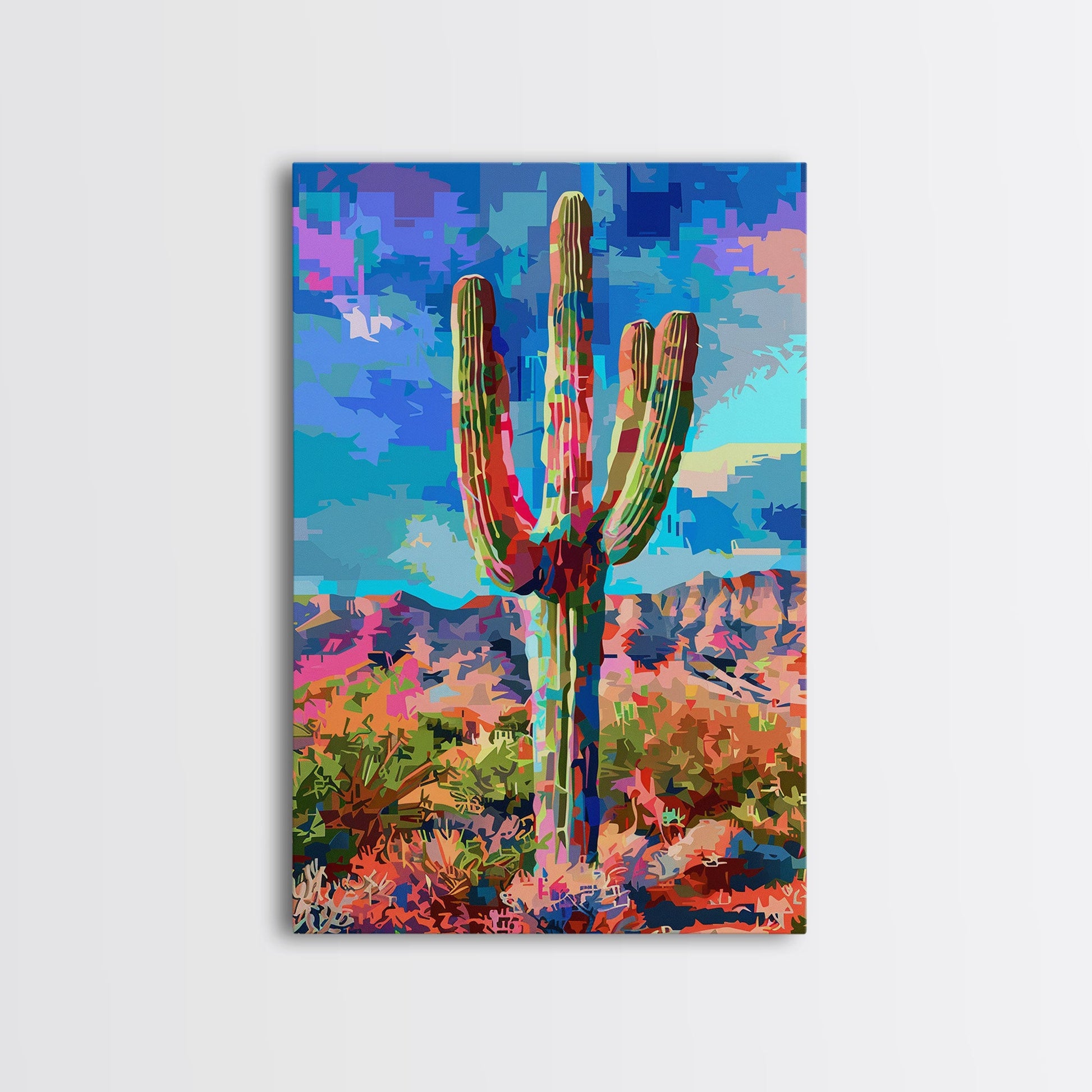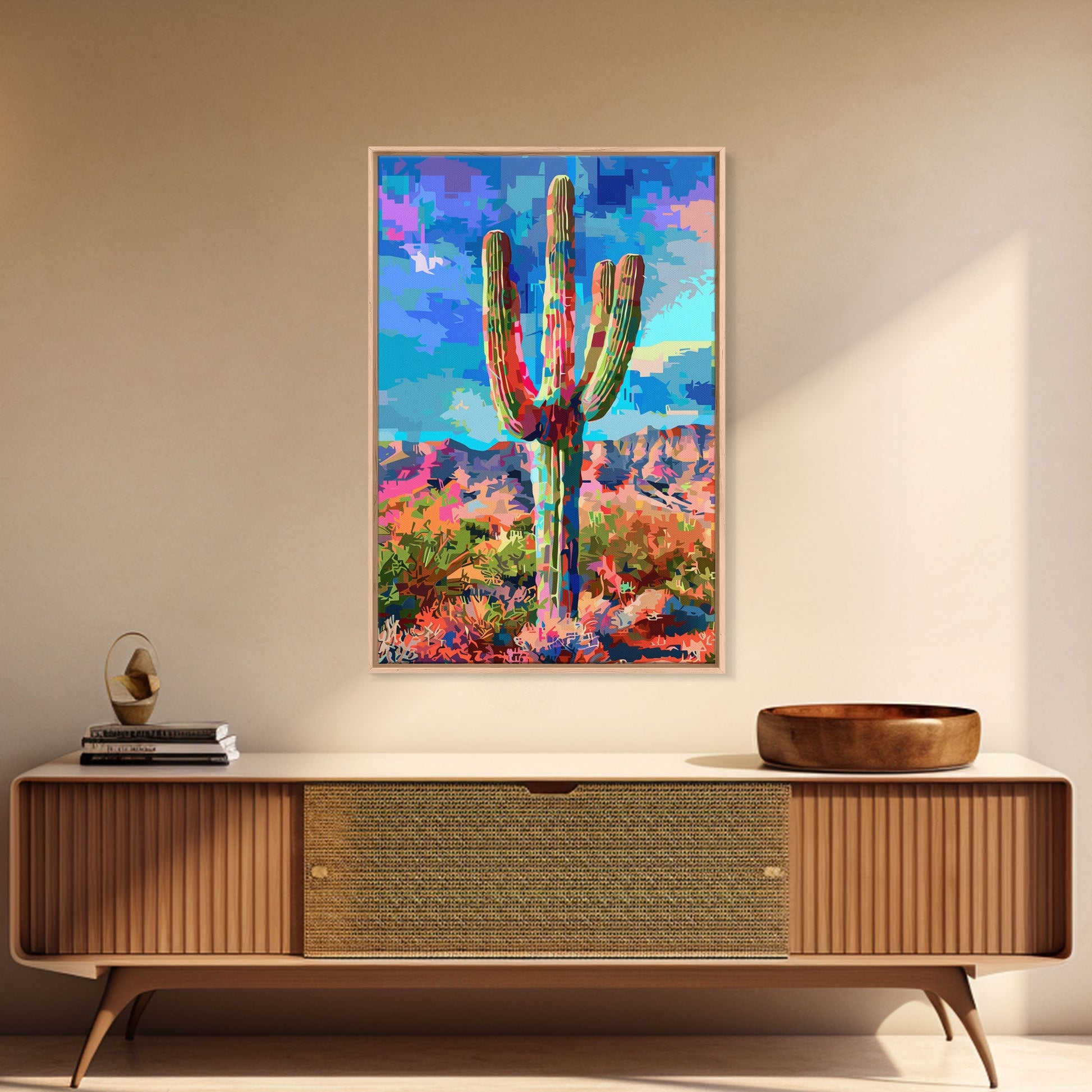 Majestic Saguaro Cactus in Colorful Desert Landscape - Framed Canvas Print, Vibrant Southwest Decor, Living Room Art, Cactus Wall Art