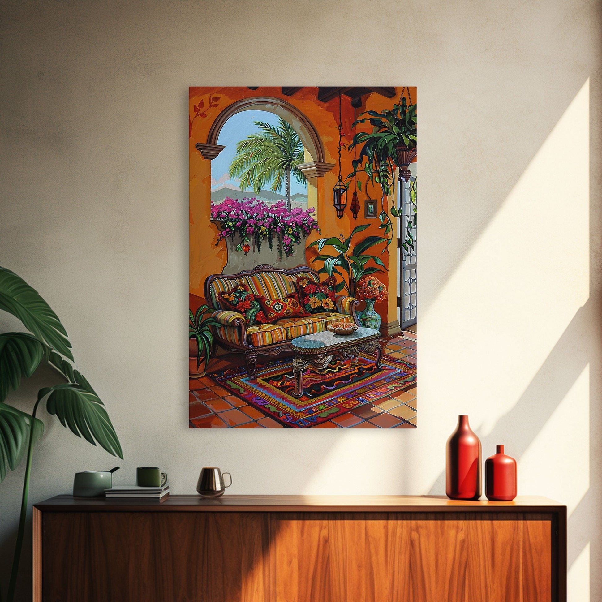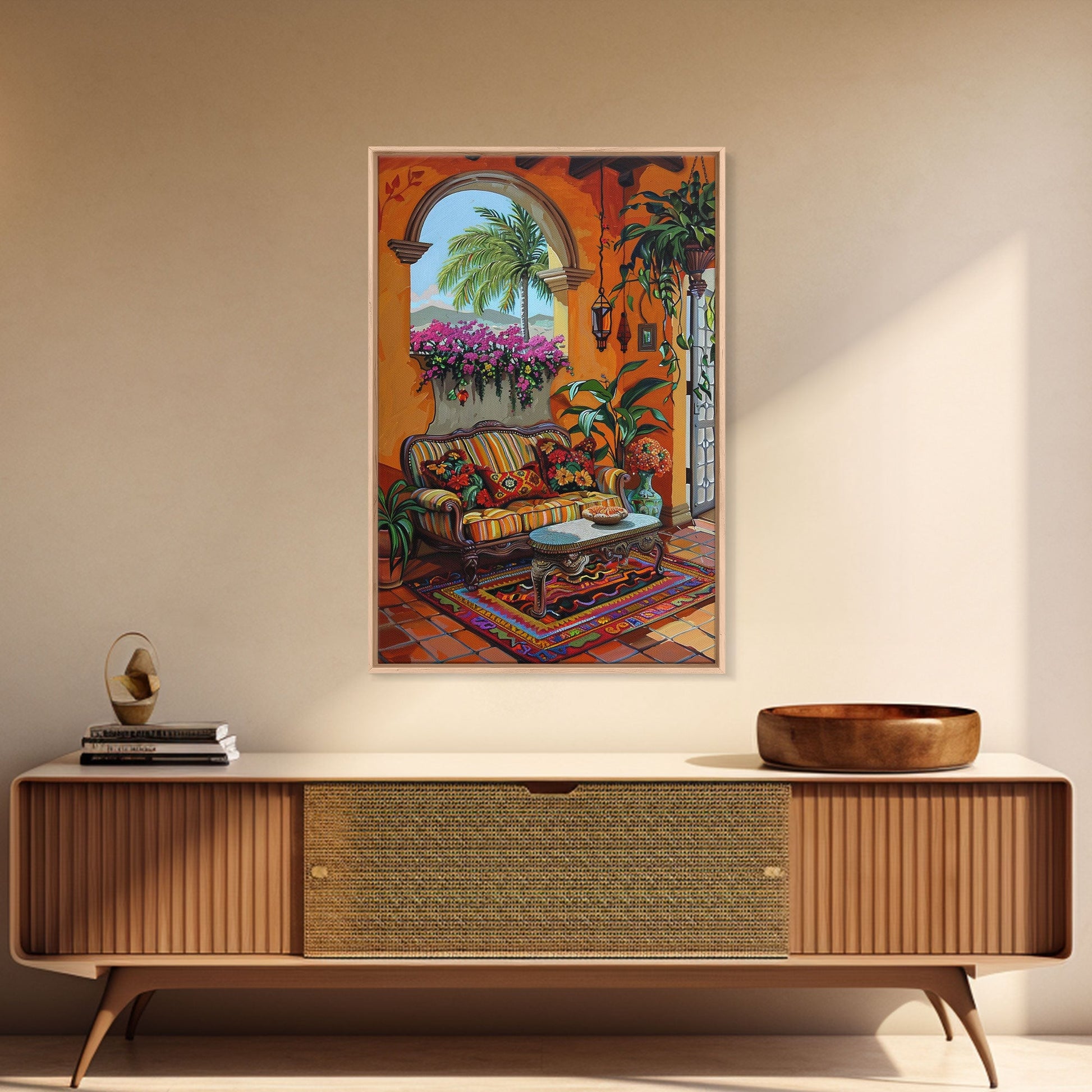 Mediterranean Courtyard Lounge Framed Canvas Print Spanish Style Home Decor Best Gift Bright Seasonal Art Above Sofa Wall Art