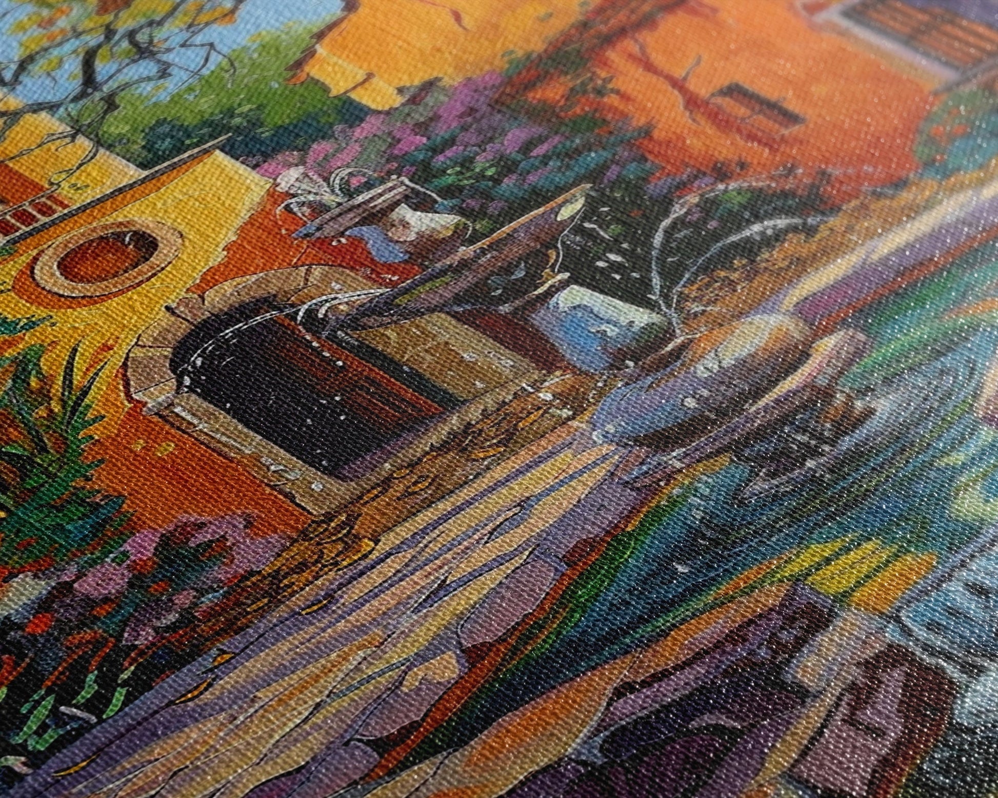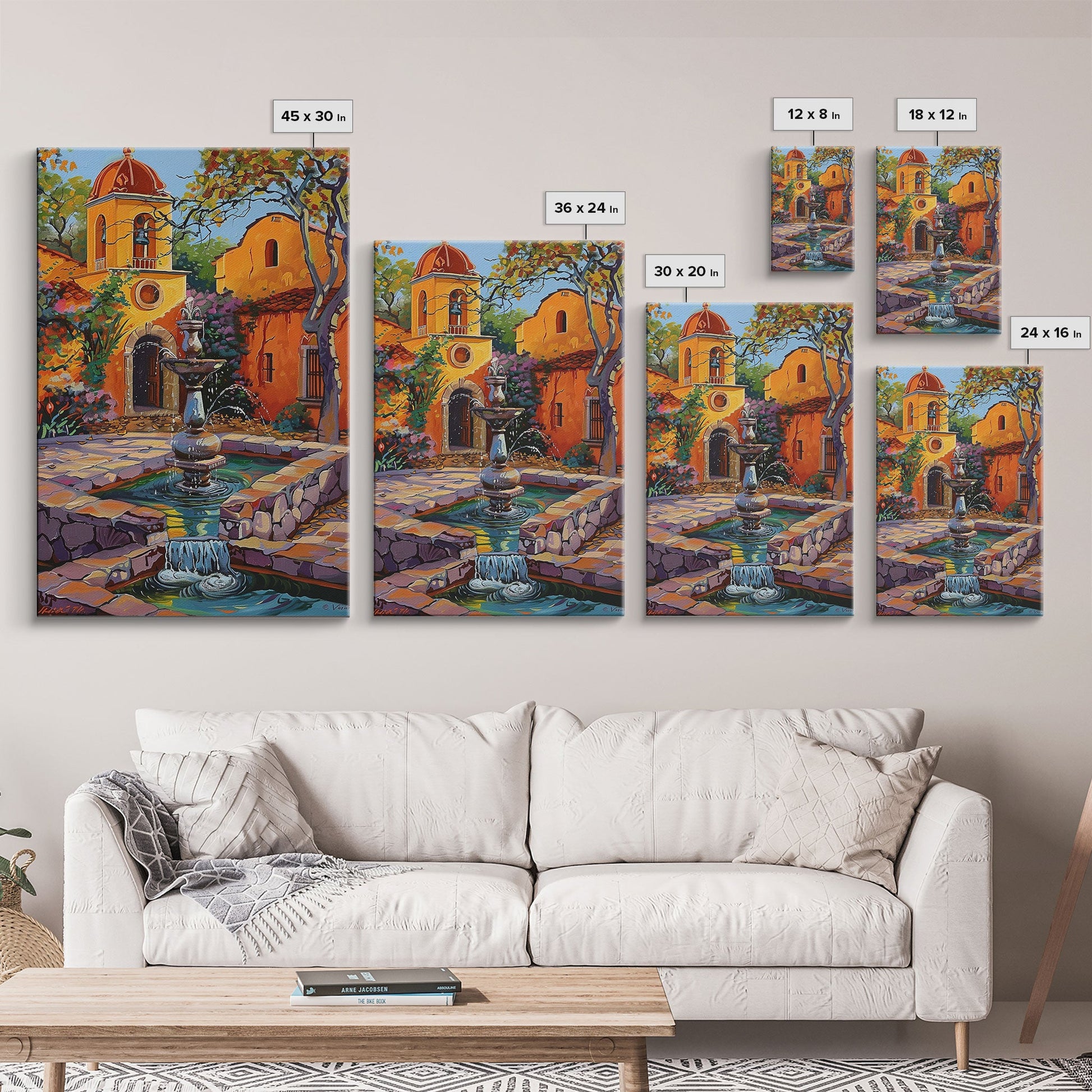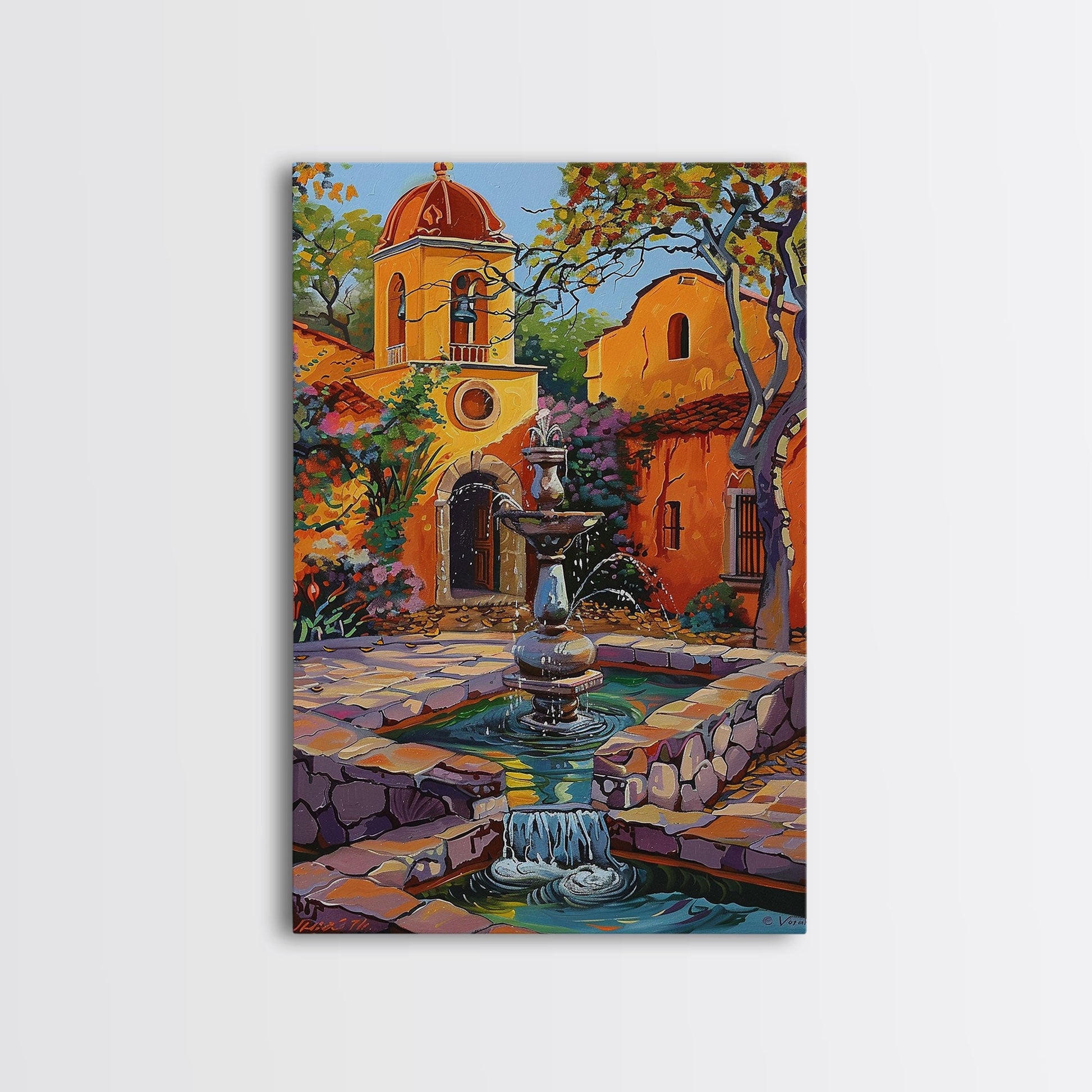 Mexican Style Framed Canvas Print Tall Art Vibrant Outdoor Fountain Scene With Colorful Architecture