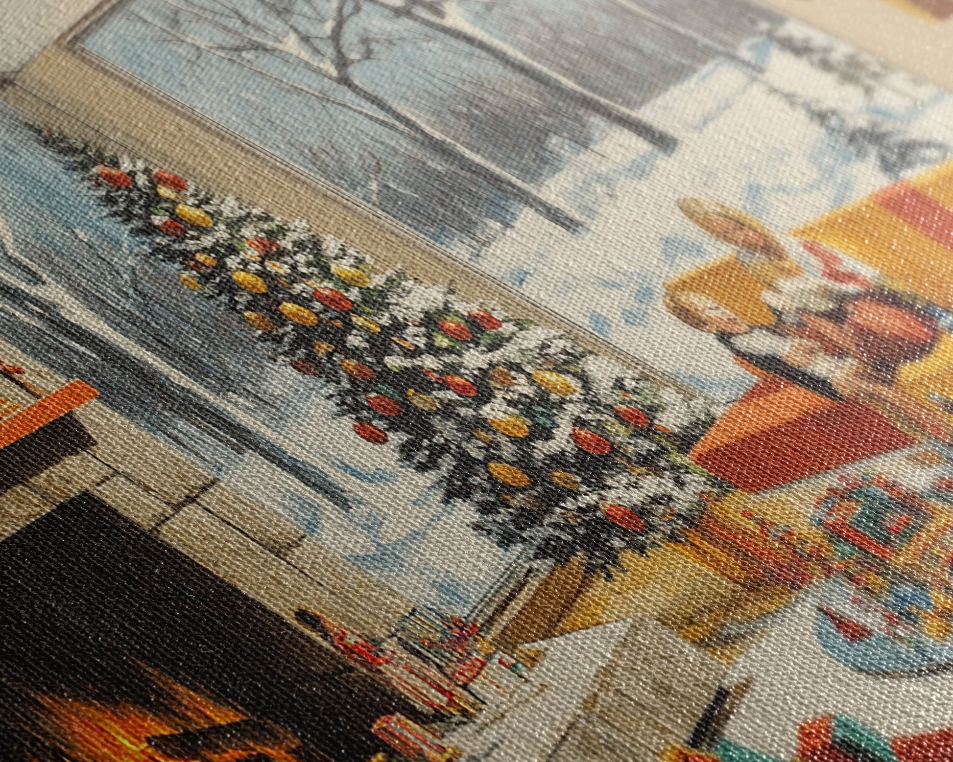 Mid century modern Christmas scene with fireplace and tree, retro Christmas decor, framed canvas print, 1960s Christmas home decor