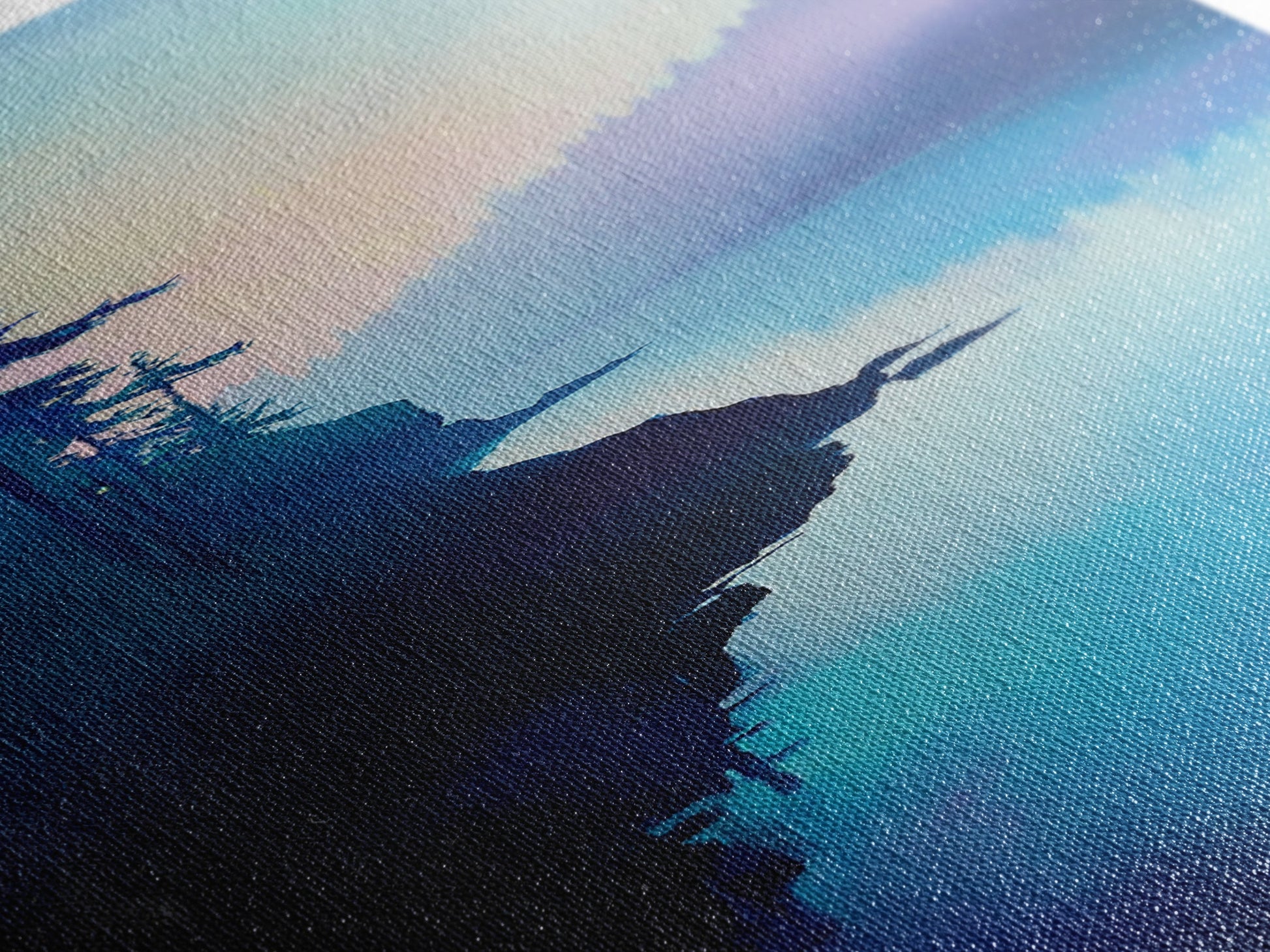 Misty Lake, forest at dusk painting, blue and green wall art, moody art, vertical wall art, pine tree art, framed canvas print