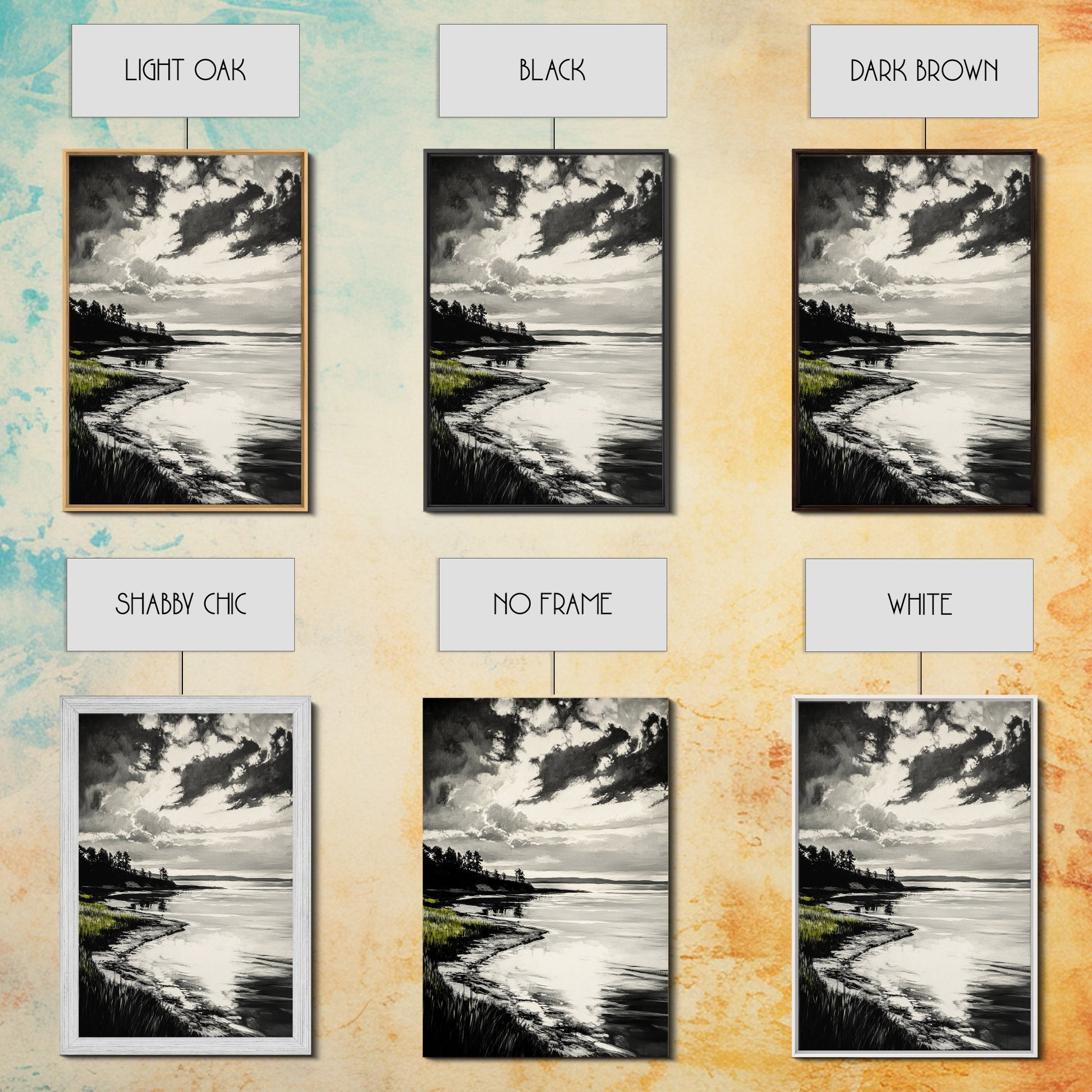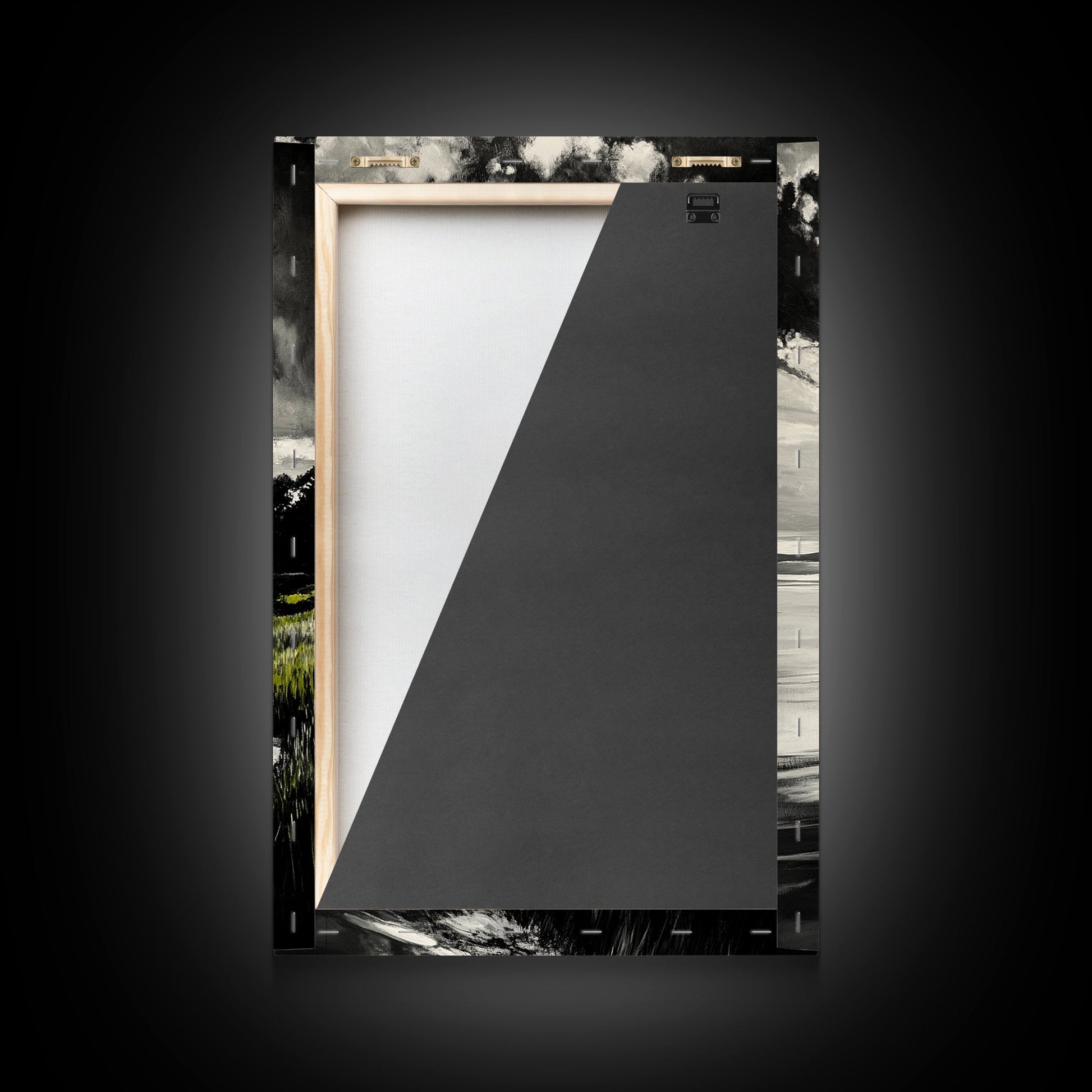 Moody Landscape, Black and White Art, Dramatic Sky, Coastal Scene, Nature Painting, Modern Home Decor, Minimalist Style, Framed Canvas Print