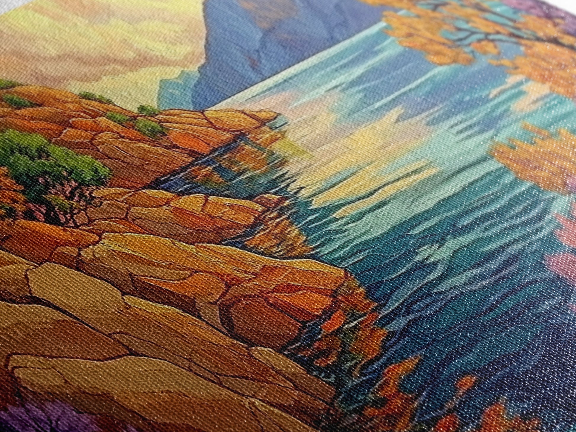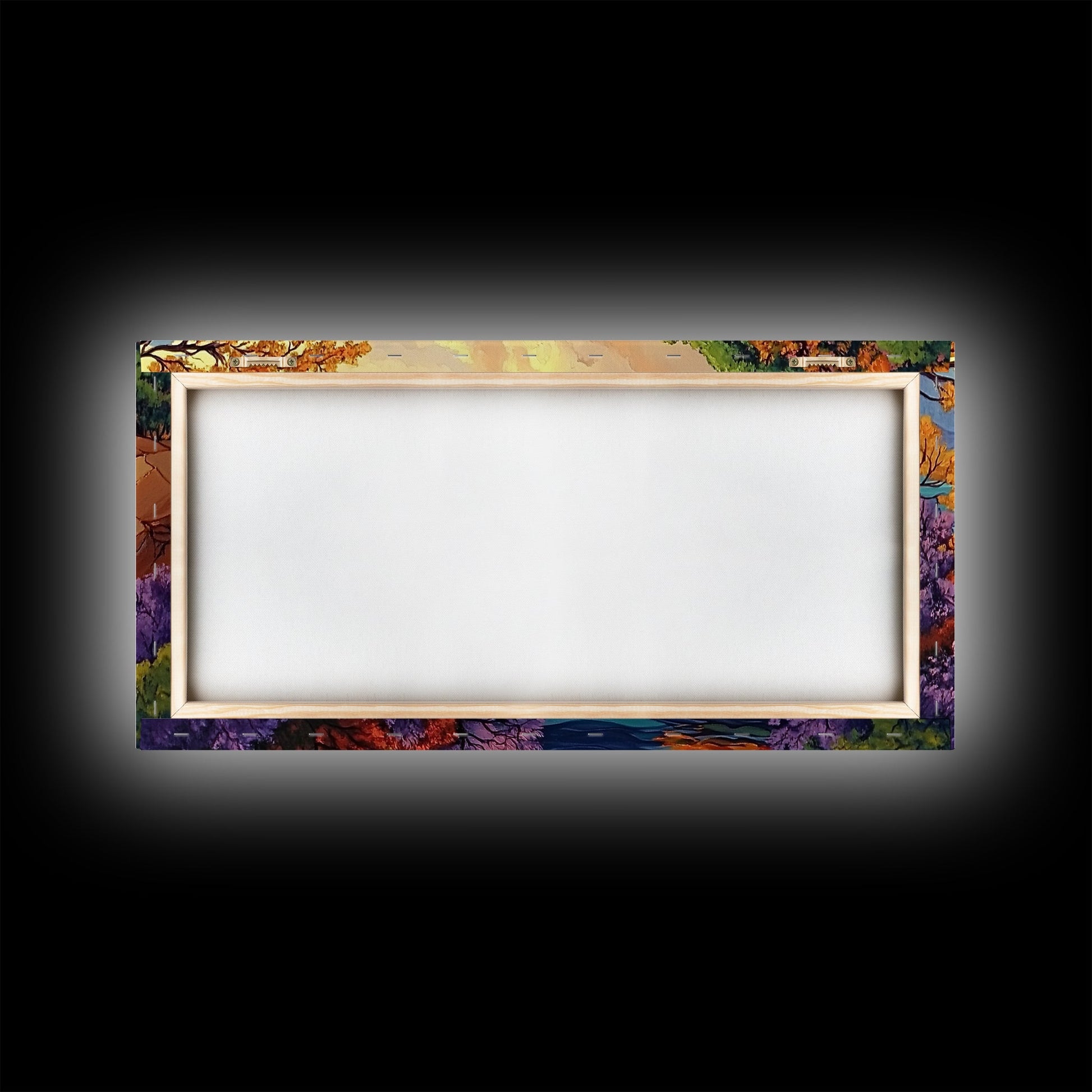 Mountain Lake, Trees, Reflection, Canvas Print with vivid autumn landscape painting, living room wall art, boho nature decor