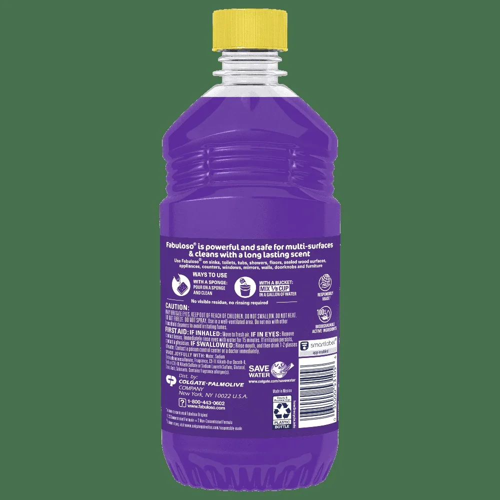 2X concentrated formula provides 2X more active ingredients compared to non-concentrated Original Multi-purpose cleaner for a wide range of surfaces, from floors to furniture to appliances Mix 1/8 cup in a gallon of water or pour on a sponge and clean Lavender scent provides long-lasting freshness Uses 50% less plastic by following dosing instructions to get twice as many uses out of one bottle v. the same size of Original Uses 50% less plastic by following dosing instructions and getting twice as many uses out of 1 bottle vs. same size bottle of ® Original Multi-Surface Cleaner Use ® Multi-Purpose Cleaner on household sinks, toilets, tubs, showers, floors, sealed wood surfaces, appliances, counters, windows, mirrors, walls, doorknobs and furniture Also available in: Refreshing Lemon Scent, Passion of Fruits Scent, Citrus & Fruits with Baking Soda Scent, Bleach Alternative† Spring Fresh Scent Scent, Tropical Spring Scent, and Orange Scent with Baking Soda † Bleach-free option with 20% more active ingredients vs other ® 2X Concentrated Liquid Multi-Purpose Cleaning Products ® 2X Concentrated Liquid Multi-Purpose Cleaner comes in a variety of convenient sizes: 16. 9oz, 28oz, 33. 8oz, 56oz, 128oz, 169 oz, 210oz. Fruity scent