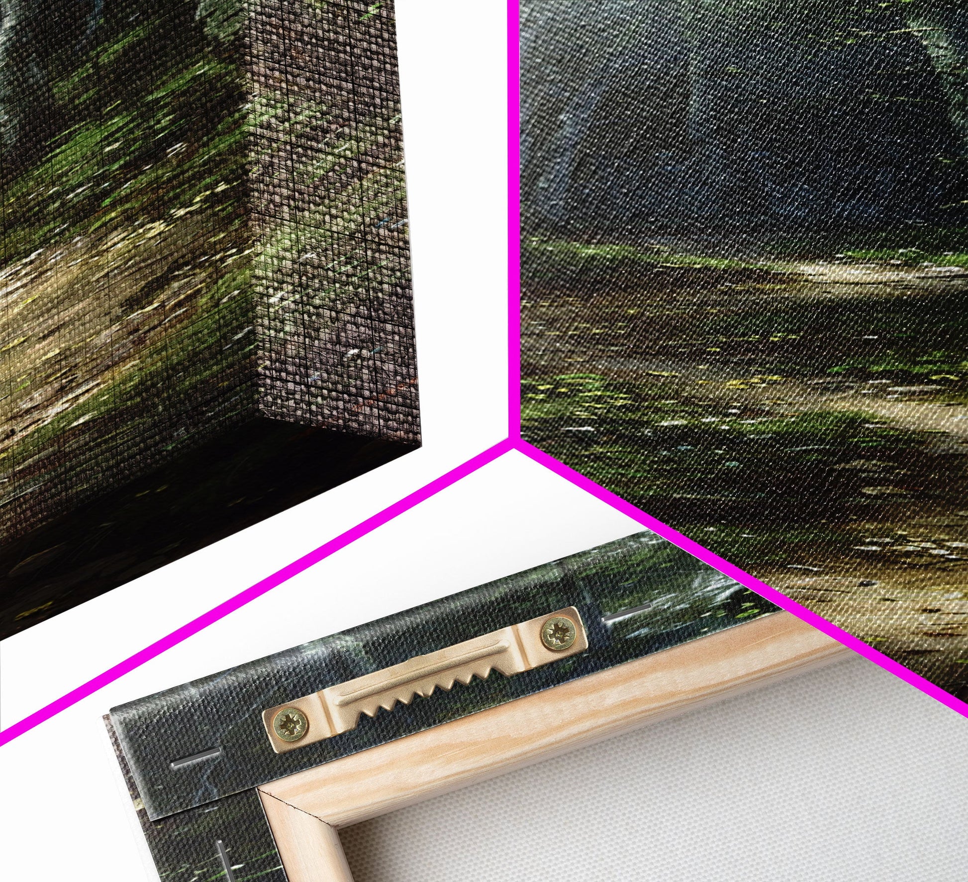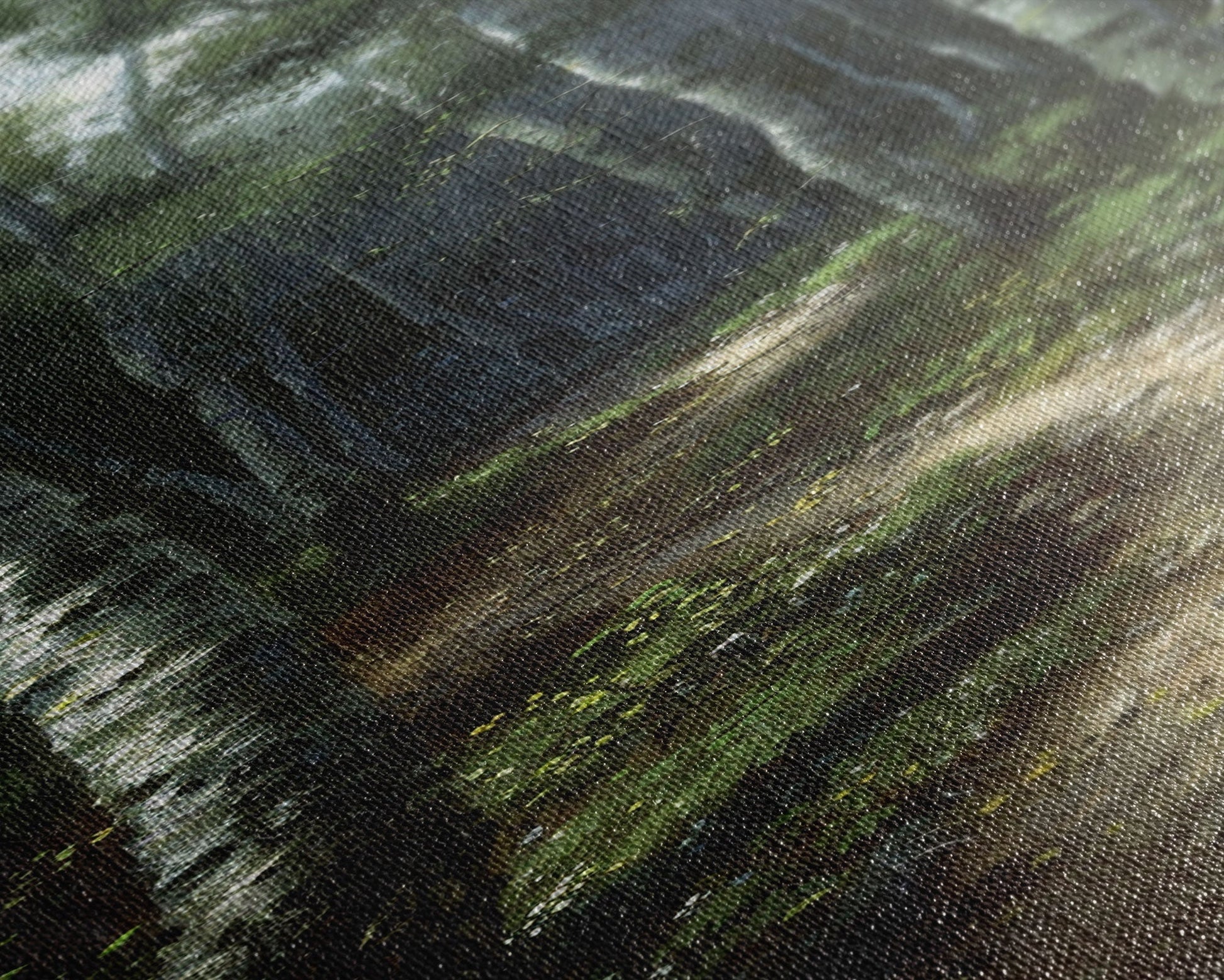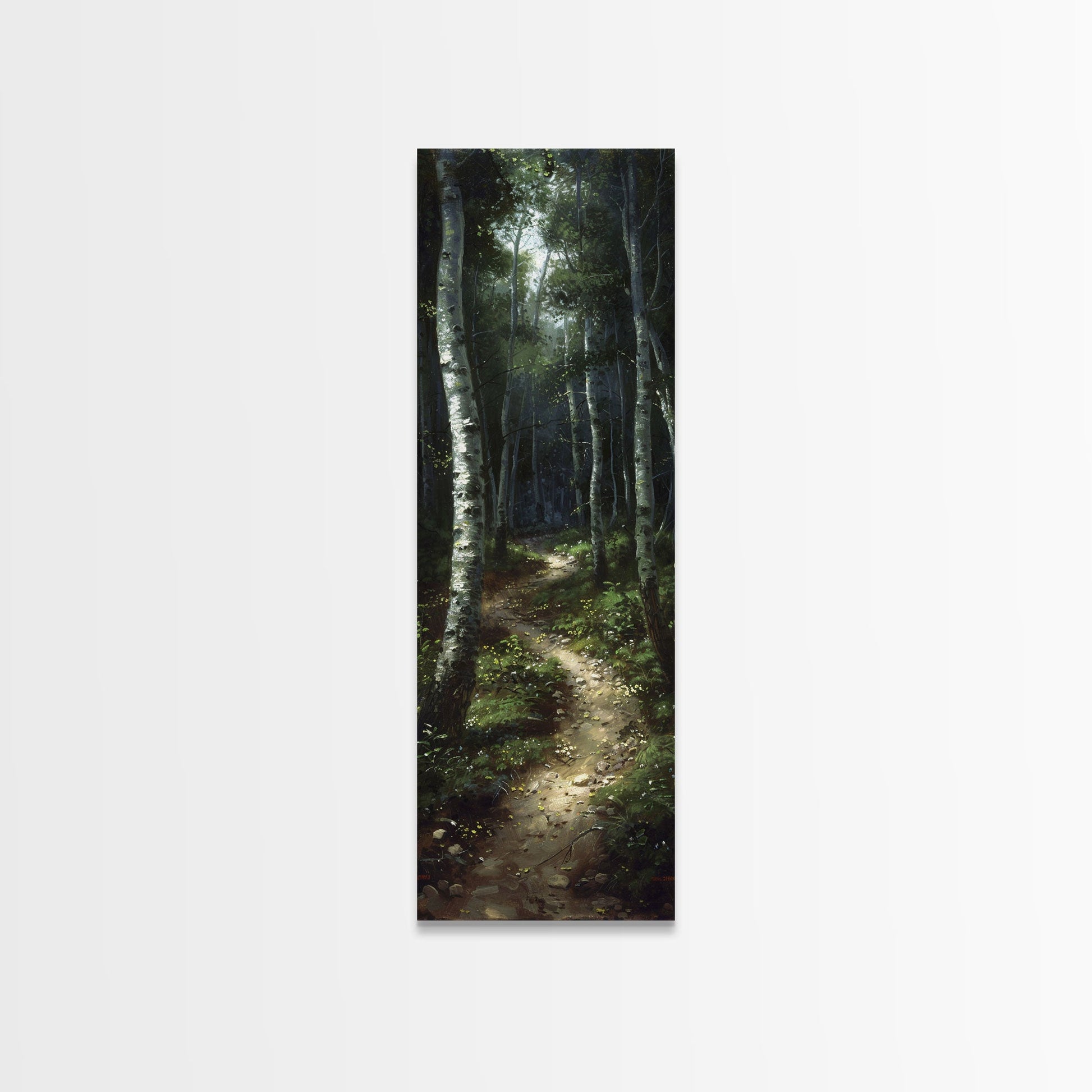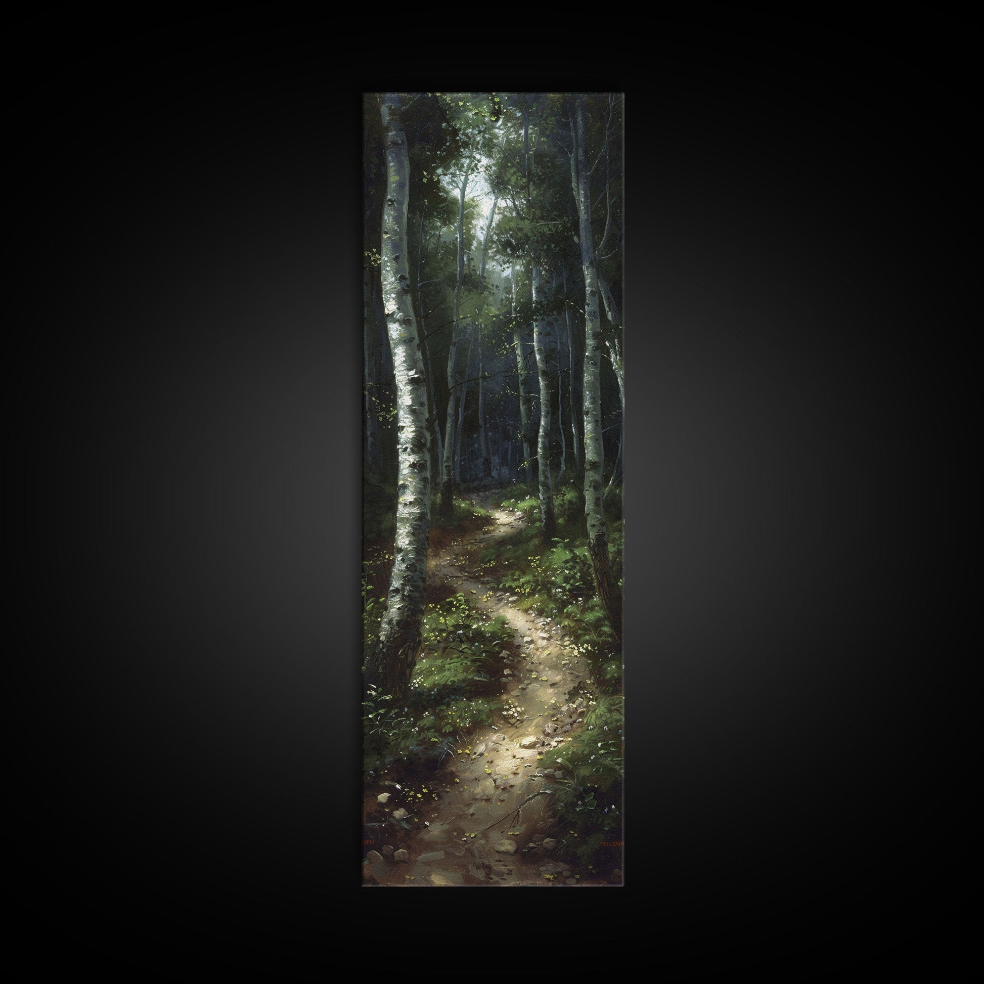 Mysterious Birch Forest Path Tall Skinny Art Framed Canvas Print for Serene and Calming Wall Decor in Homes or Offices