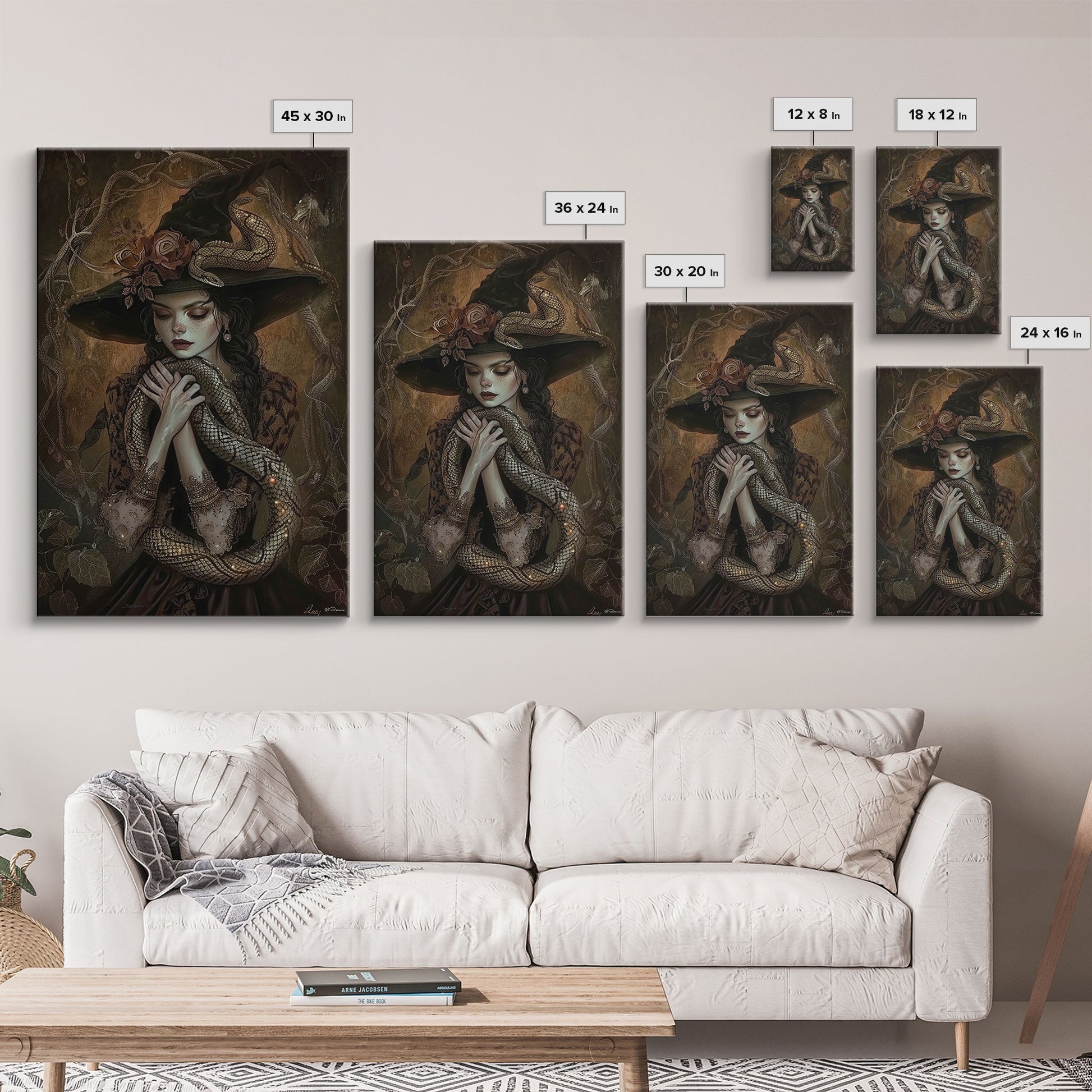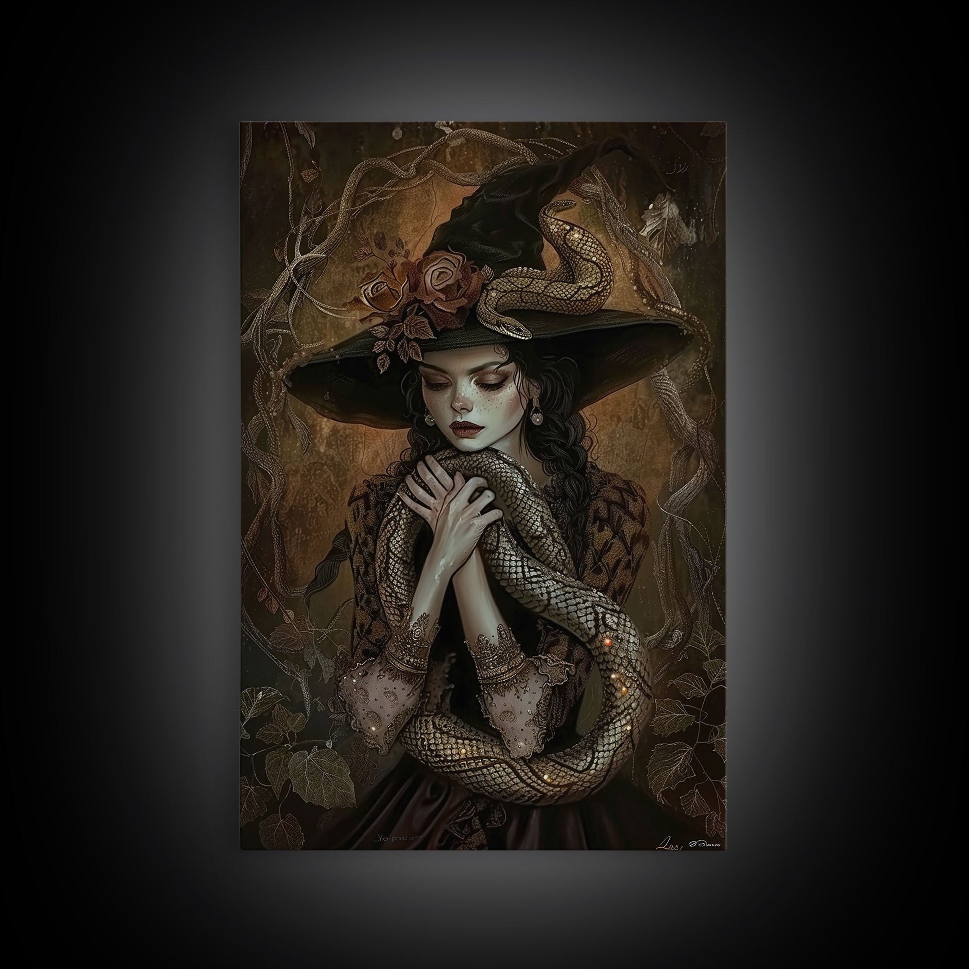 Mysterious Witch Holding Snake, Framed Canvas Print, Gothic Witch Art, Dark Fantasy Decor, Witch and Serpent, Halloween Accessories