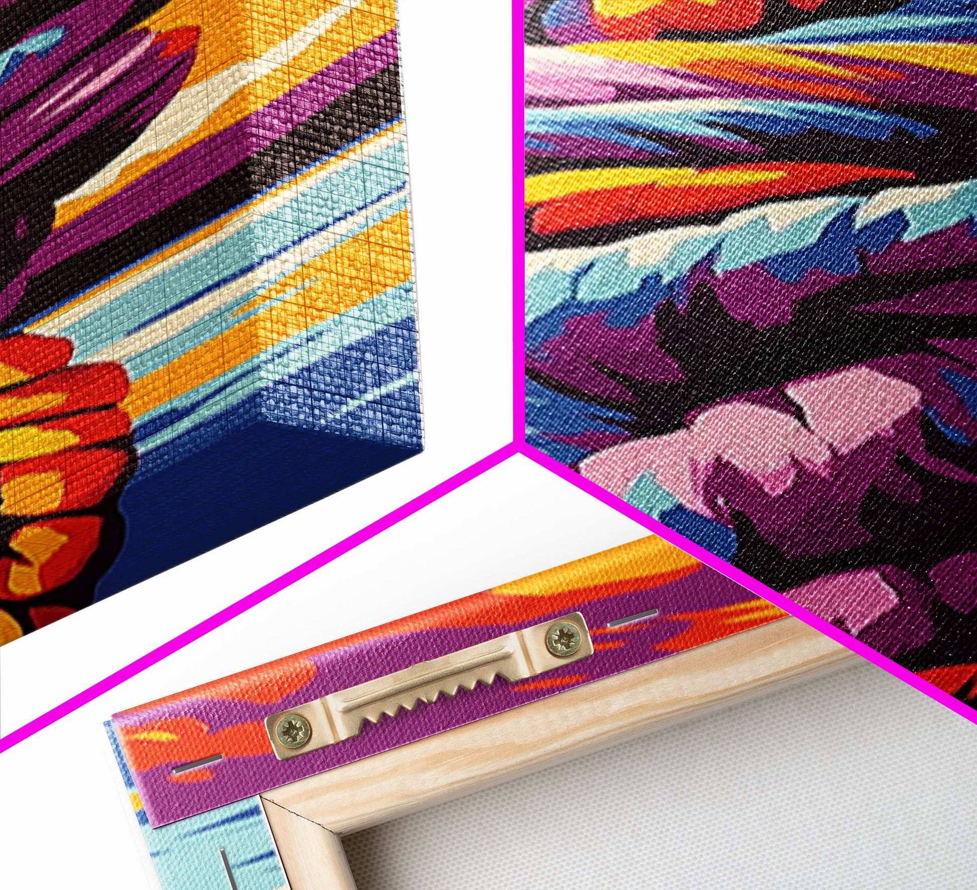 Hello and thank you for taking the time to view our modern high quality giclée artwork! We offer both posters and stretched canvas prints. Our posters are printed on Ultra Matte 60 lb / 230 GSM high quality photo paper, with a thickness of 10 mil. Our canvases are printed on museum grade 350 GSM canvas material with ECO friendly archival grade ink, then hand stretched and stapled over premium, FSC certified and shrink resistant frames. Designed and built to last a lifetime.