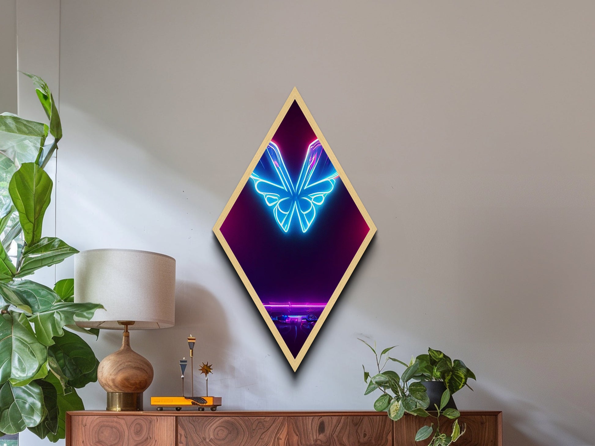 Neon Butterfly Pulse – Diamond Shaped Futuristic Glow Canvas Embossed Print, Cyberpunk Wall Art, Vaporwave Lighting Aesthetic