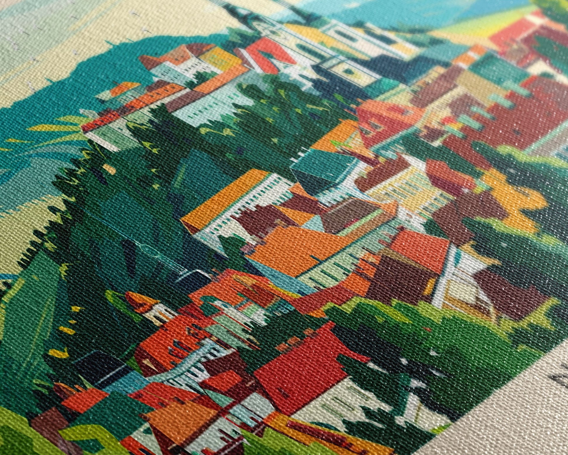 Most of our canvases are made in the USA, with the exception of canvases ordered with the light oak unstained frames, and any large canvases (24x48, 30x60, 16x48 and 20x60) ordered WITH a frame. These are temporarily made in and shipped from Europe, while we try to find a more consistent supplier in the USA.