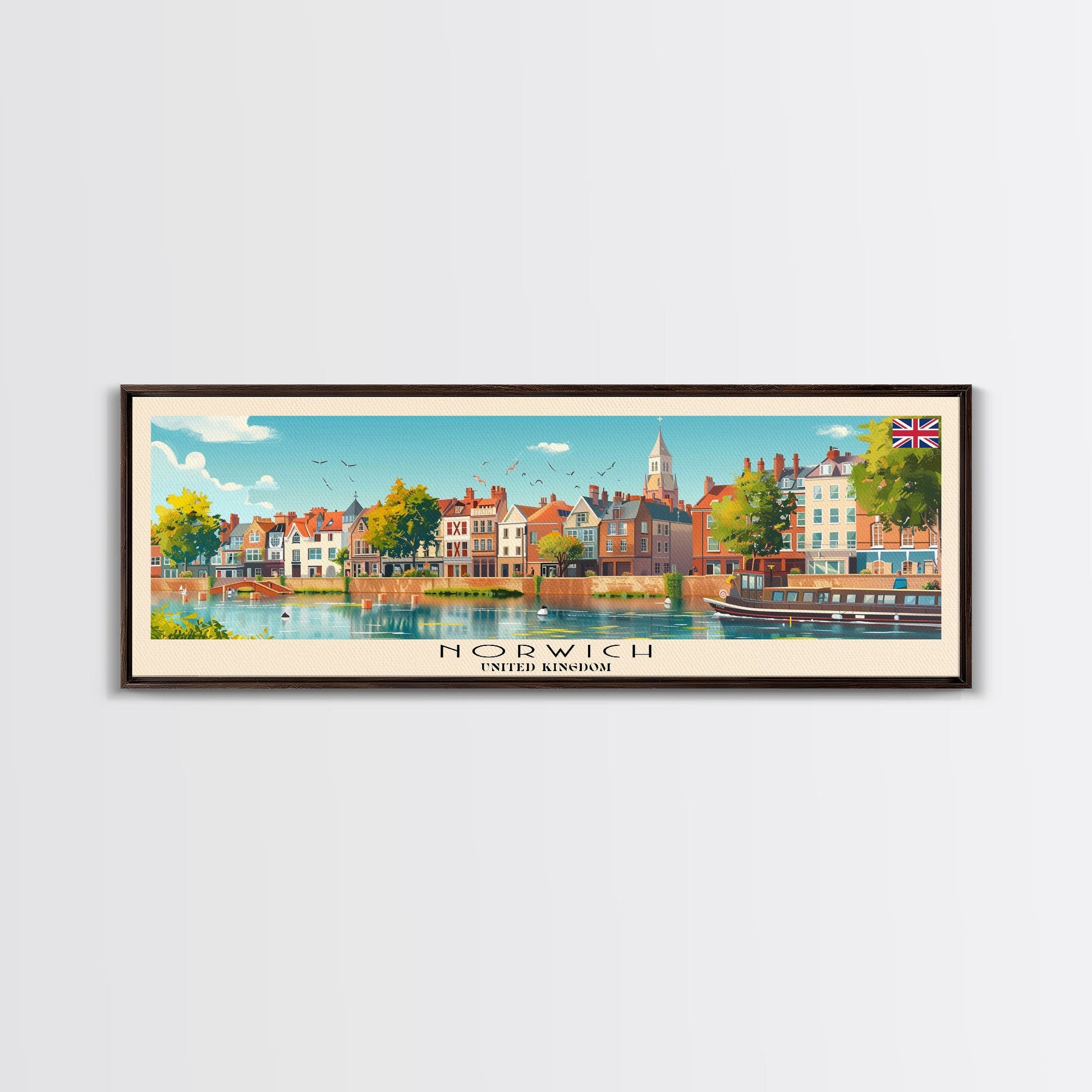 Norwich United Kingdom Panoramic Travel Poster, Framed Canvas Print or Metal Wall Art, Travel Art, Home Decor, Panoramic Painting, Midcentury Art