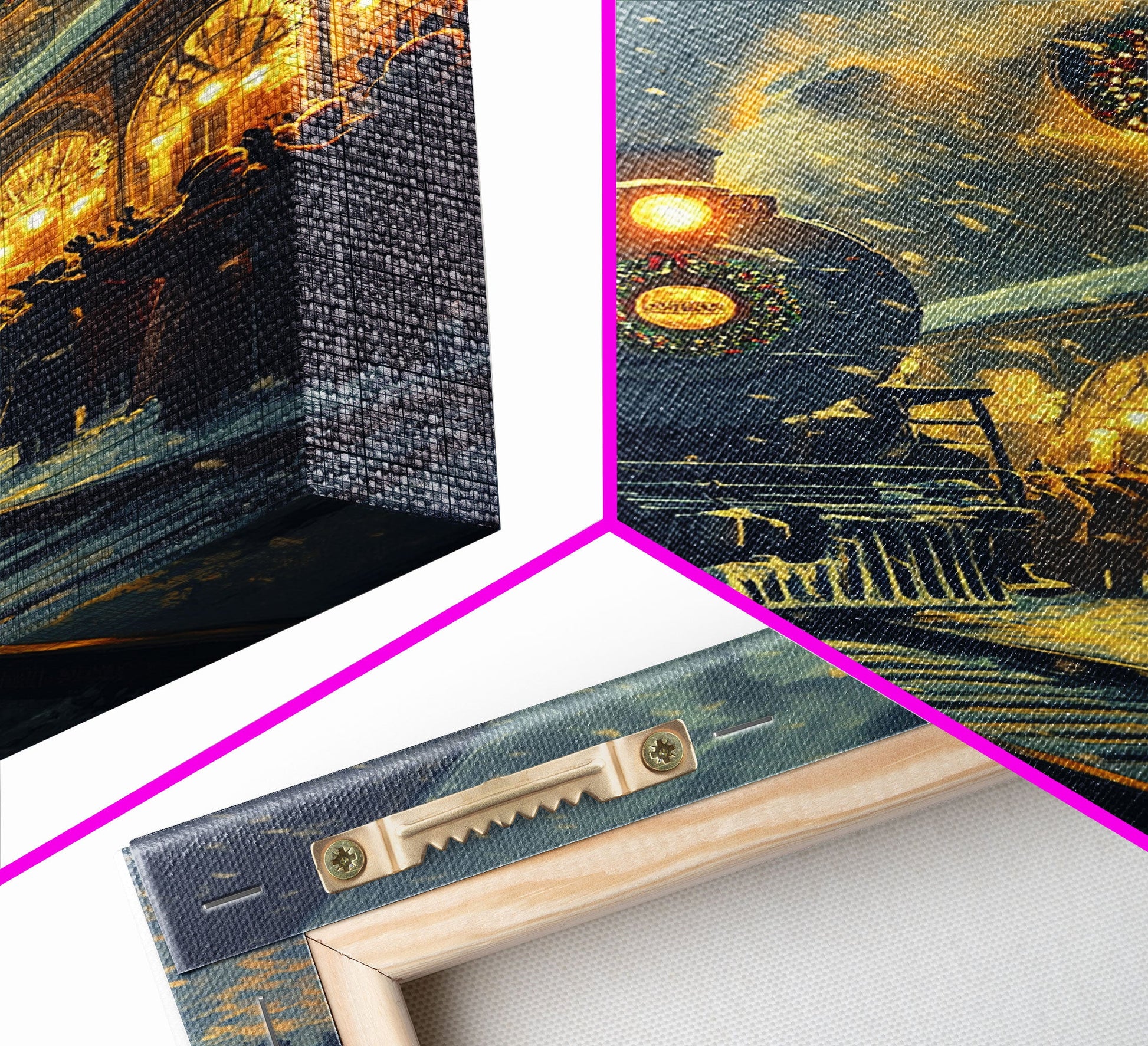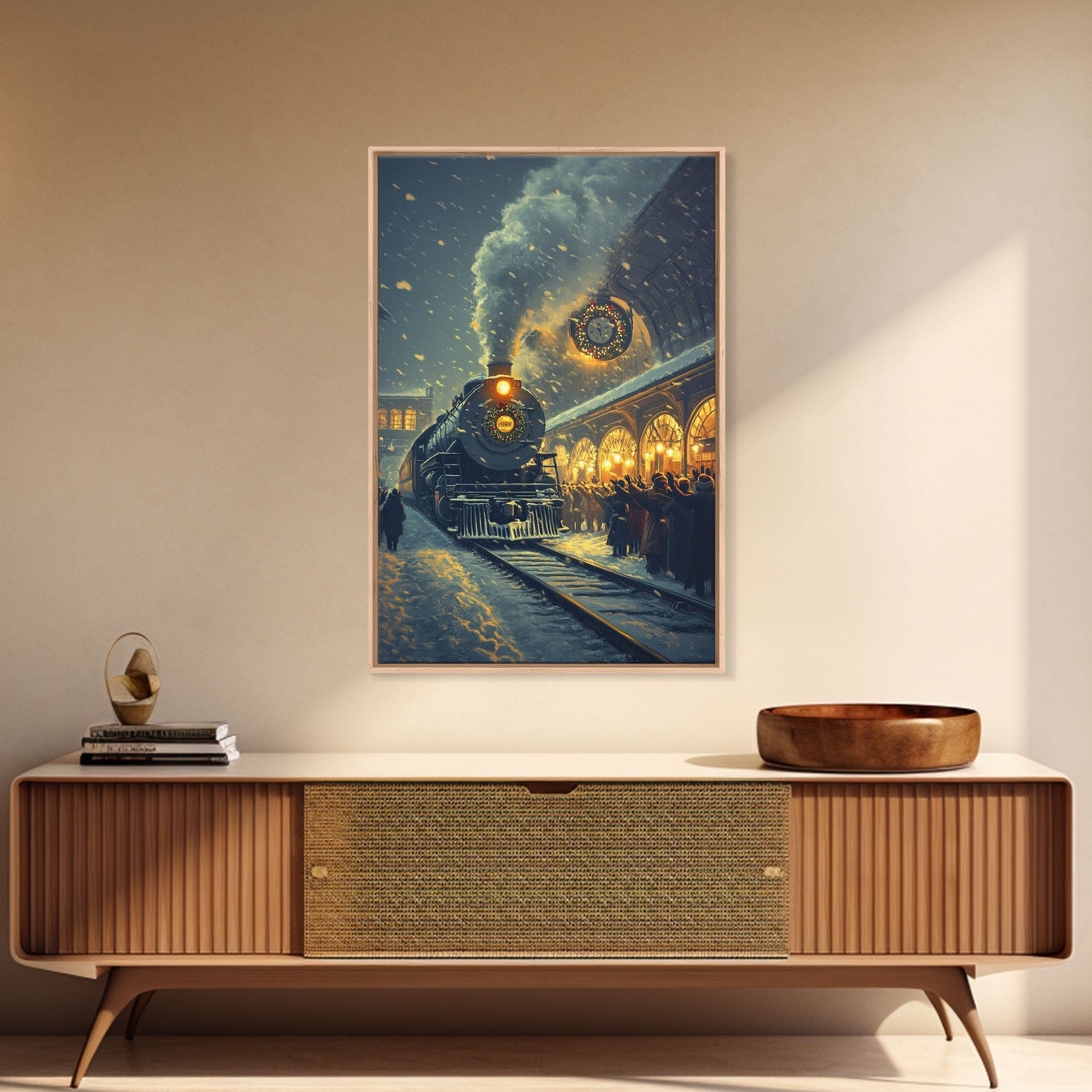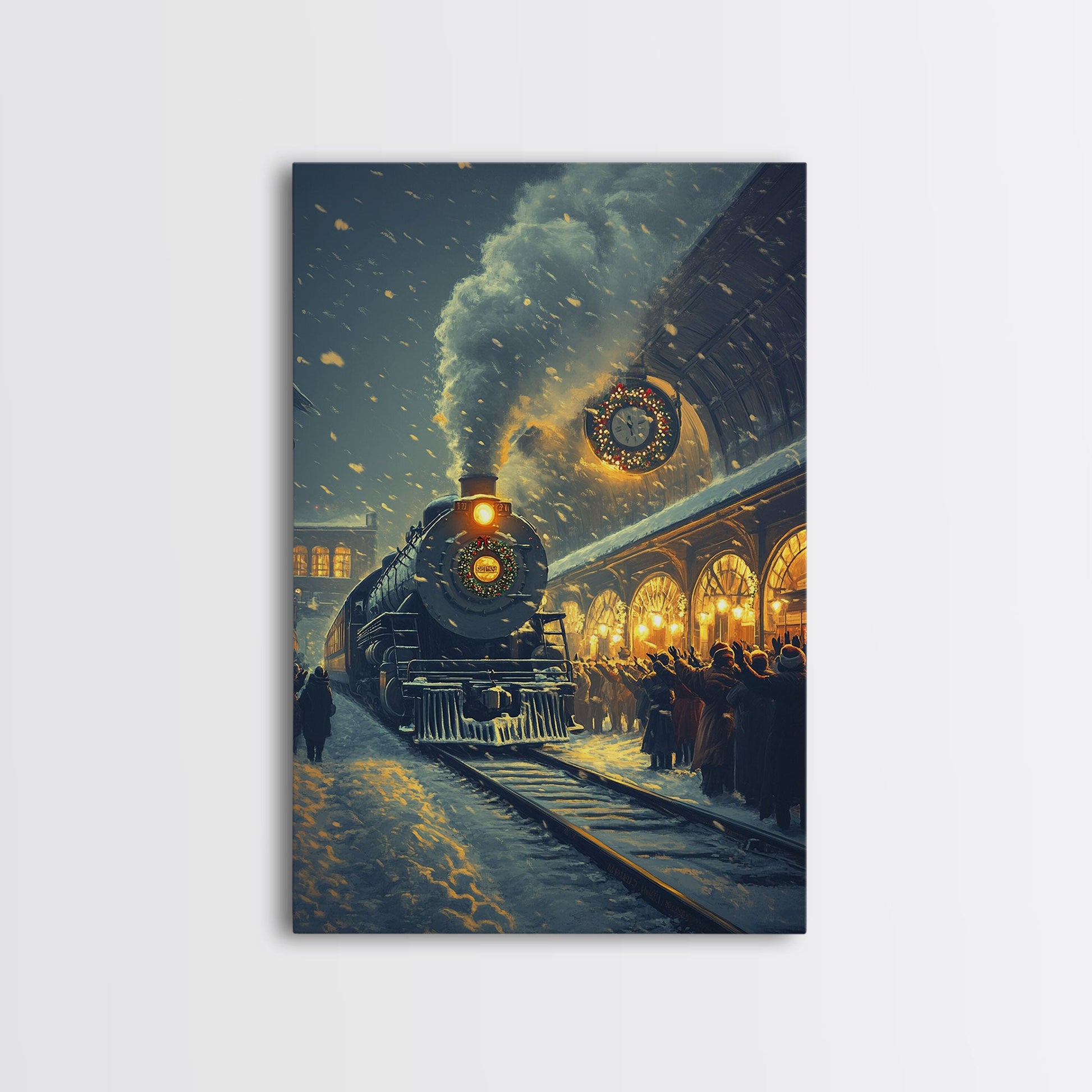 Nostalgic Christmas Train Station Scene in Snowy Winter Night, Ideal for Holiday Decor, Framed Canvas Print