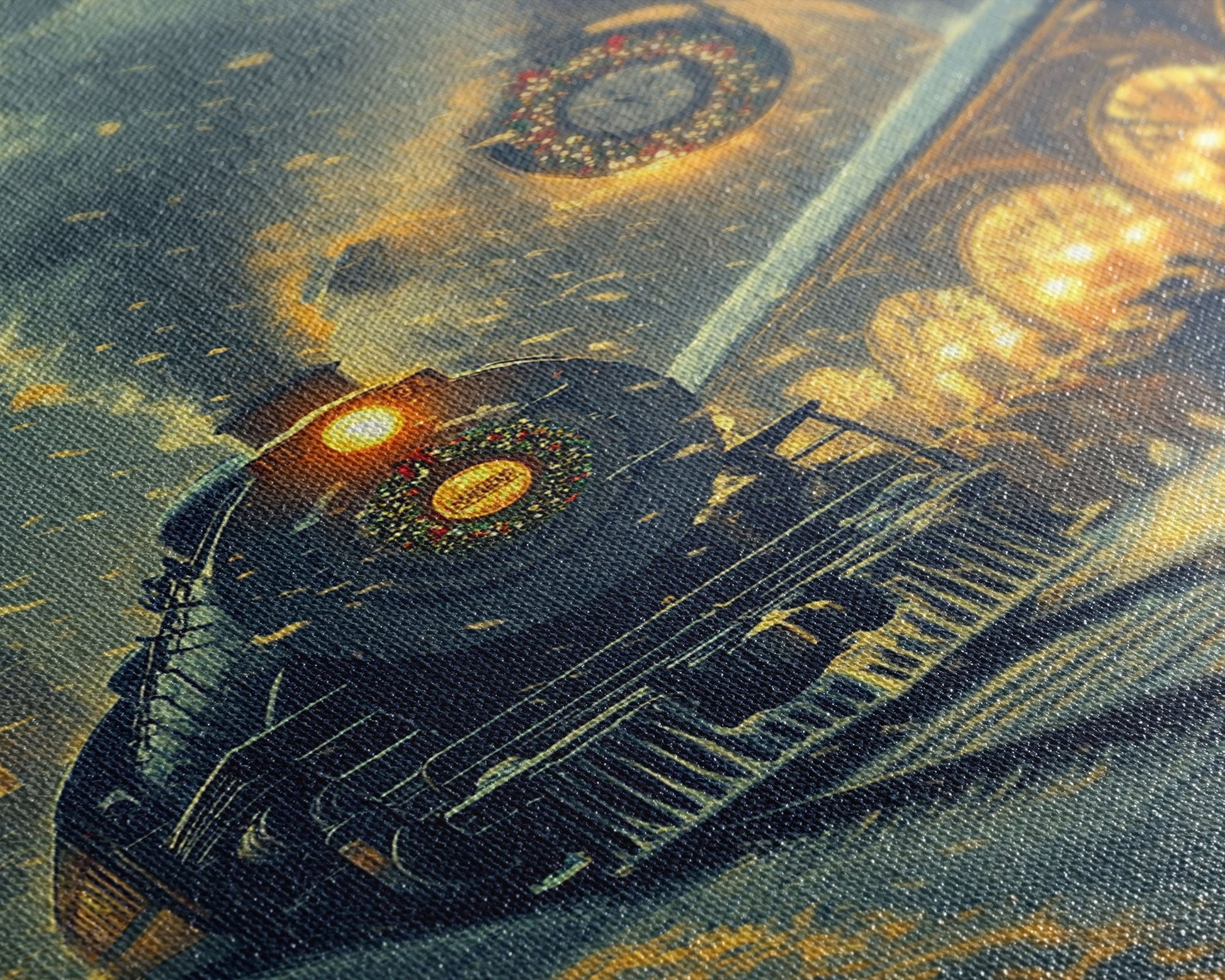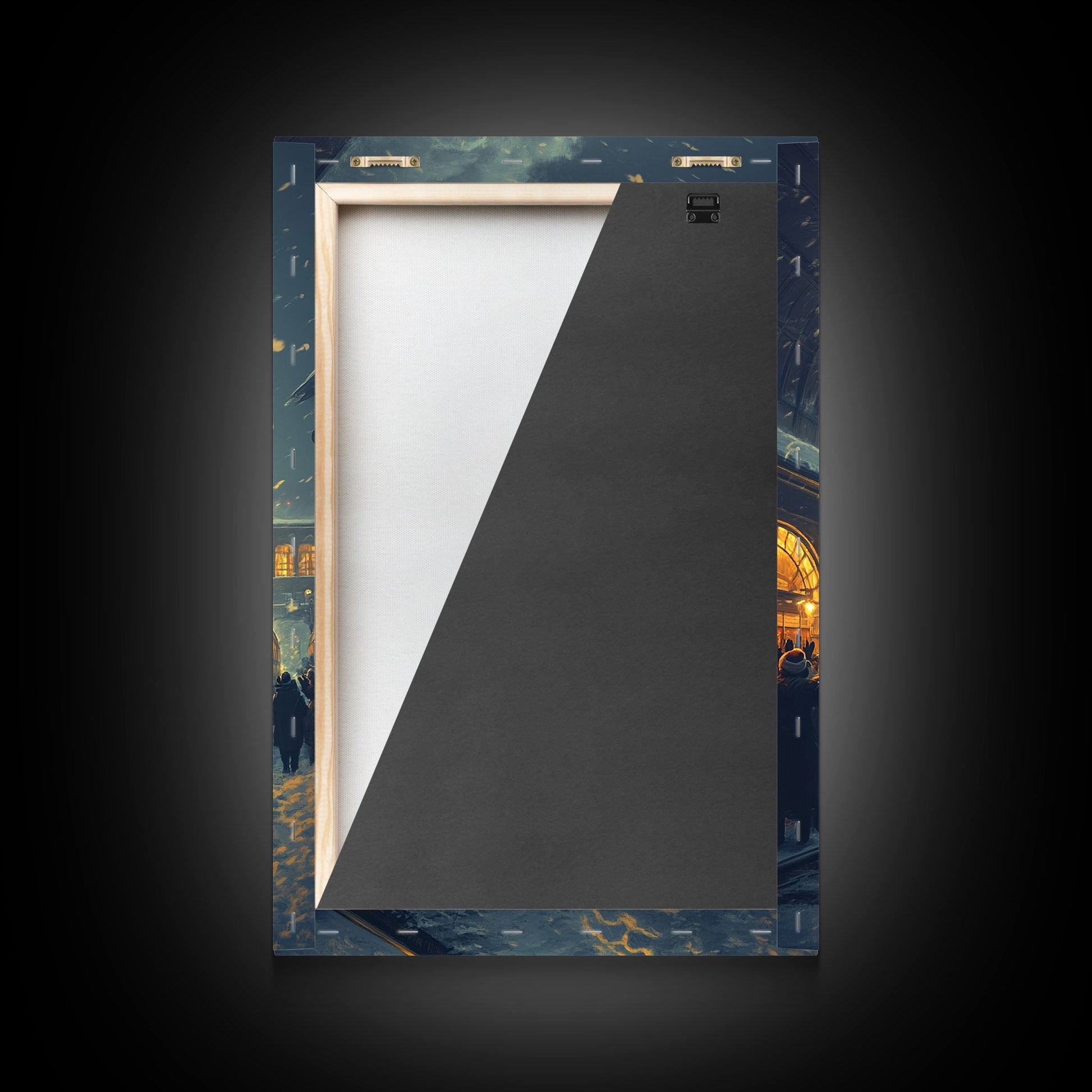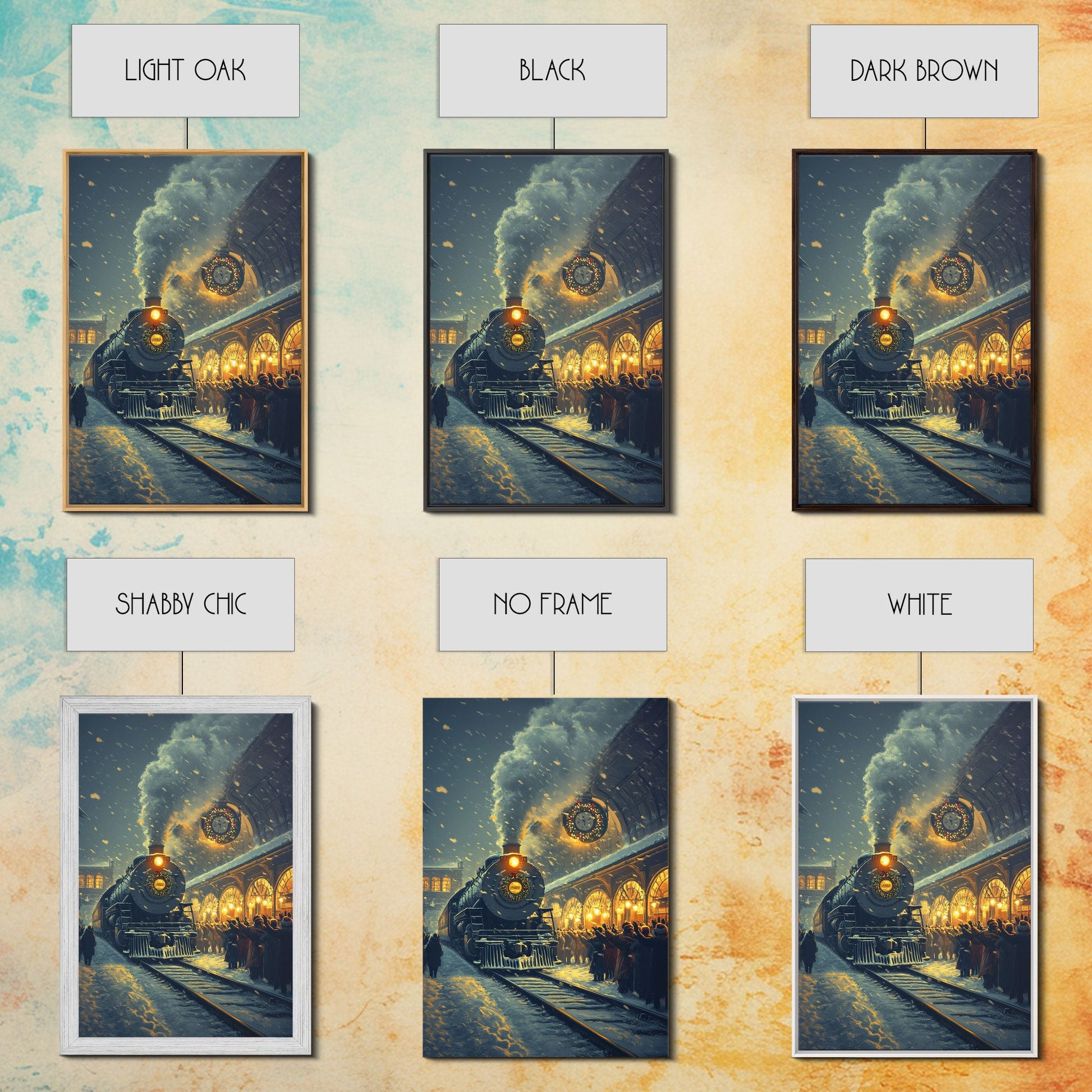 Nostalgic Christmas Train Station Scene in Snowy Winter Night, Ideal for Holiday Decor, Framed Canvas Print