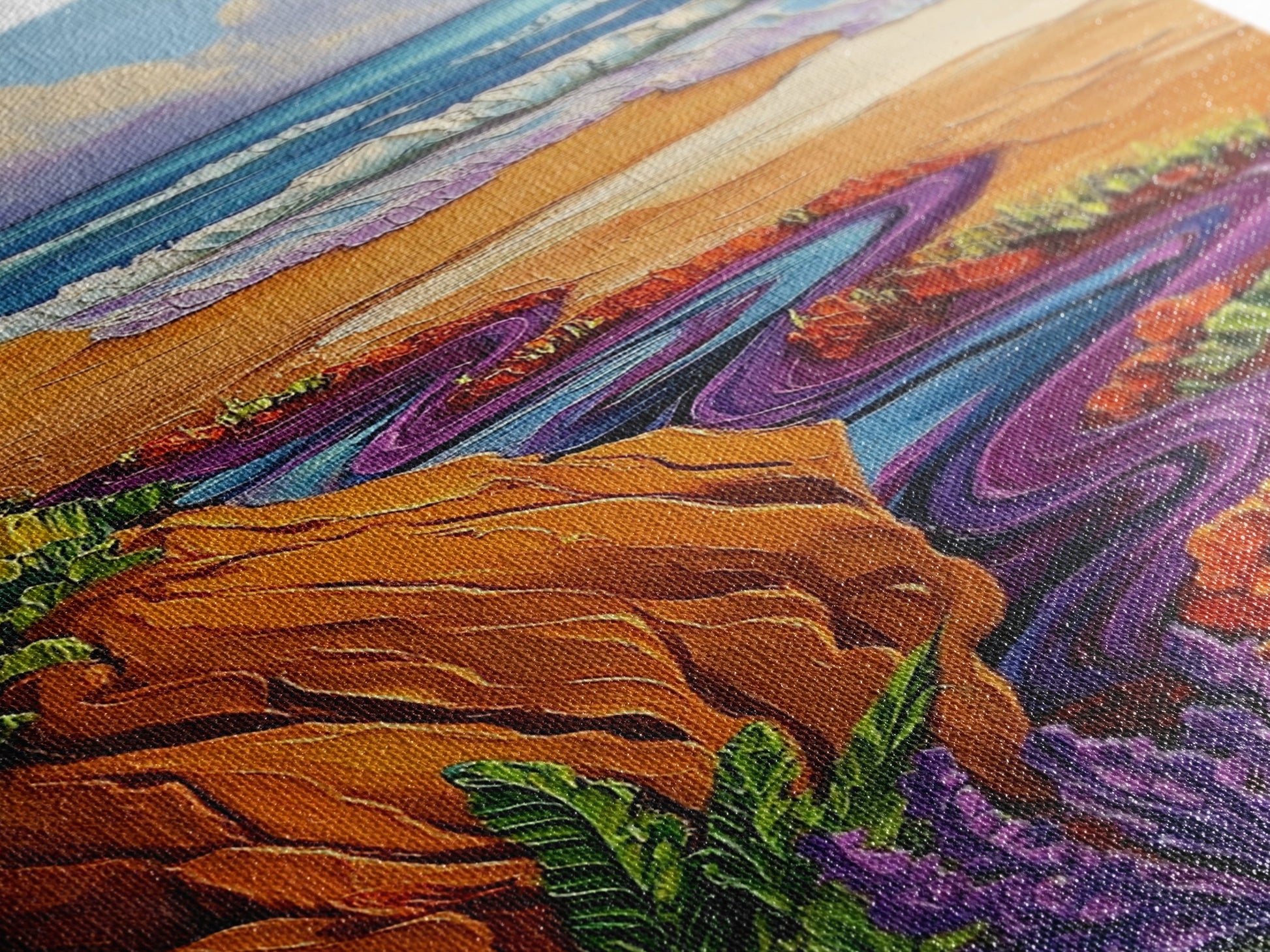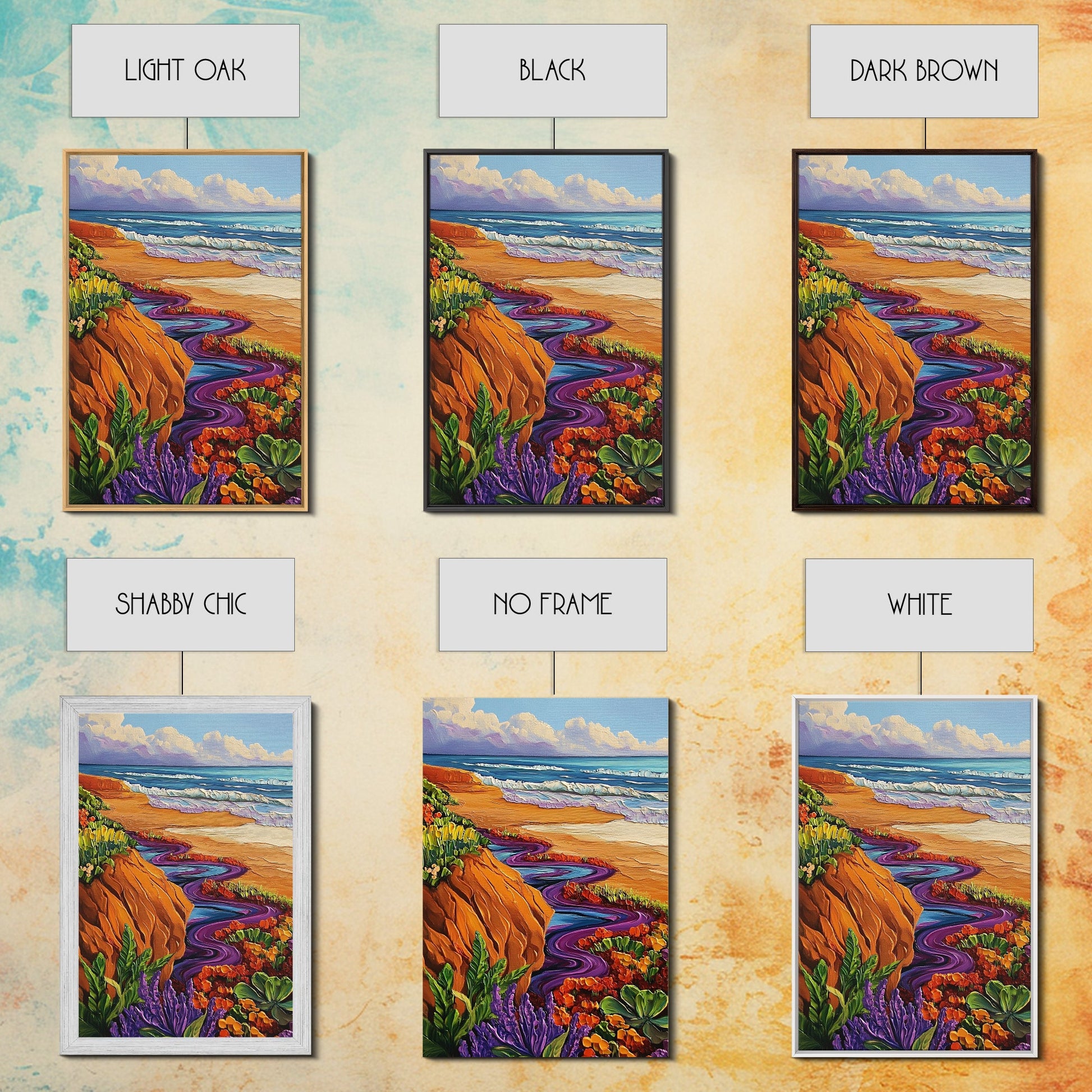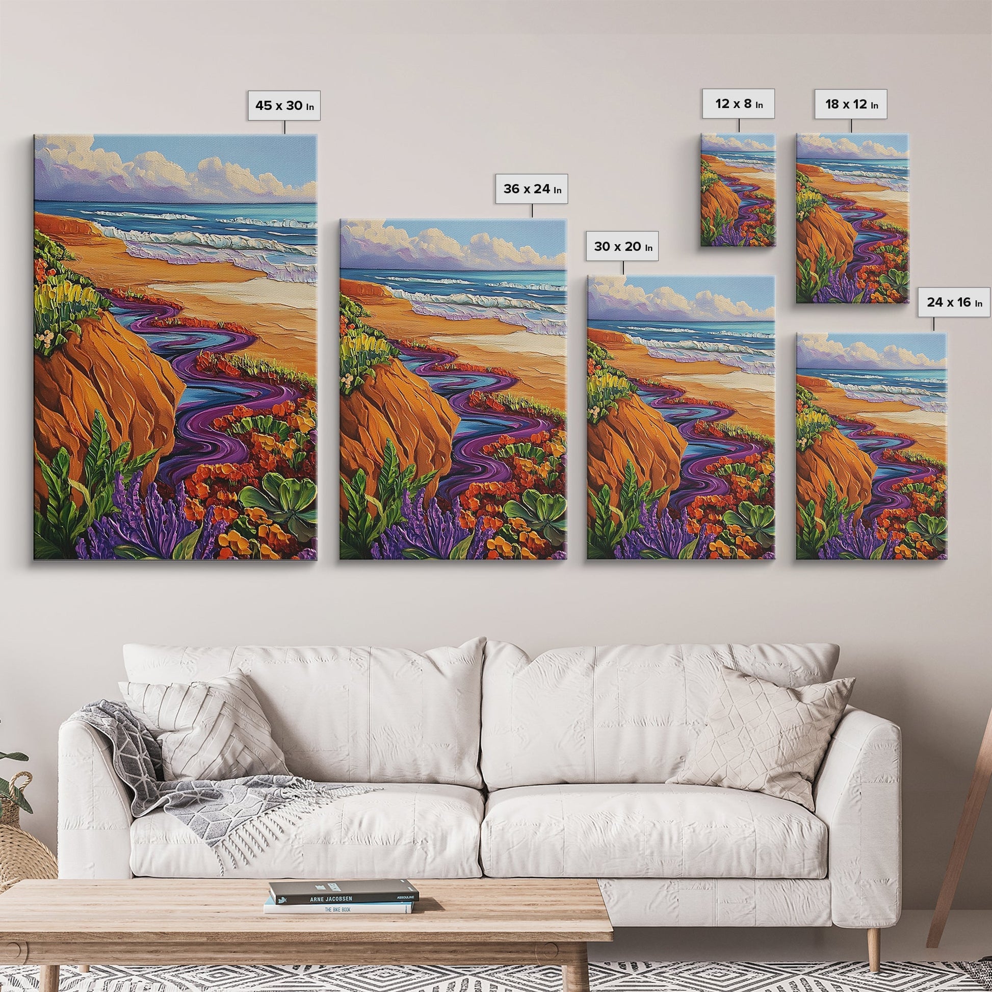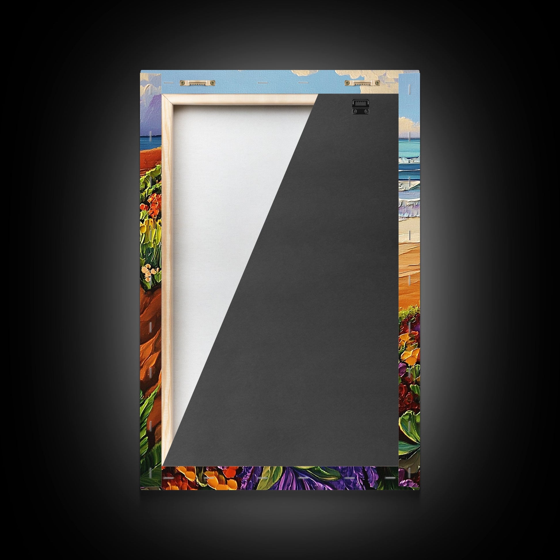 Ocean Cliffside, Floral, Seascape, Framed Canvas Print, Coastal Nature Wall Art, Bold Botanical Beach Decor, Bathroom Accent Piece