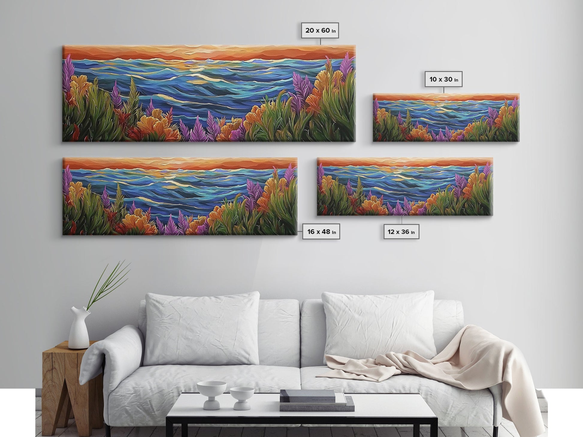 Ocean Horizon, Sunset Sea, Flower Garden, Nature Escape, Canvas Print, Beach House Decor, Tropical Seascape Wall Art