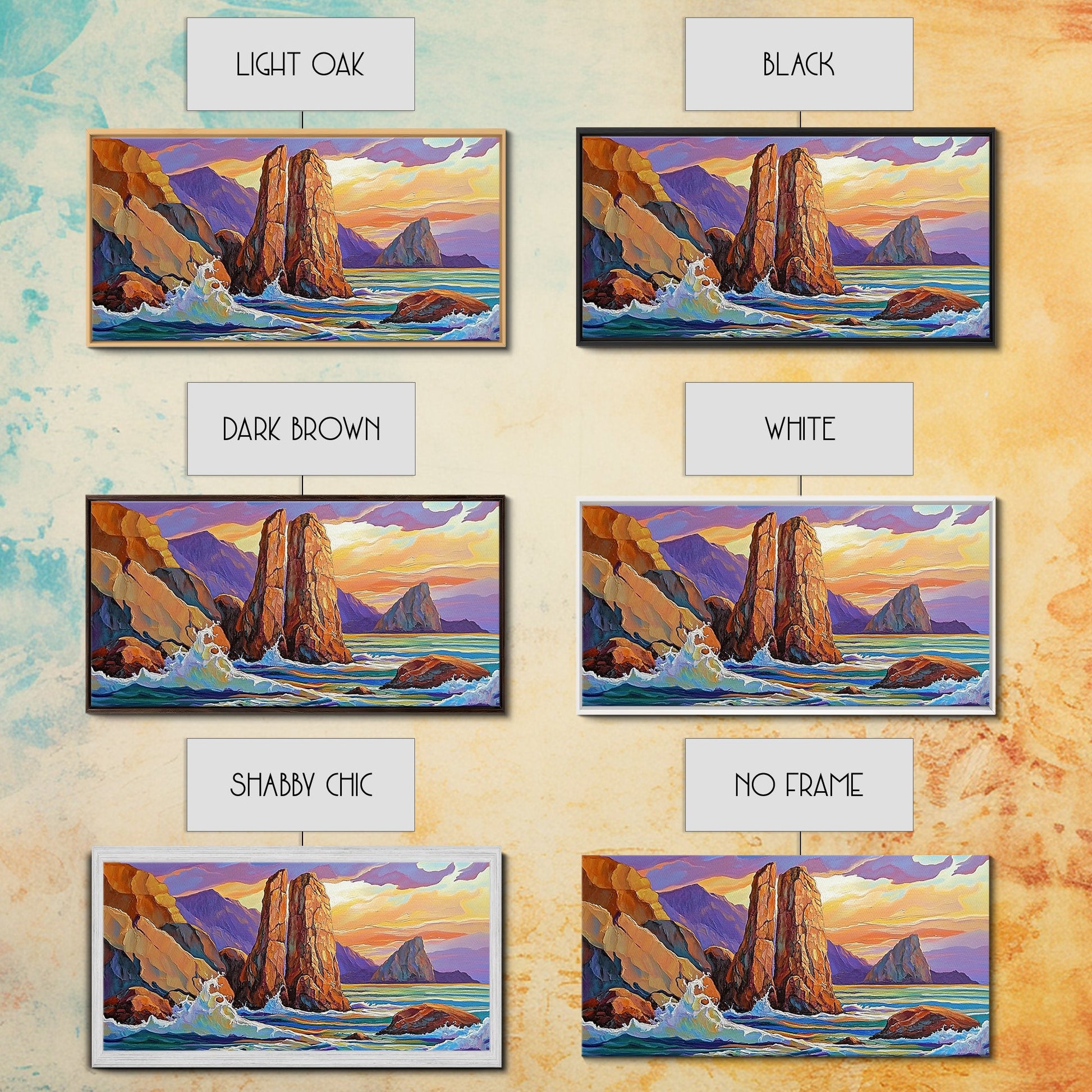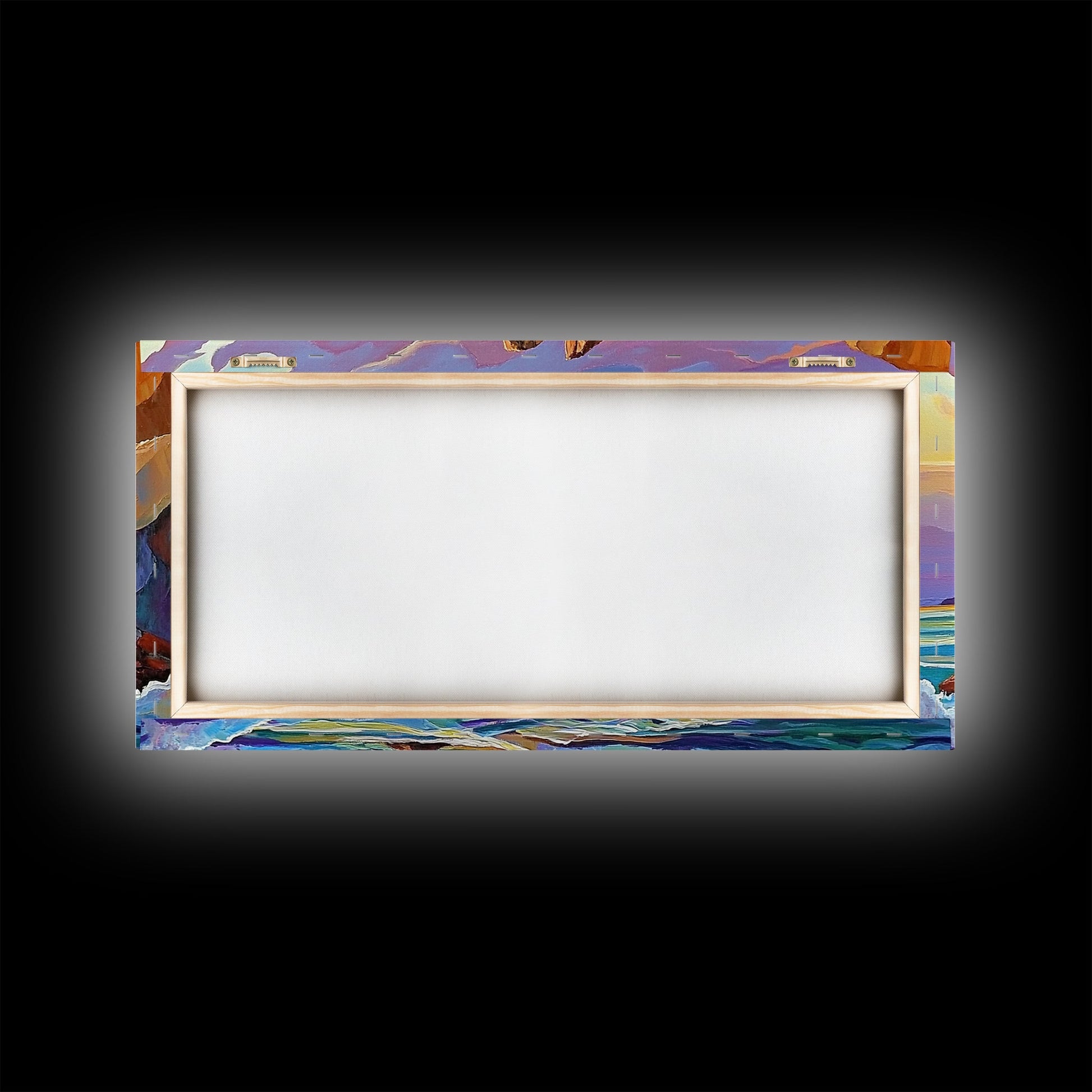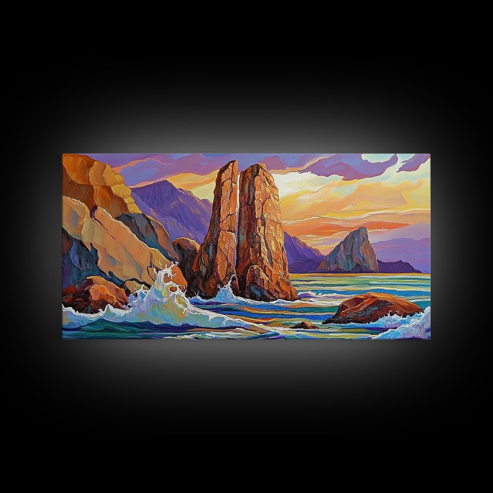 Ocean Rocks, Waves, Sunrise, Framed Canvas Print, Coastal Landscape Art, Nautical Beach Wall Decor, Ocean Sunset Art, Bedroom Accent