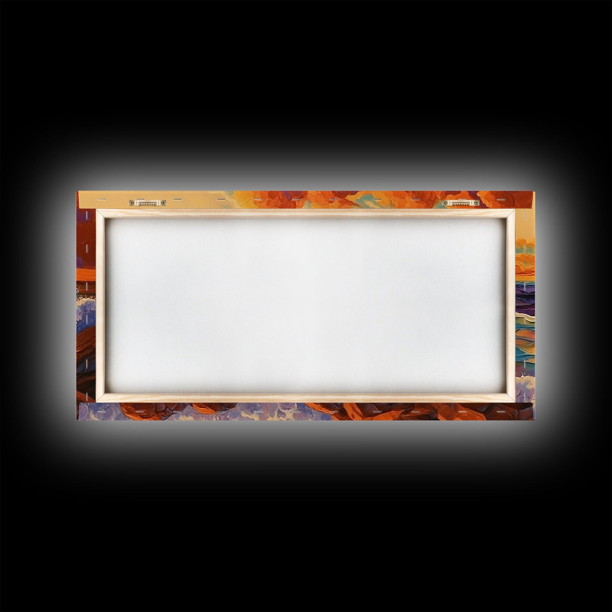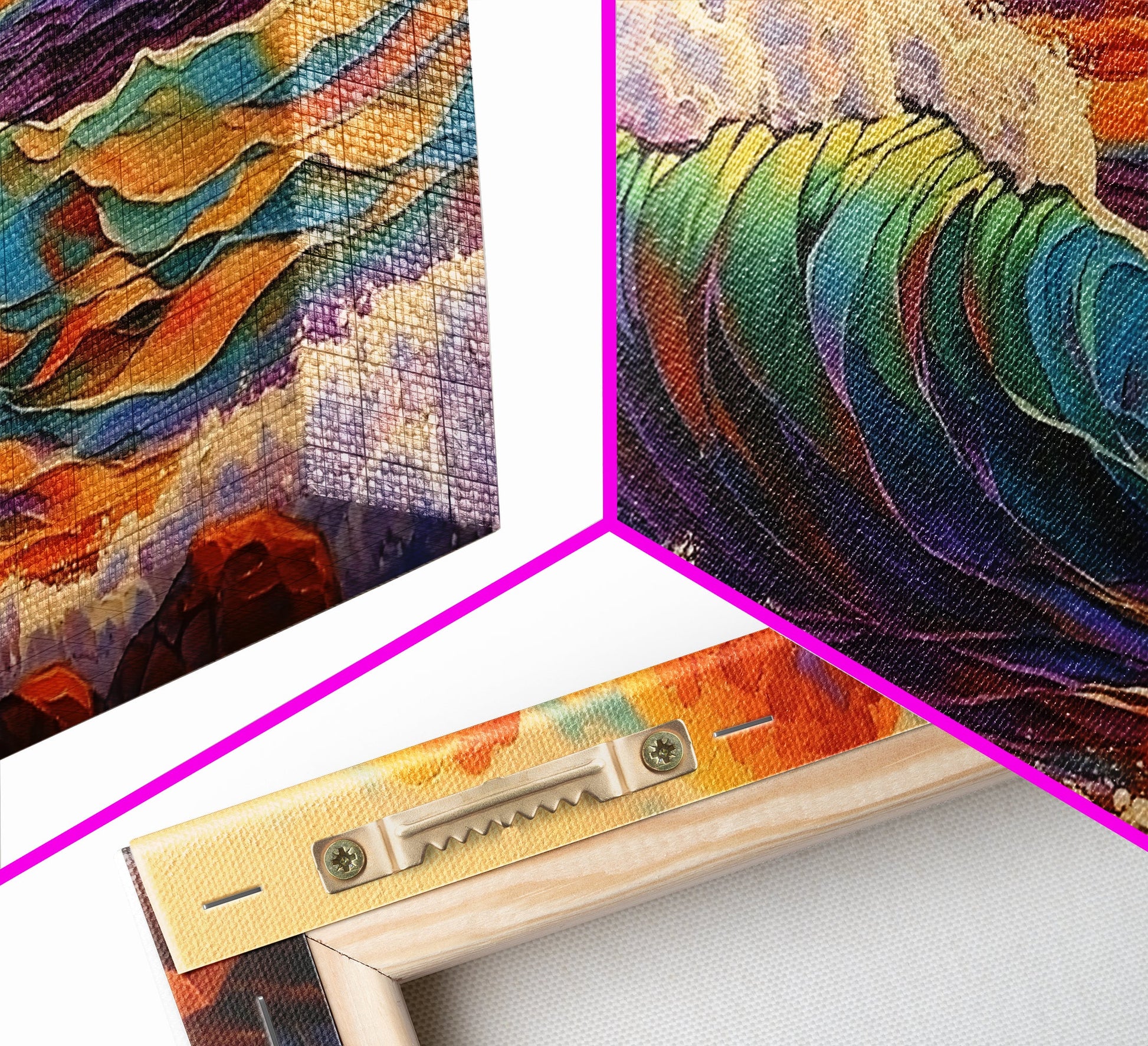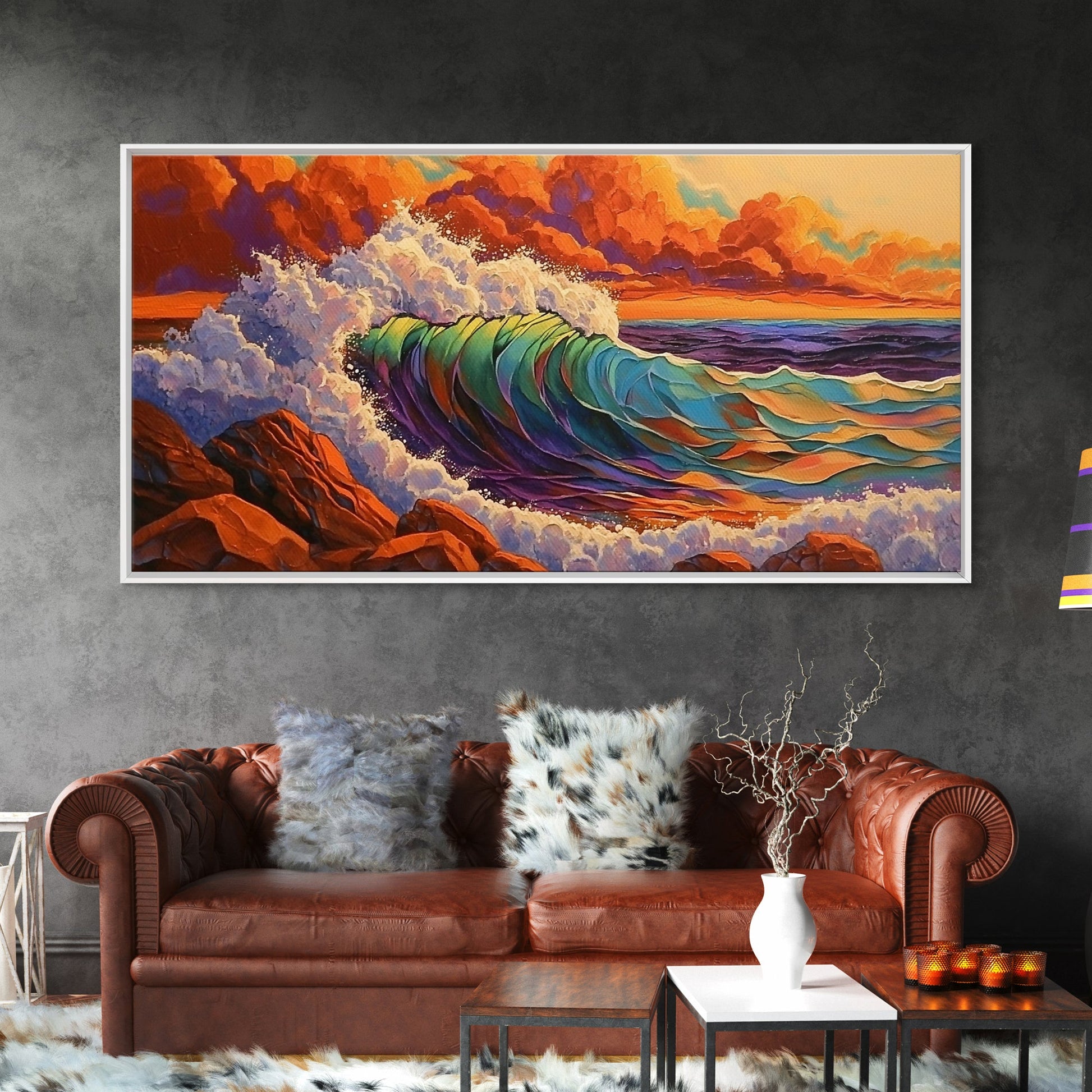 Ocean Wave, Sunset, Crashing Surf, Framed Canvas Print, Colorful Coastal Art, Living Room Wall Decor, Seaside Painting, Bold Landscape