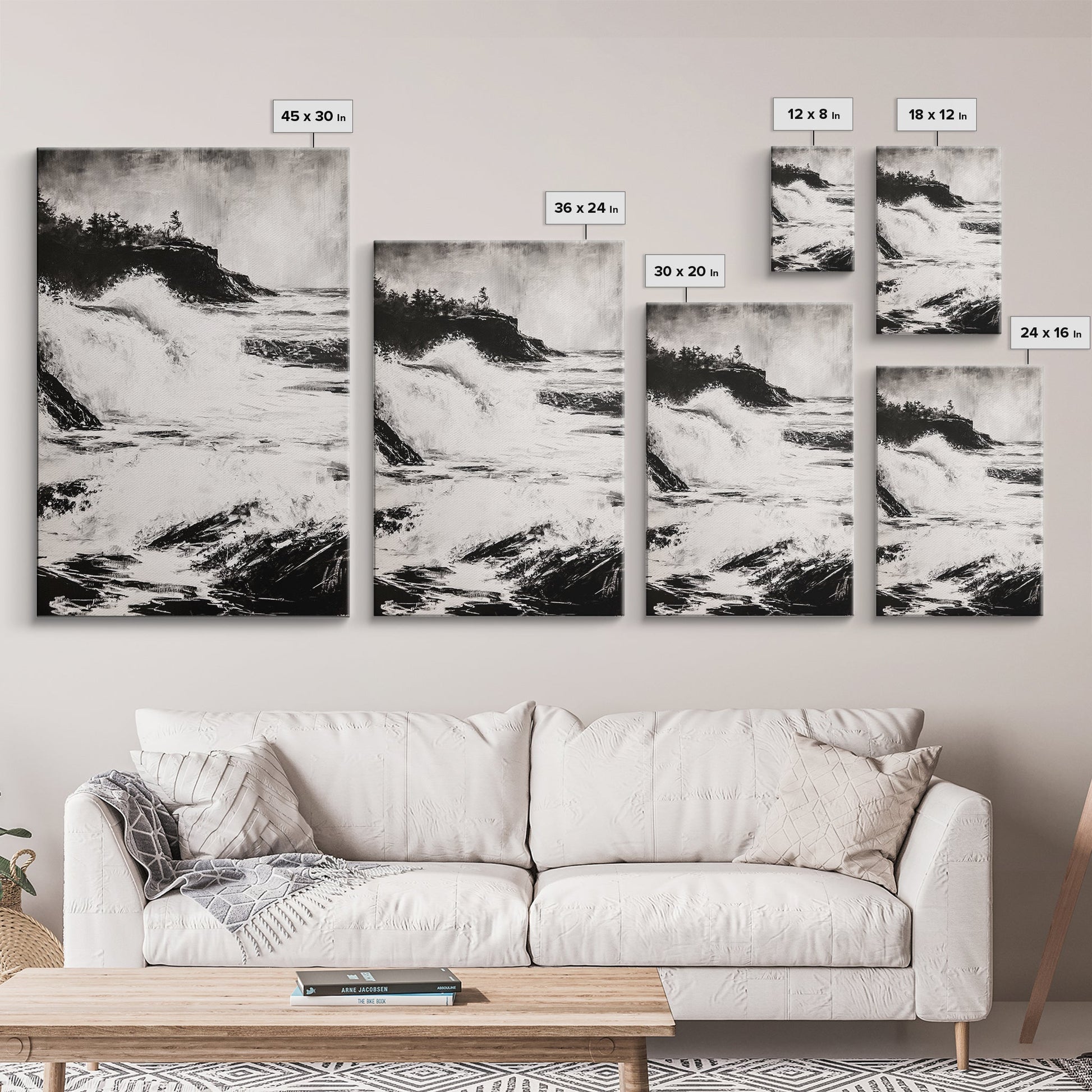 Ocean Waves, Seascape Painting, Framed Canvas Print, Beach House Decor, Nautical Wall Art, Black and White Art, Coastal Living Room